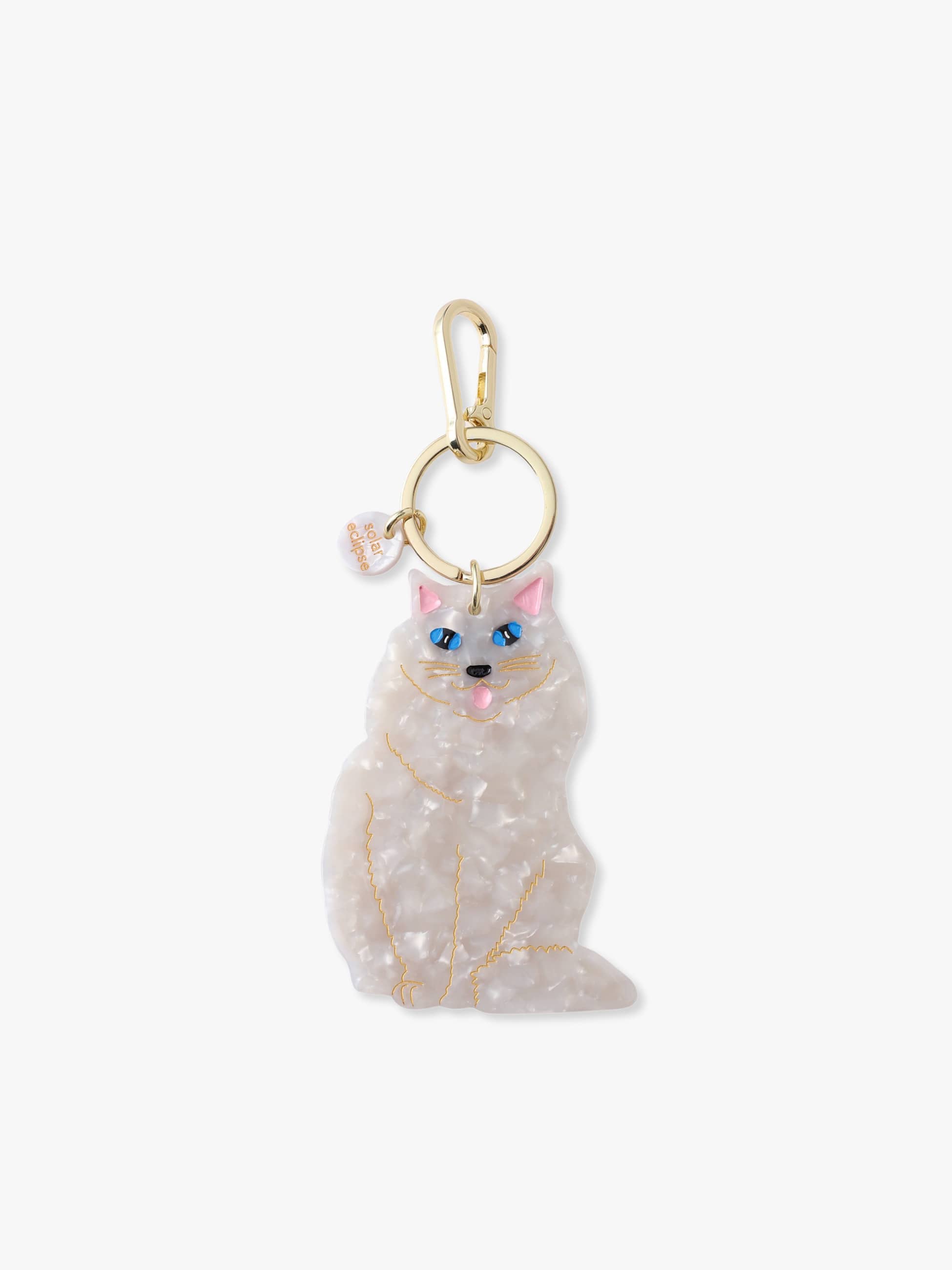 solar eclipseオリジナルデザインのペルシャンキャットバッグチャームです。両面手描きのデザインで、どの角度から見ても美しく、バッグやキーを華やかに演出します。再生木材パルプ由来の生分解性アセテートを使用し、耐久性も抜群です。多用途で遊び心あふれるアイテムです。