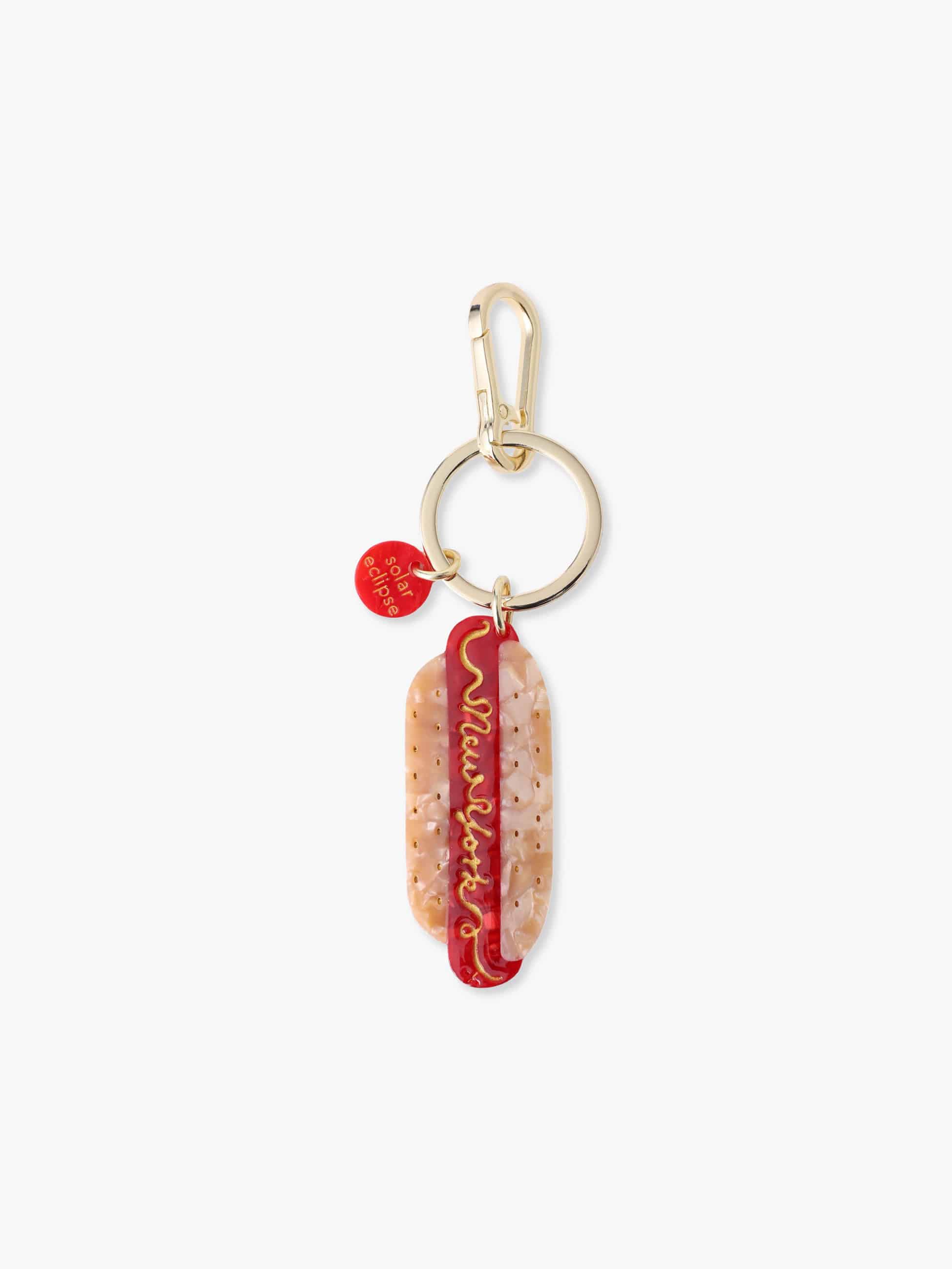 - solar eclipseオリジナルデザインのニューヨークホットドッグバッグチャームです。両面手描きのデザインで、どの角度から見ても美しく、バッグやキーを華やかに演出します。再生木材パルプ由来の生分解性アセテートを使用し、耐久性も抜群です。多用途で遊び心あふれるアイテムです。