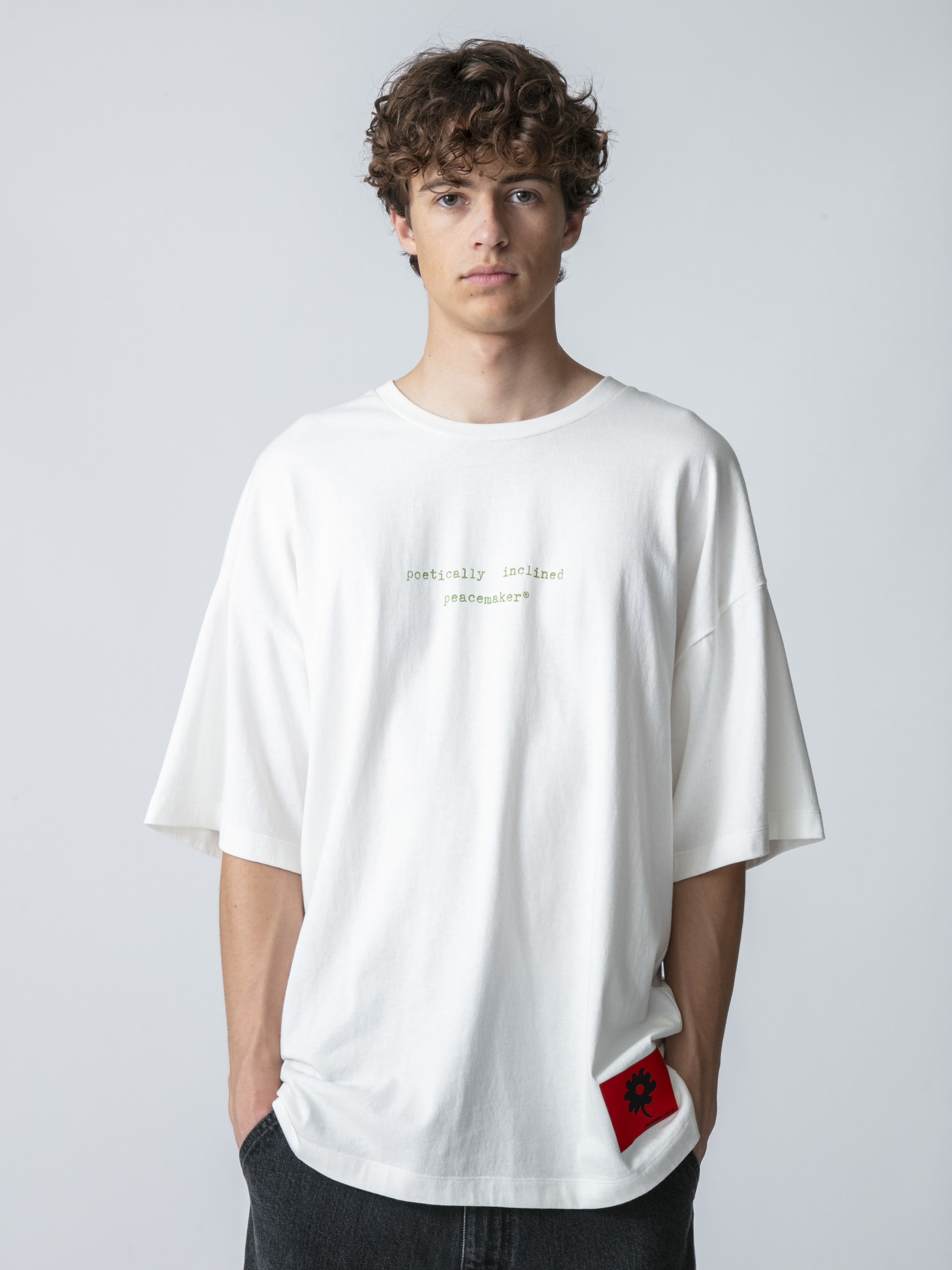 - ヘビーウェイトのコットン素材を使用したTシャツは、フロントのメッセージとバックに配された特徴的なグラフィックや裾に配したオリジナル織りラベルがアクセントになっています。ゆったりとしたルーズフィットは、コーディネートの主役になる一着です。