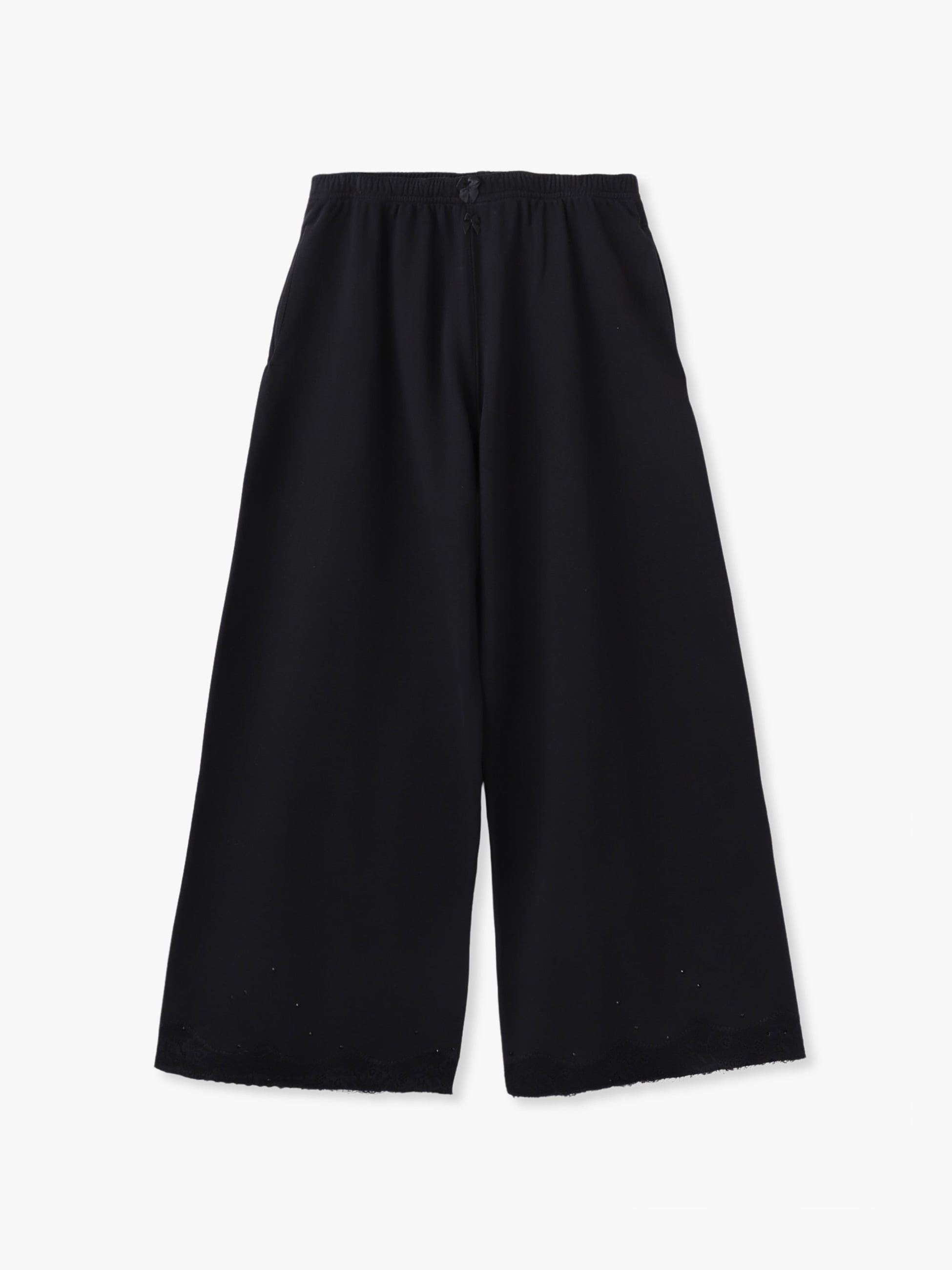 - ストレートなワイドシルエットのスウェットパンツは、裾にヴィンテージのフランス製レースとラインストーンがあしらわれたフェミニンな雰囲気が印象的で、コーディネートに個性をプラスします。裏毛素材でシーズンレスに着用いただけ、伸縮性のあるウエストバンドが快適な着心地も兼ね備えています。