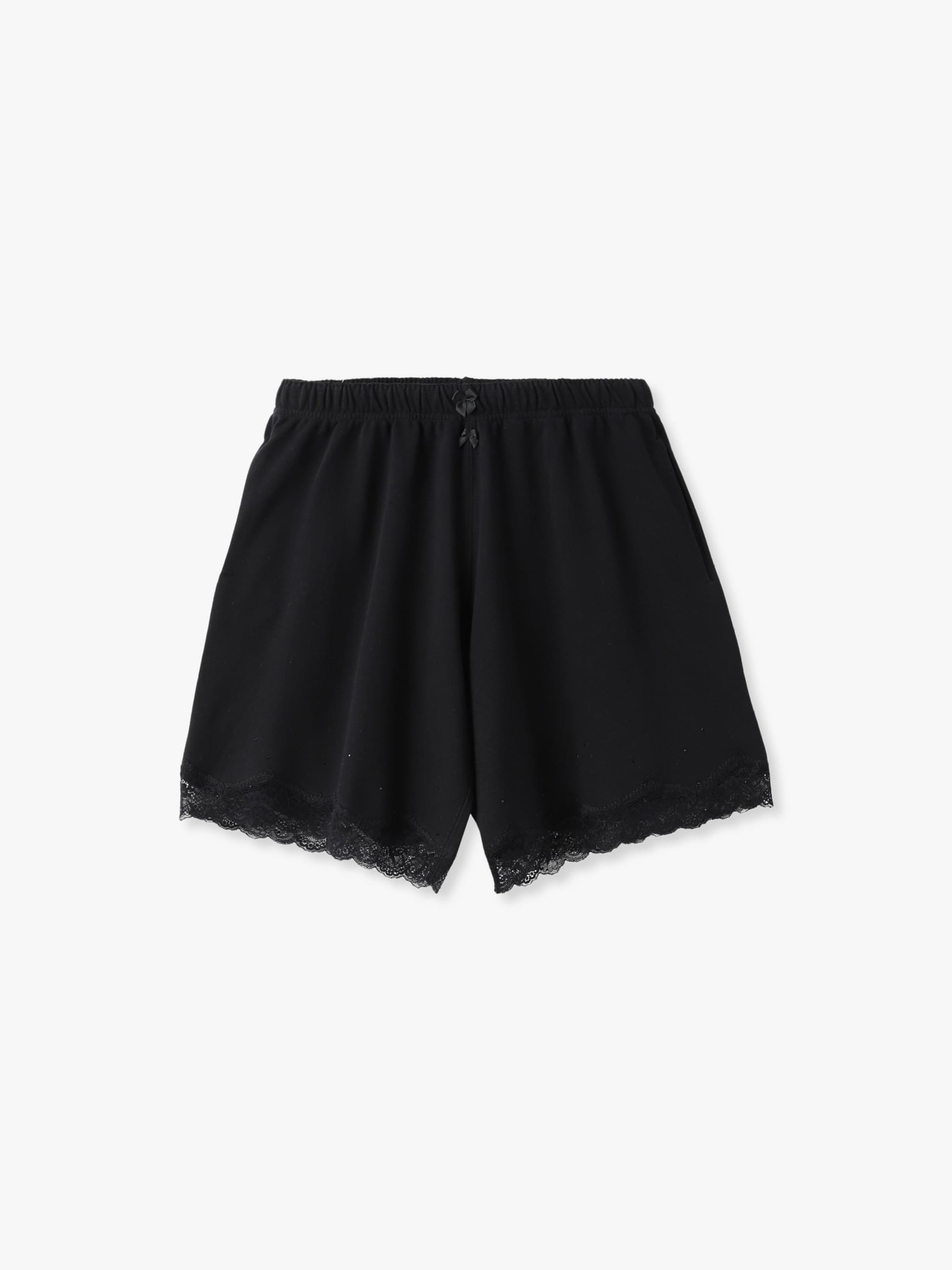 レギュラーフィットのスウェットショーツは、裾にヴィンテージのフランス製レースとラインストーンがあしらわれたフェミニンな雰囲気が印象的で、コーディネートに個性をプラスします。膝上丈が軽やかで、伸縮性のあるウエストバンドが快適な着心地も兼ね備えています。