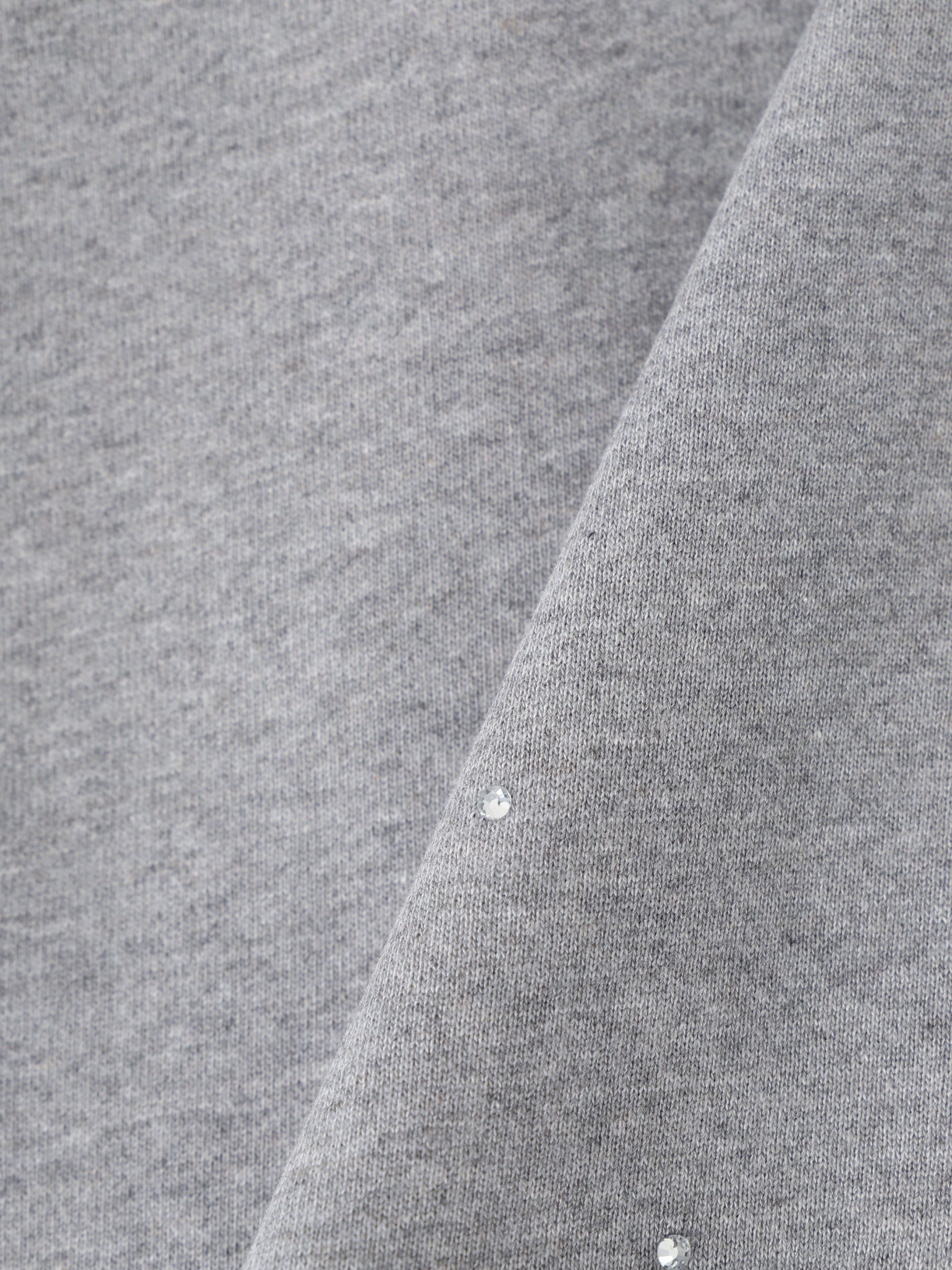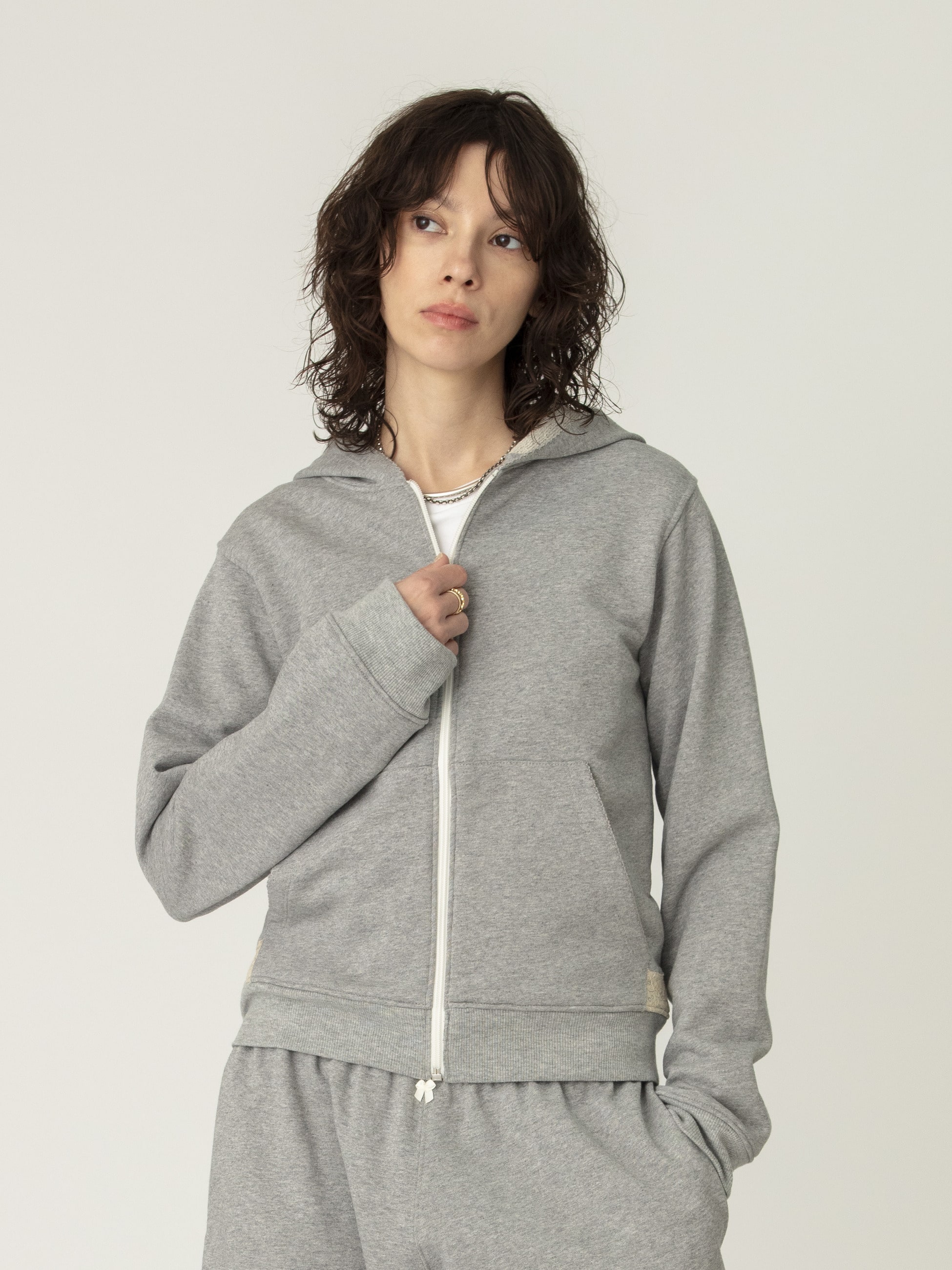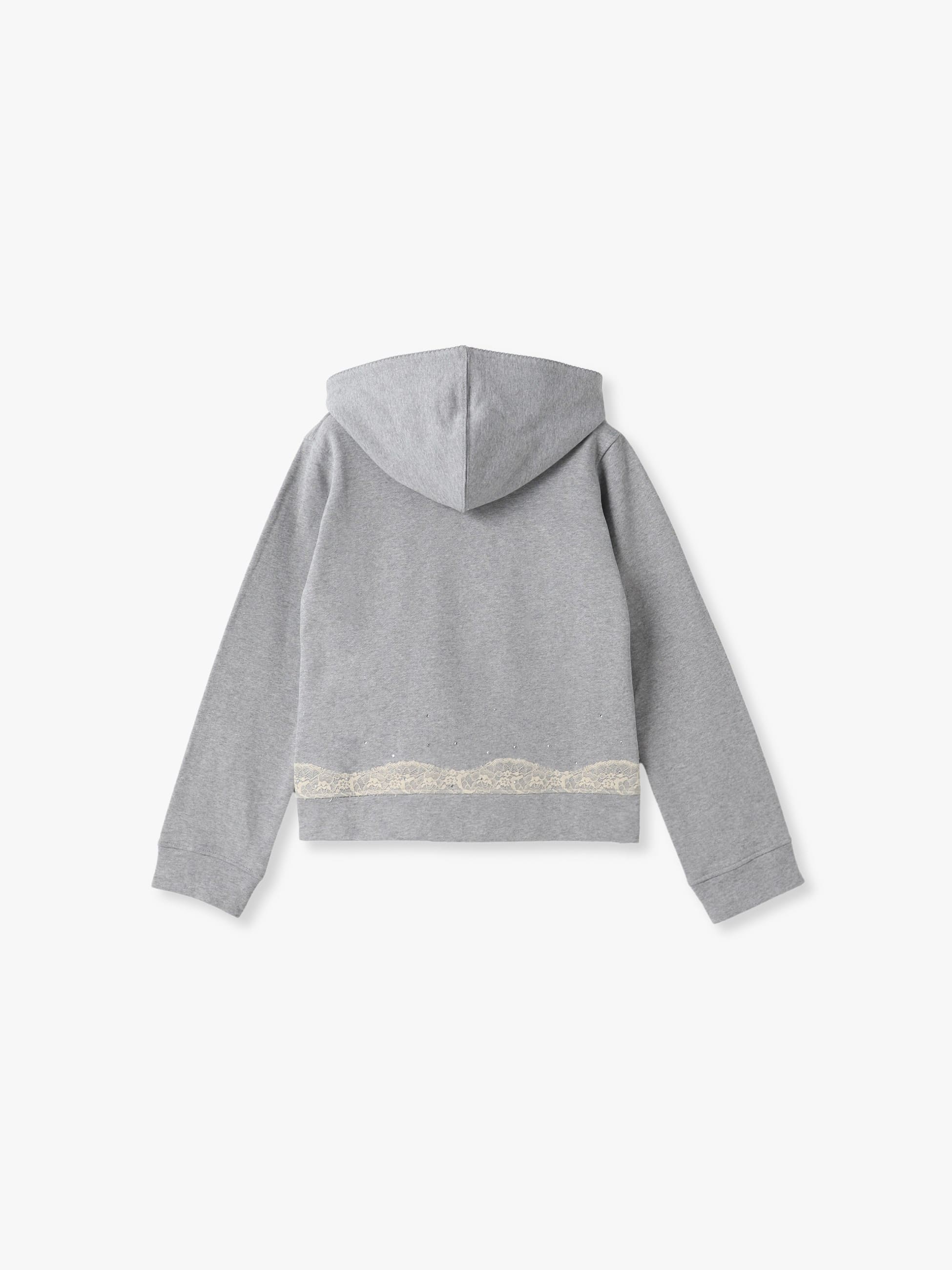ジップアップのフーディーは、裾に繊細なレースとラインストーンのディテールが施され、裏毛の心地良い肌触りとデザイン性とを兼ね備えています。コンパクトなサイジングでカジュアルになりすぎず、女性らしいボトムと合わせたり、ドレスの羽織りとしてもおすすめです。