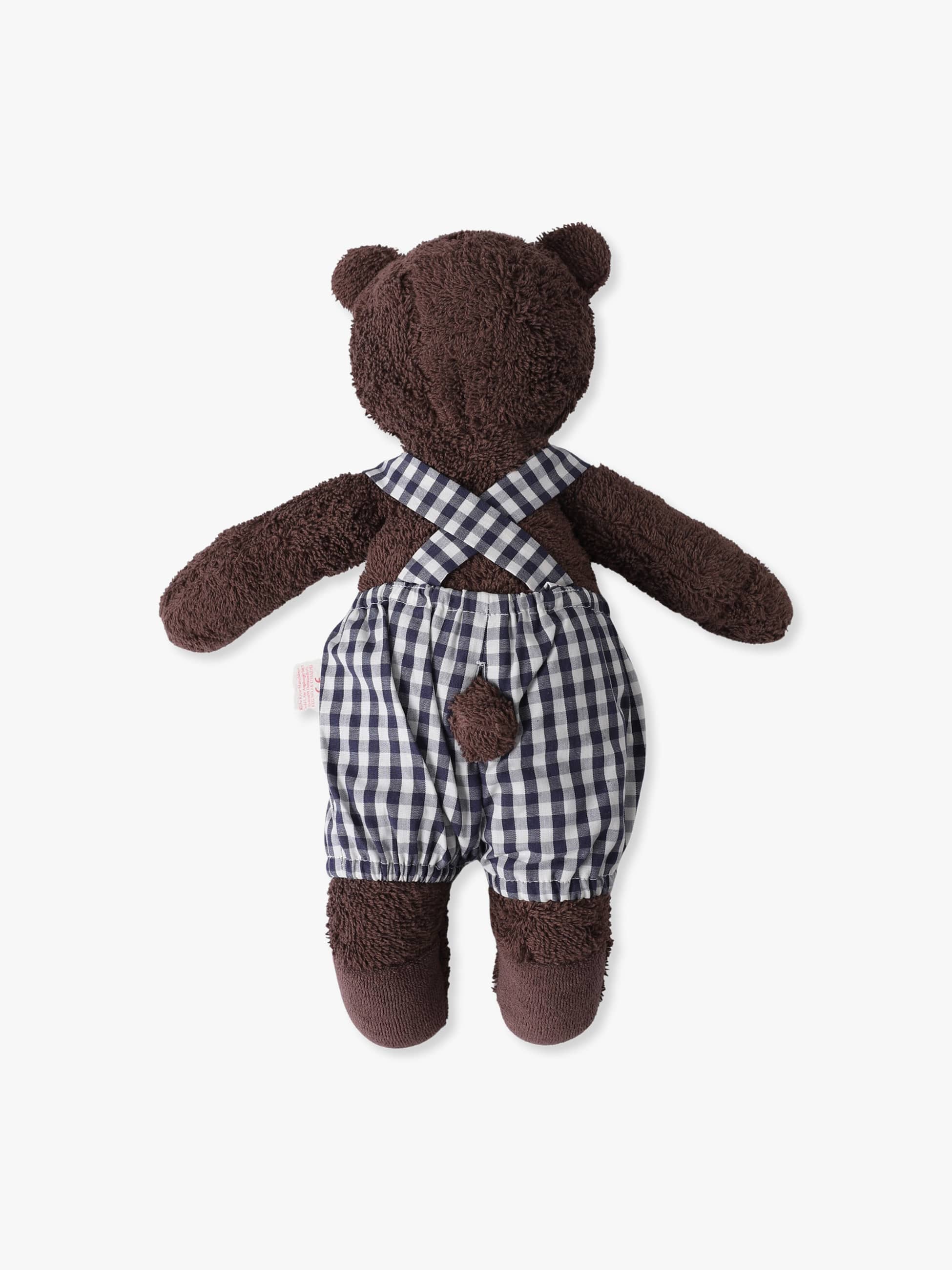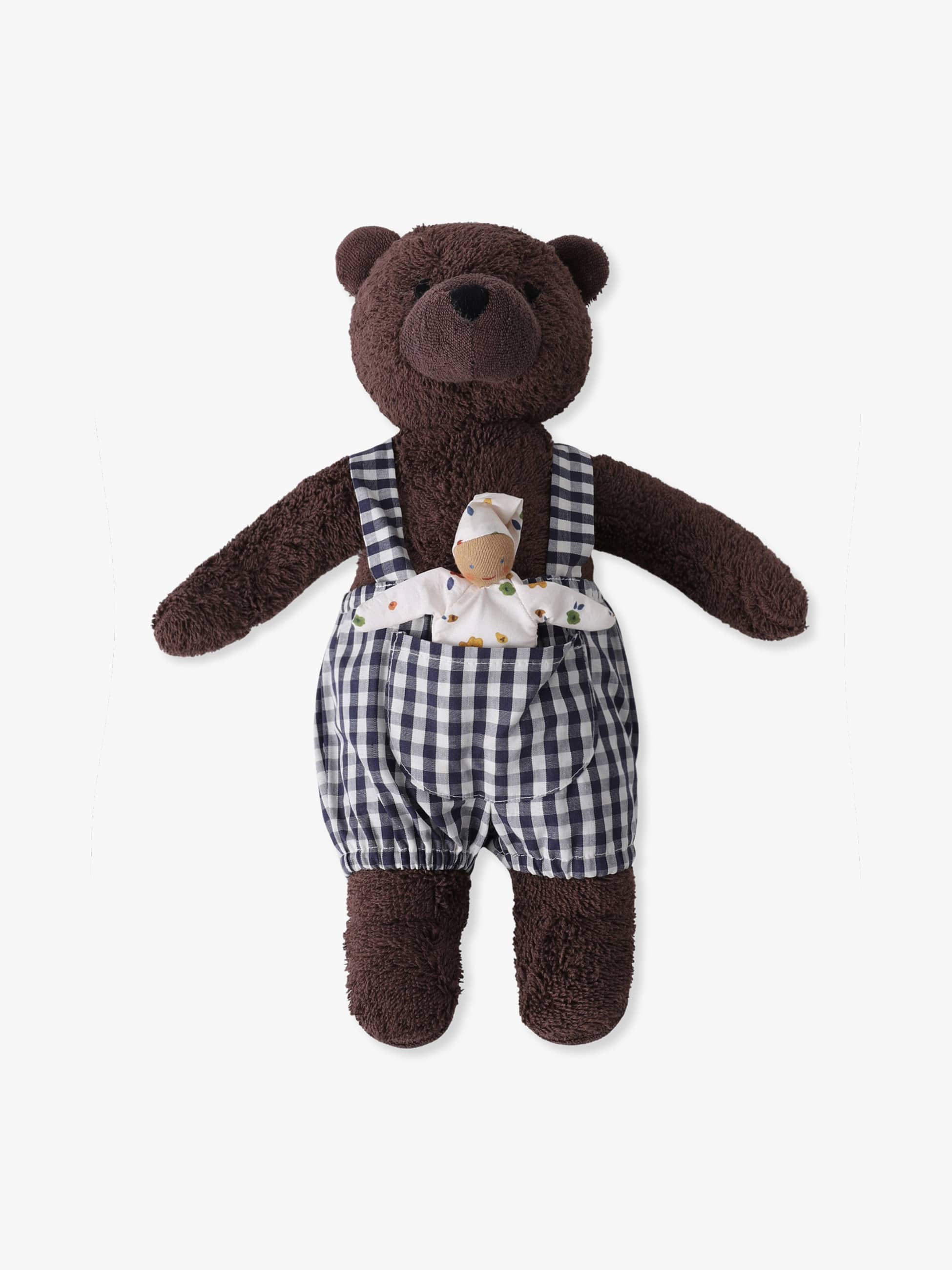 おなかのポケットに赤ちゃん人形をそっと抱えた、お母さんクマのソフトトイは、 クラシックなギンガムチェックのオーバーオールに身を包み、どこか懐かしくあたたかい印象です。 コットン素材のため、やわらかな風合いとぬくもりのある手ざわりが魅力です。ギフトにもおすすめのアイテムです。