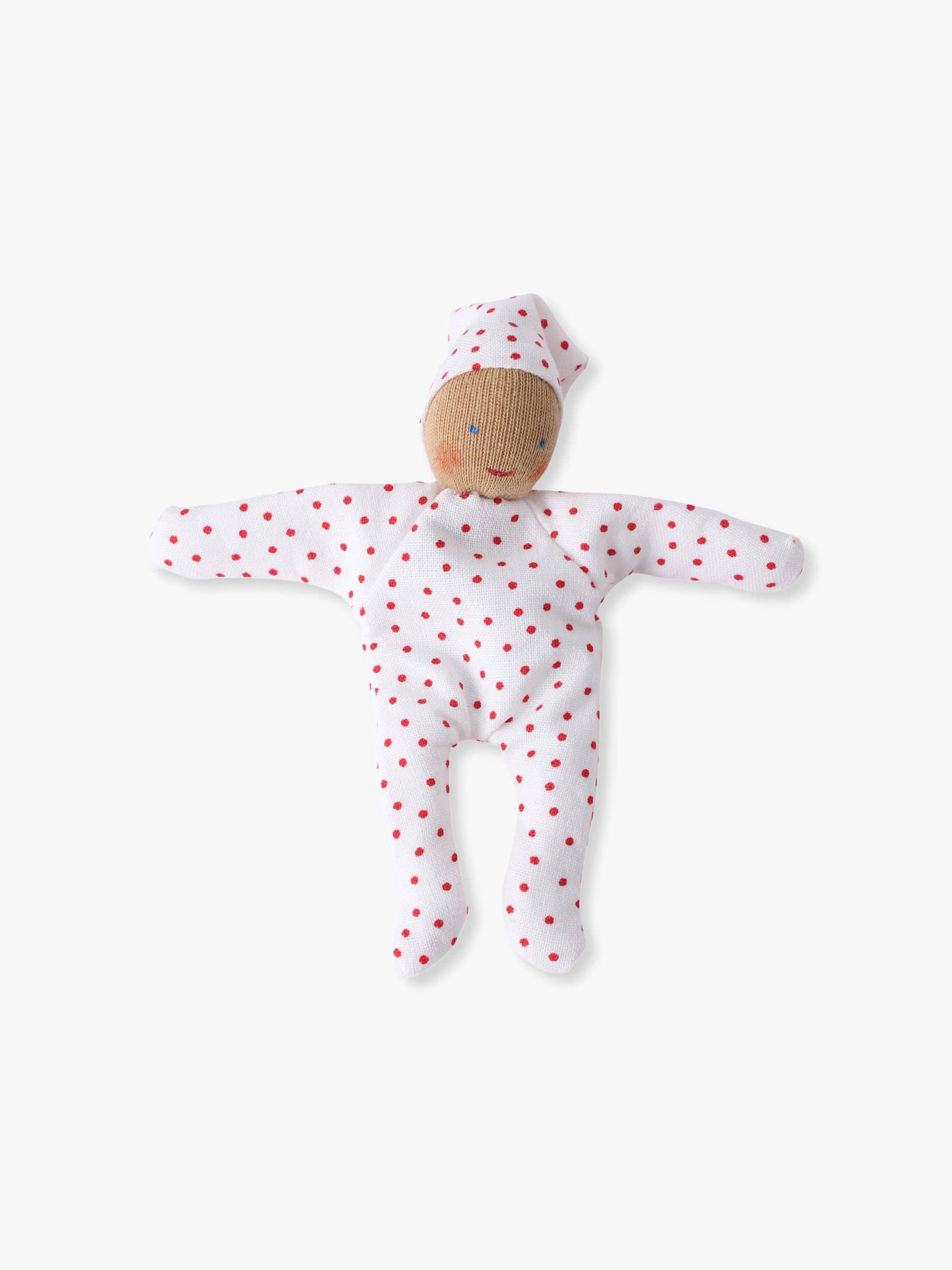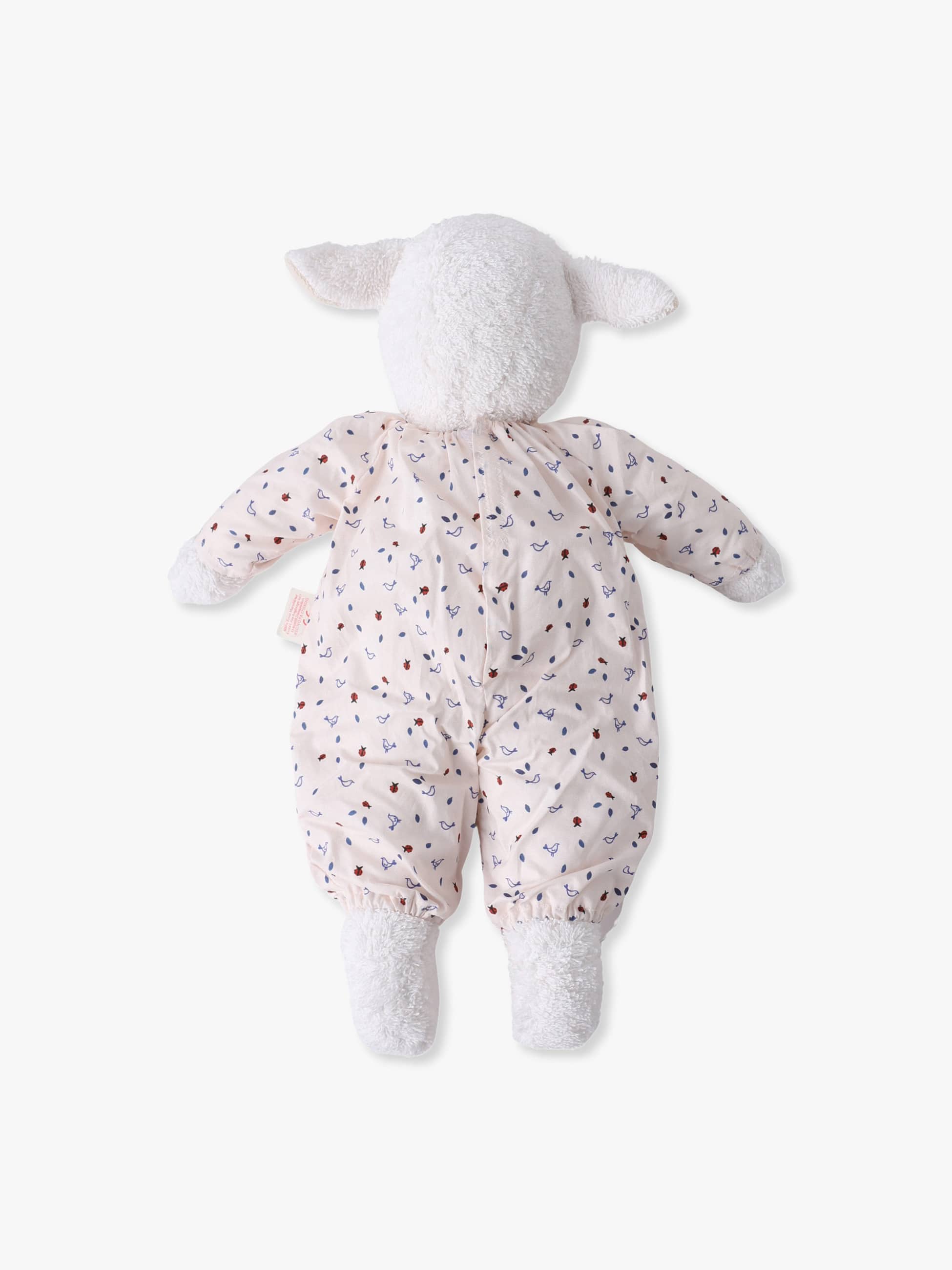 おなかのポケットに赤ちゃん人形をそっと抱えた、ヒツジのソフトトイは、テントウ虫があしらわれたオーバーオールも相まってキュートなアイテムです。ふわふわの毛並みには、肌ざわりの良いコットン生地を使用しており、小さなお子さまへのギフトにもおすすめです。