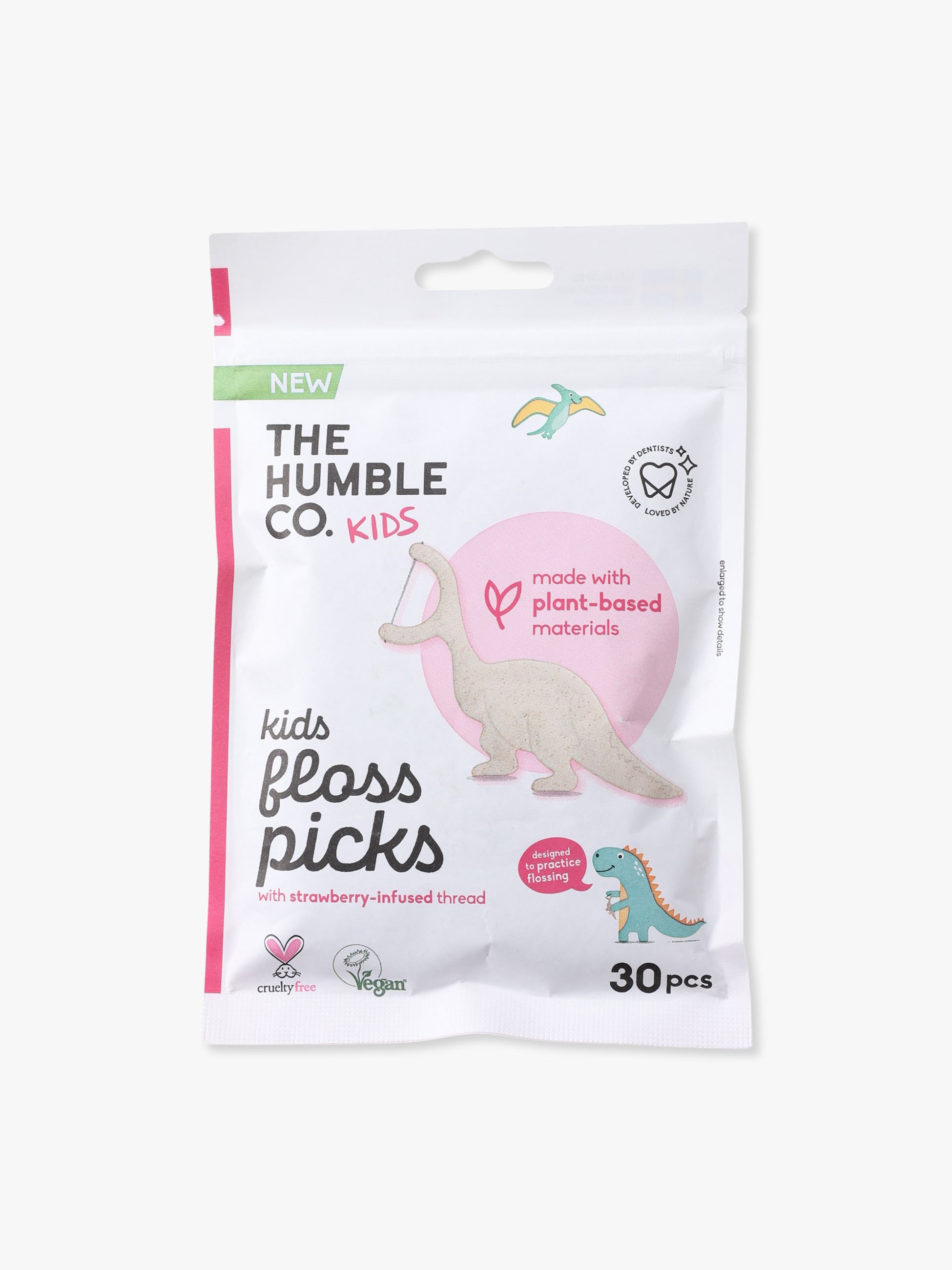 恐竜モチーフのキュートなデンタルフロスピックは、いちごフレーバーでキッズが楽しくフロスを習慣づけられるように設計されています。歯科医の指導・監督のもと製造されており、フロスの糸は滑らかで丈夫、破れにくいポリエチレン製で、エッジは丸みを帯びています。フロスピックのハンドルは、植物由来素材とポリプロピレンのミックス素材を使用し、洗って繰り返し使えるため環境に配慮されております。