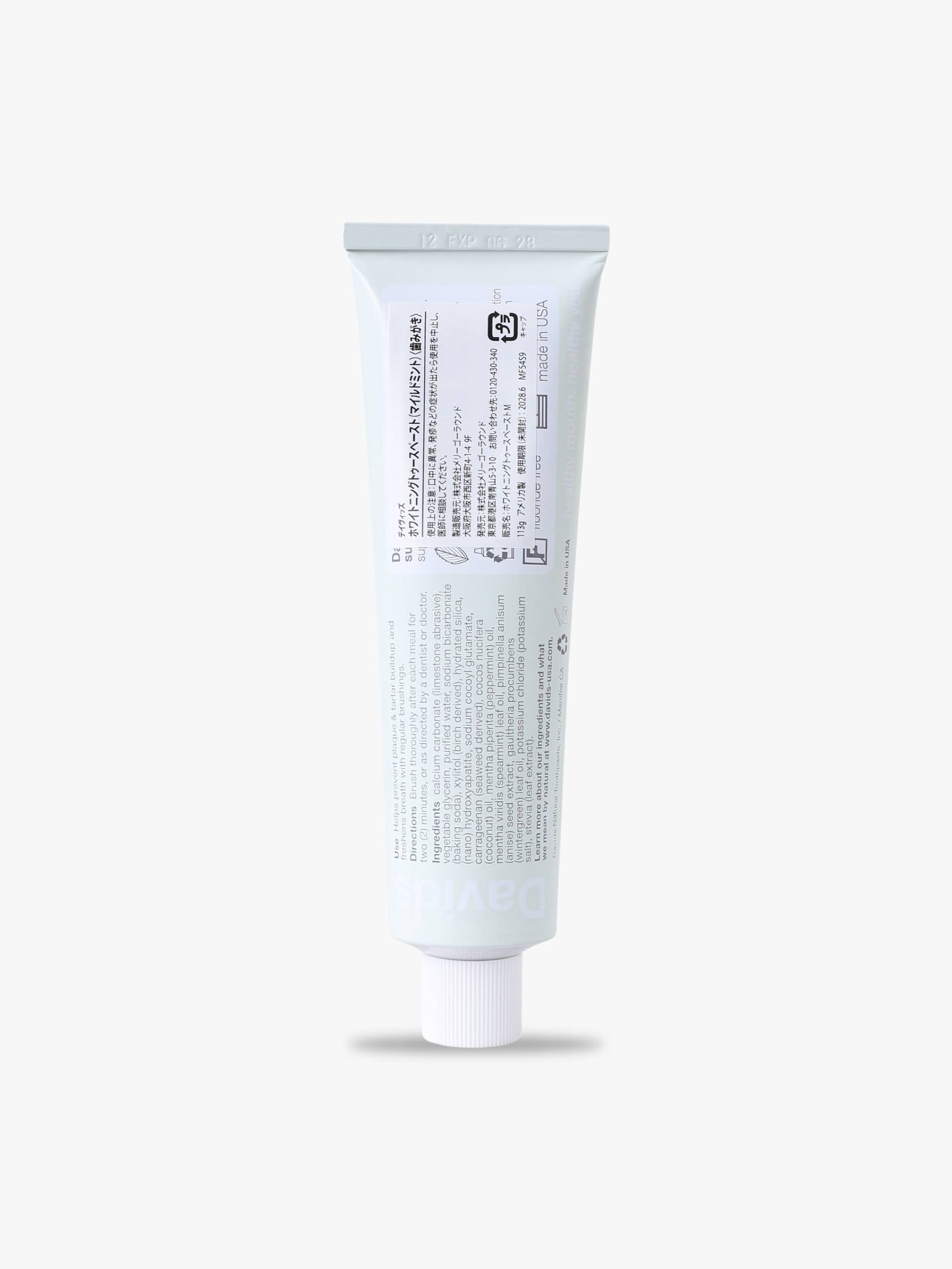 - 炭酸Ca、ク?リセリン/大豆由来、水、炭酸水素Na、キシリトール/樺の木由来、含水シリカ、ココイルク?ルタミン酸Na/ヤシ油由来、カラキ?ーナン/海藻由来、スヘ?アミント油、セイヨウハッカ油、タ?イウイキョウ油、ヒ?ターオレンシ?果皮油、ステヒ?ア葉/茎
