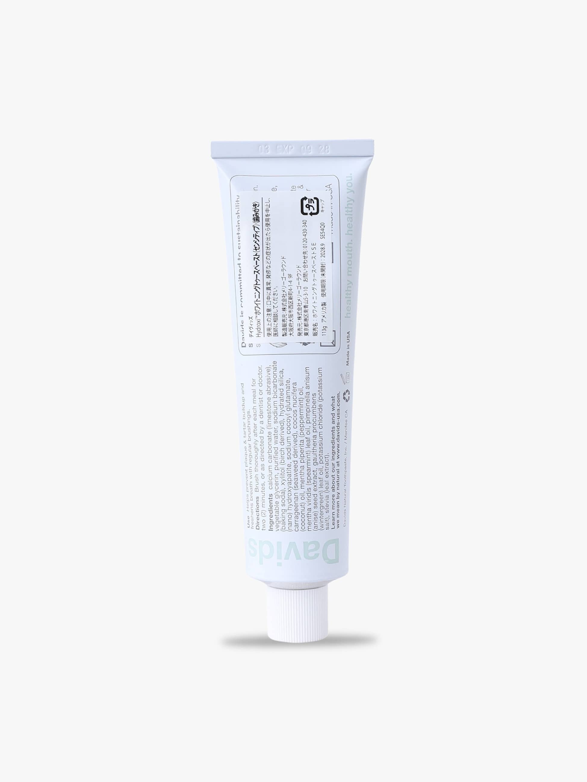- 炭酸Ca、グリセリン/大豆由来、水、炭酸水素Na、キシリトール/樺の木由来、含水シリカ、ヒドロキシアパタイト、ココイルグルタミン酸Na/ヤシ油由来、カラギーナン/海藻由来、セイヨウハッカ油、スペアミント油、アニス種子エキス、ヒメコウジ葉油、ステビア葉/茎