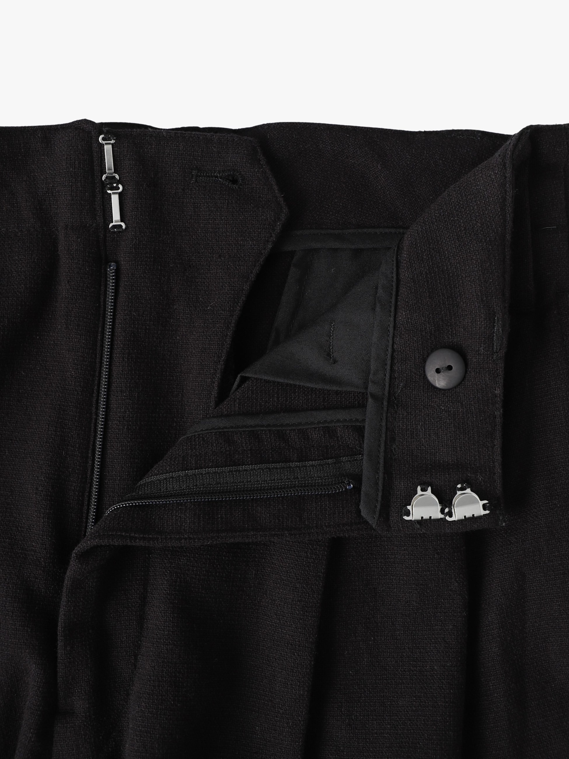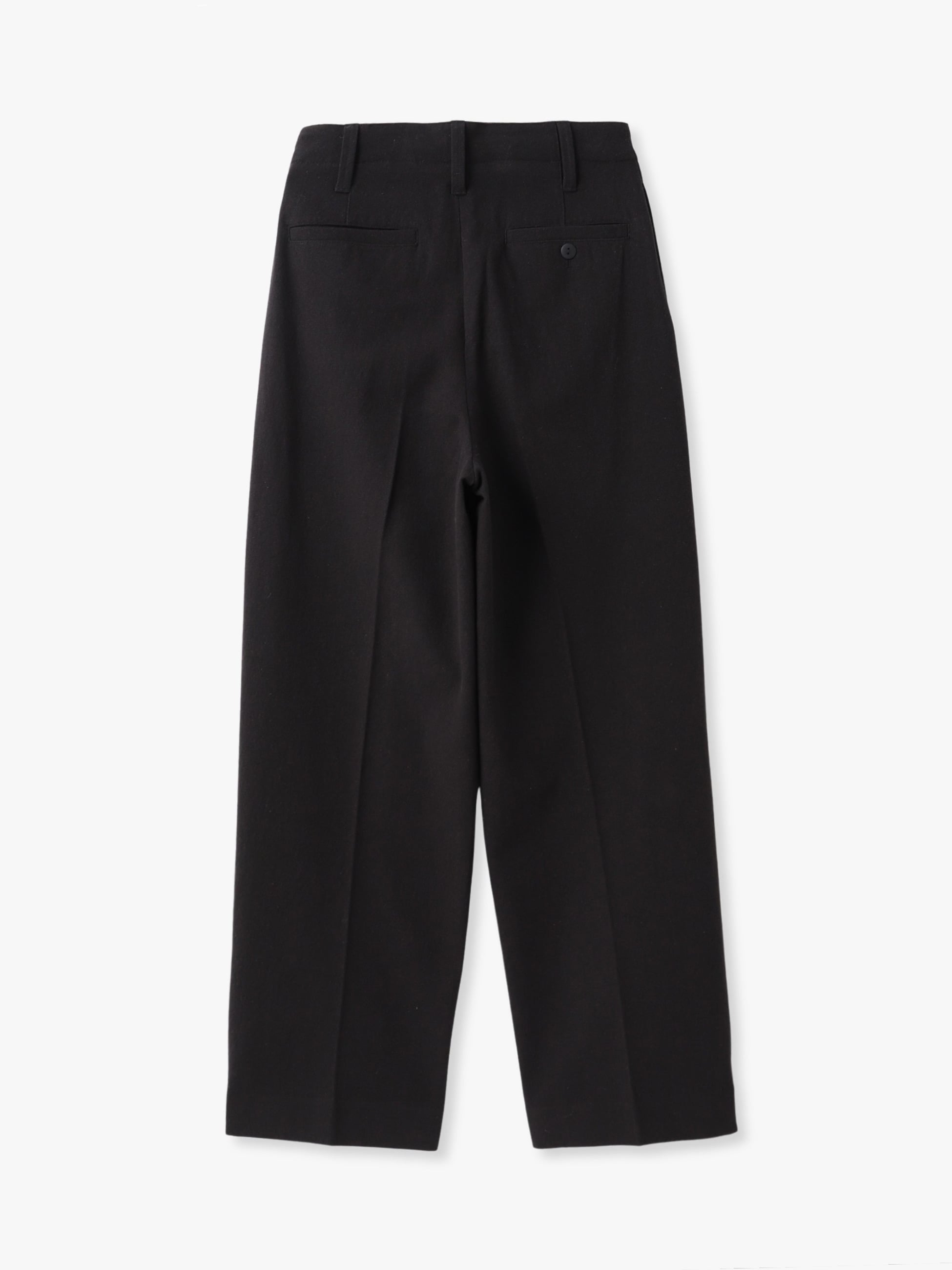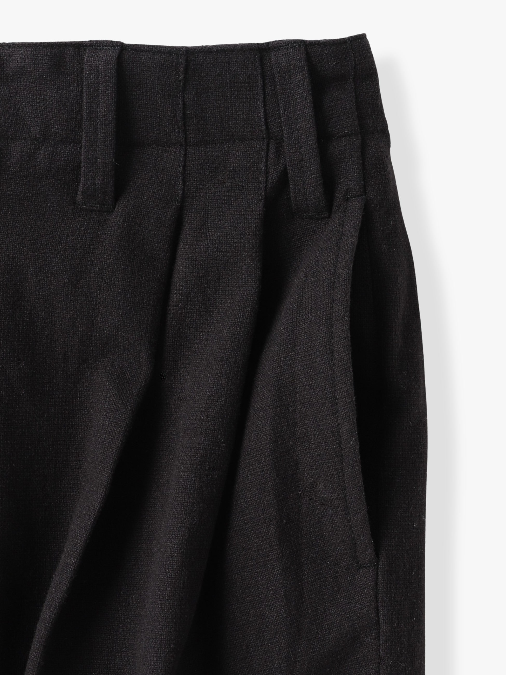 ハイウエストのテーパードパンツは、程よいハリ感とタックにより、ゆったりとした立体的なシルエットが優美な雰囲気を醸し、センタープレスが綺麗めなエッセンスをプラスします。シックなブラックカラーは汎用性も高く、デイリーユースしやすいアイテムです。