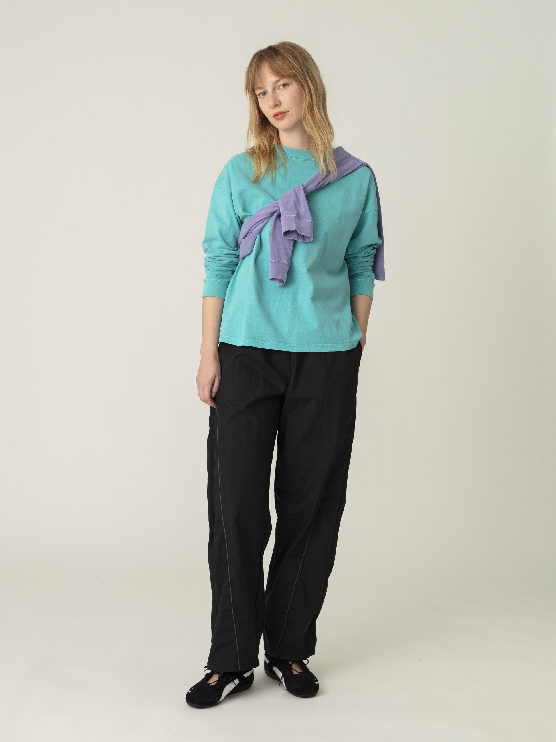 コレクション展開しているトラックパンツをベースに、自然なシワ感とナチュラルな風合いが特徴のワッシャーナイロン素材をセレクトし、女性らしく穿いていただけるシルエットに調節した特別なパンツを、RHC ロンハーマンで別注しました。やや長めに設定した着丈で、あえてルーズに穿いたり、裾のドローコードで絞って調節し、スタイルに合わせて着こなしをお楽しみいただけます。同シリーズのブルゾンとセットアップでも着用いただけます。