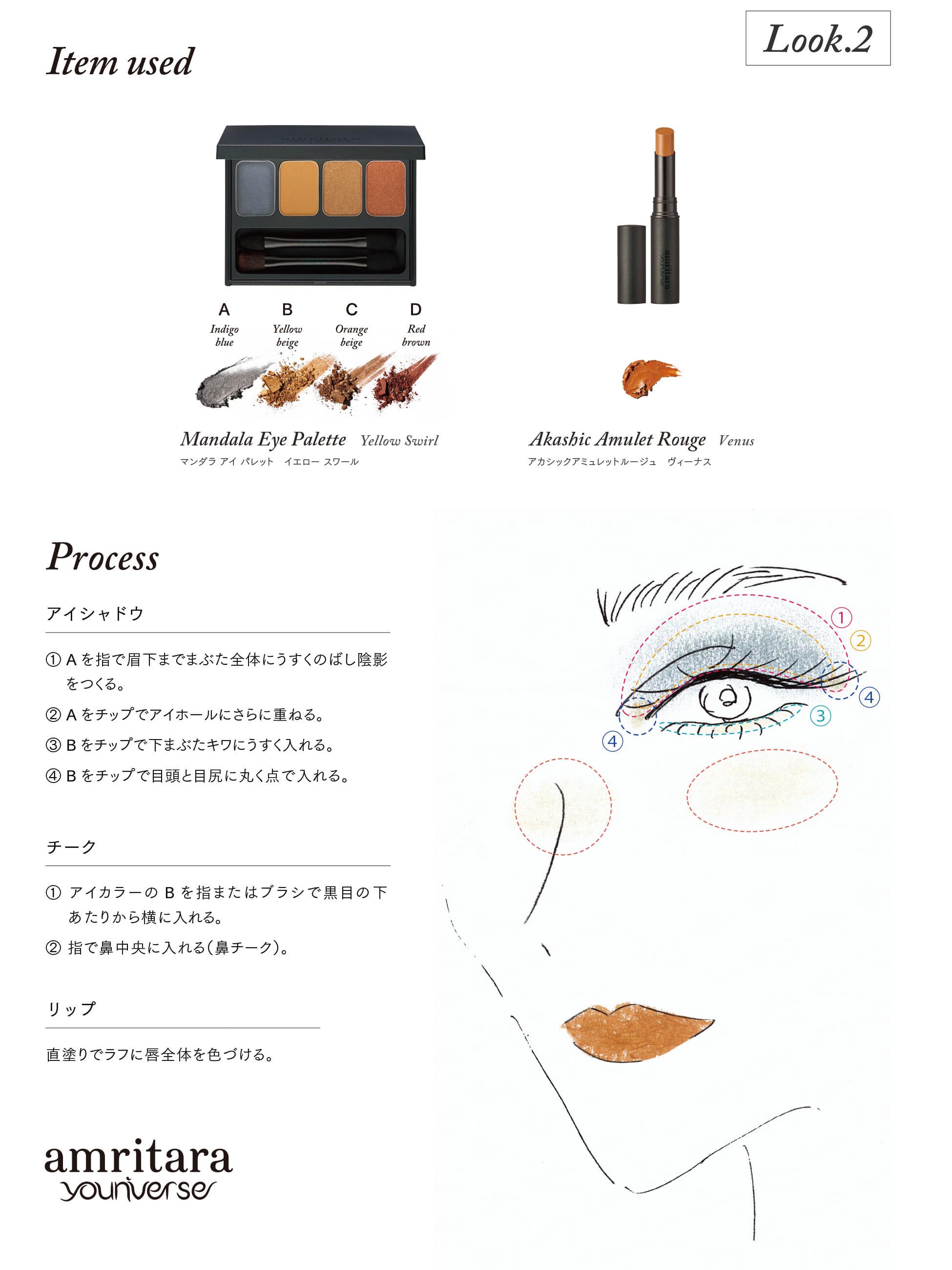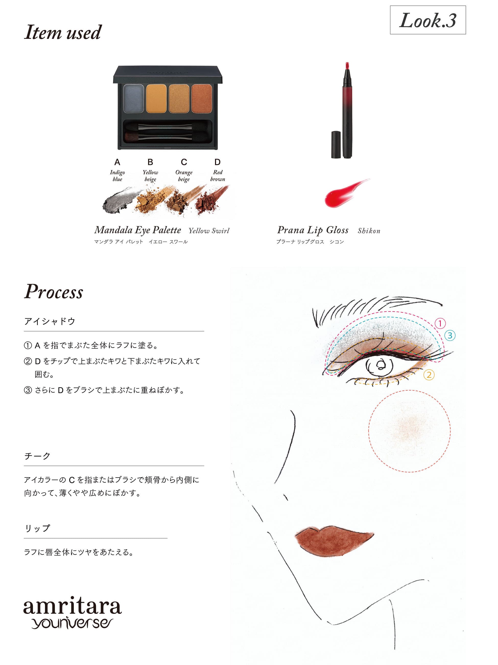 レッドブラウン・オレンジベージュ・イエローベージュの3色パウダーと、銀河のように深いインディゴブルーのクリームカラーを組み合わせた4色アイパレットです。出雲の薔薇「さ姫」、伊勢のシャクヤク、高野山の高野槙、宝石のアメジスト、藍の植物エキスなど、日本各地の自然素材が宿すエナジーをまなざしに纏わせます。やわらかな発色と奥行きのある陰影が、目元に静かな輝きをもたらし、自分らしい表情を引き出してくれます。