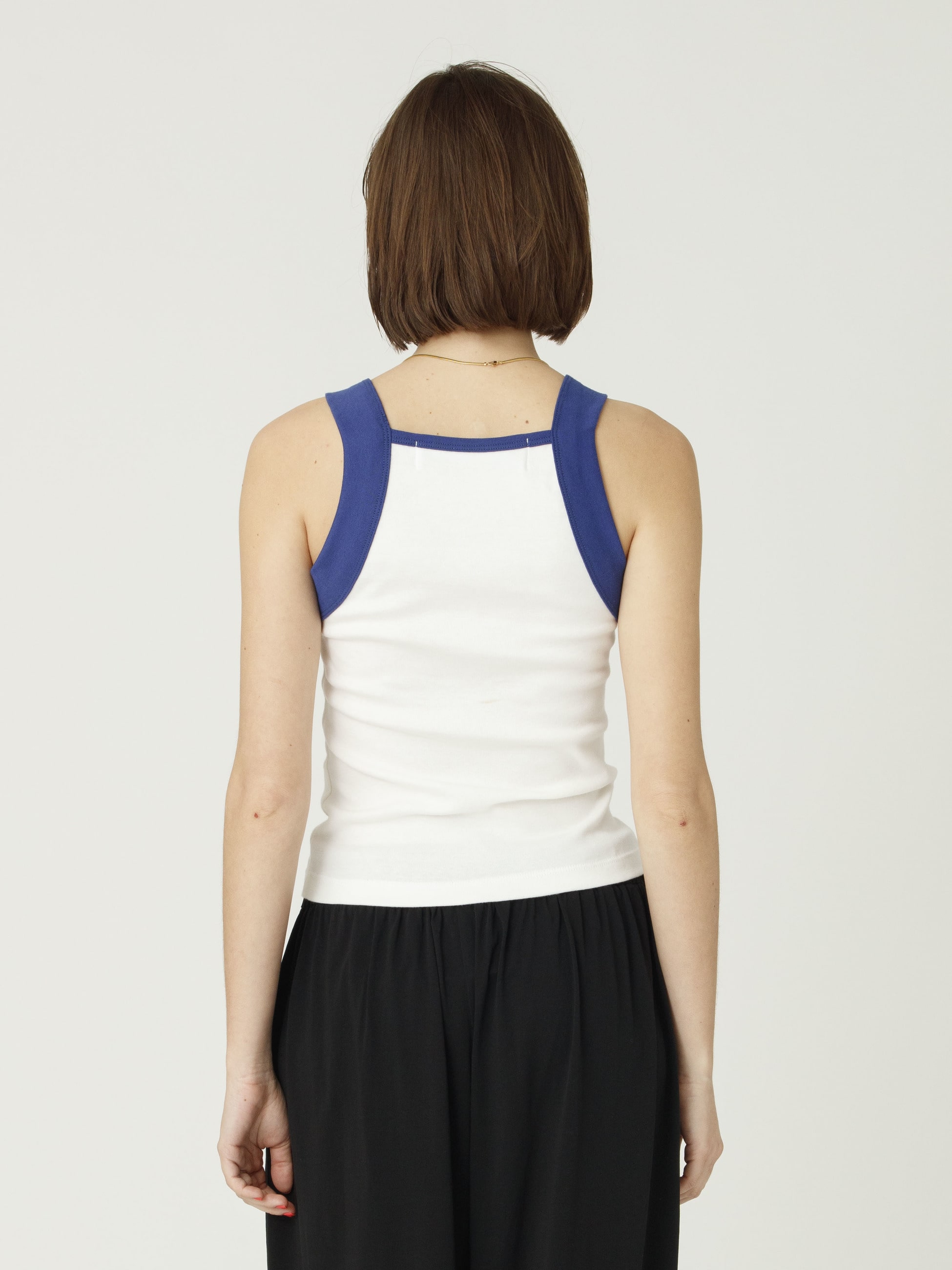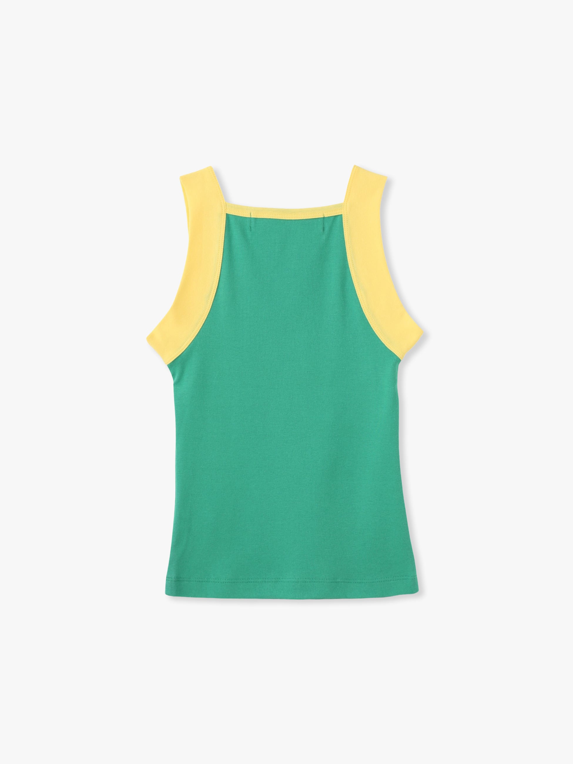 配色デザインのサマータンクトップは、綿100%のリブ素材を使用し、コンパクトなサイジングでありながらも心地良いフィット感が特徴です。シーズンムードが高まるヘルシーなアイテムです。