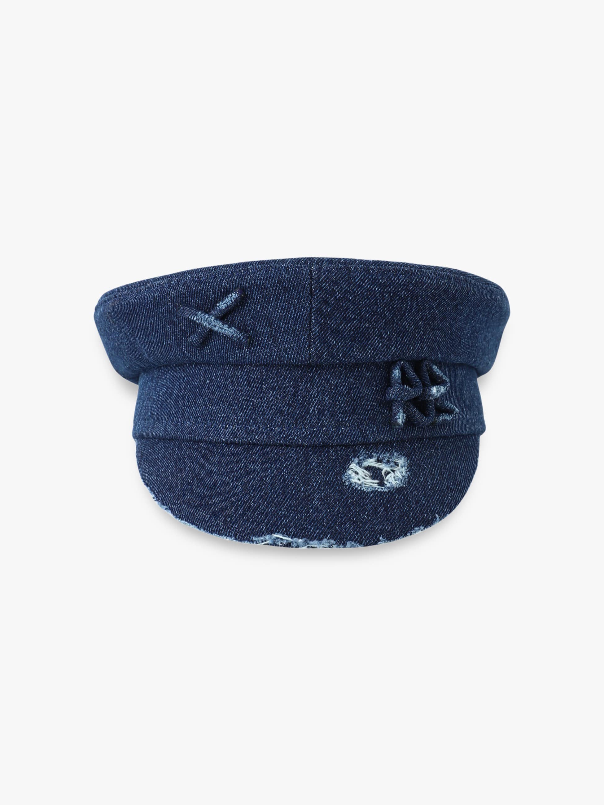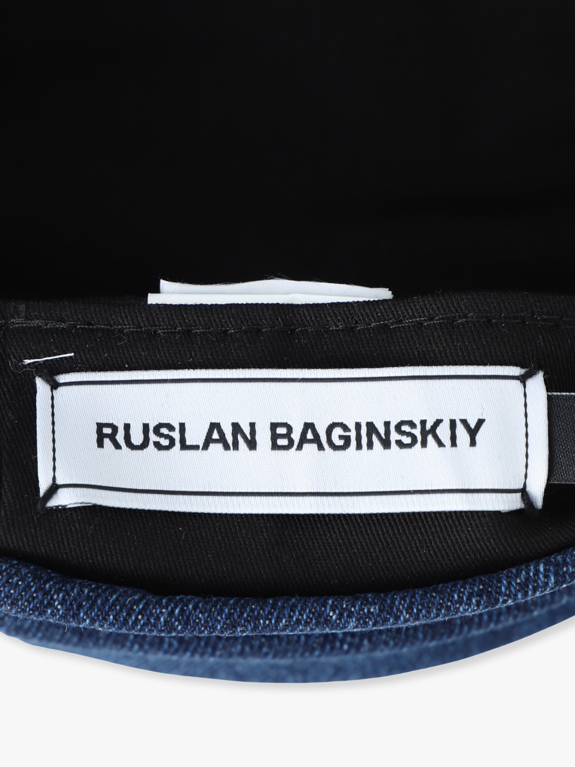 - Ruslan Baginskiyのベストセラーであるベイカーボーイキャップは、ブルーデニム素材を使用し、つばにダメージ加工が施されています。幾何学的なシルエットが構造的な魅力と印象的なアクセントを加えます。ブランドロゴ"RB"のモノグラムがあしらわれています。