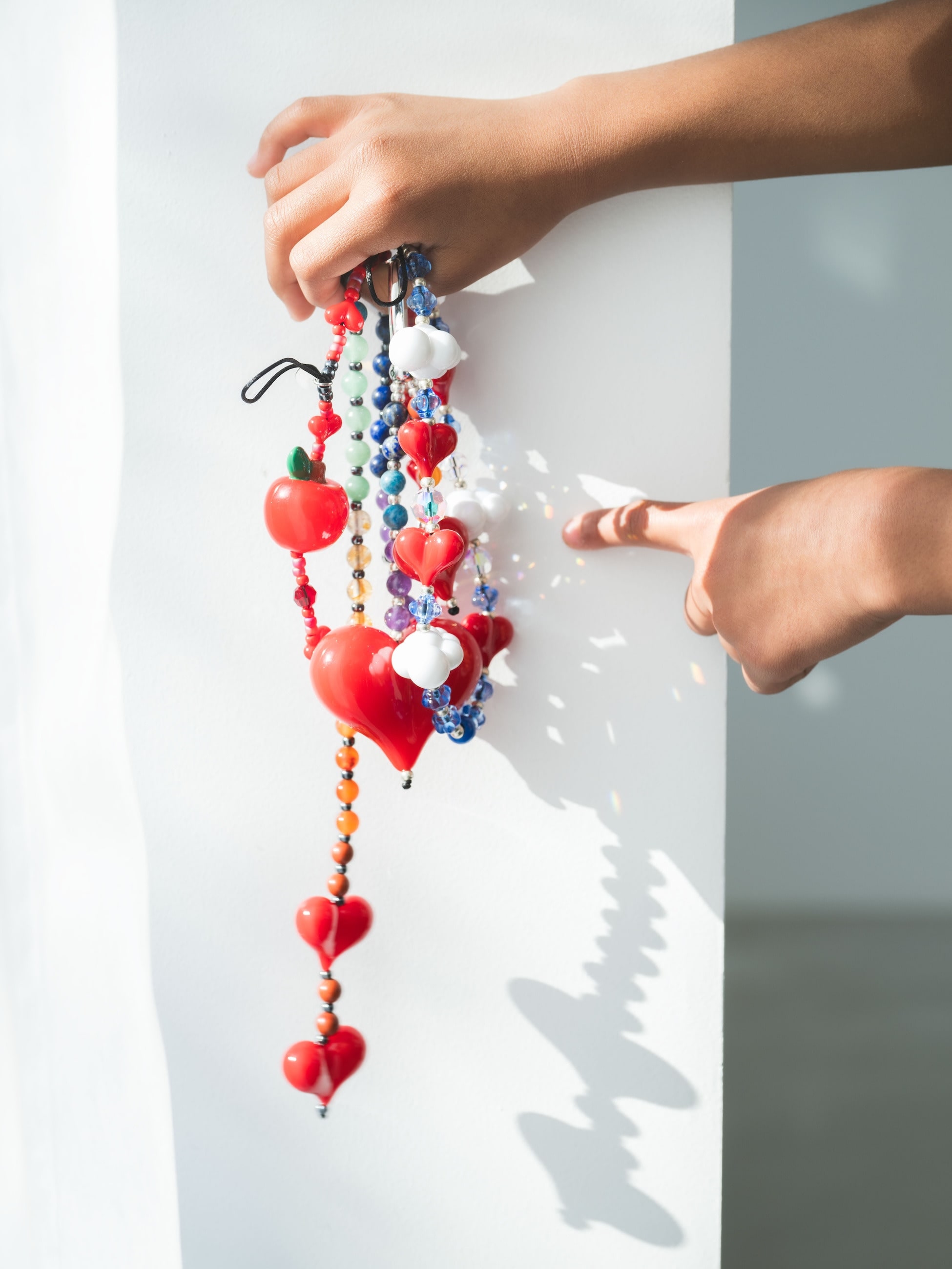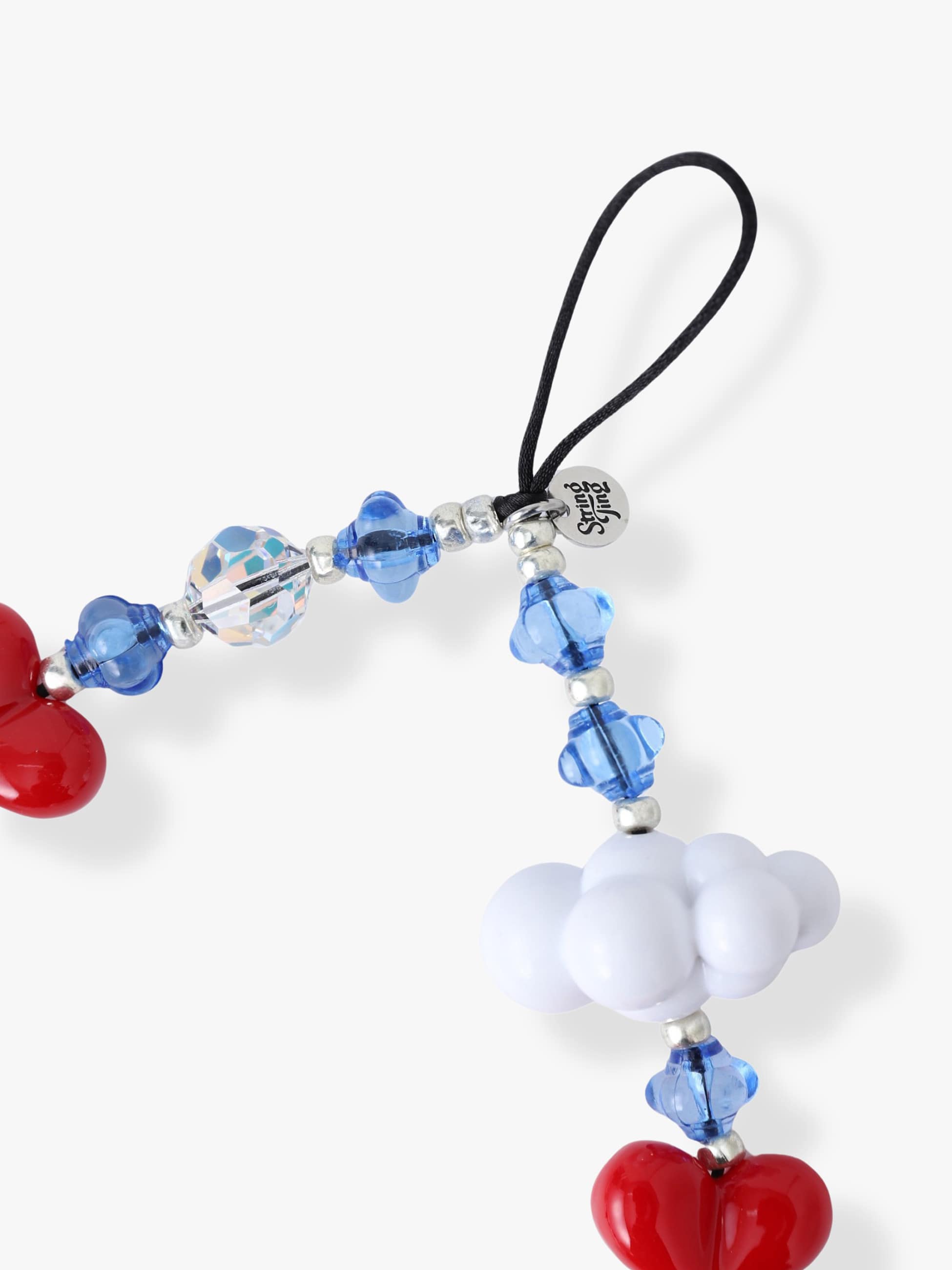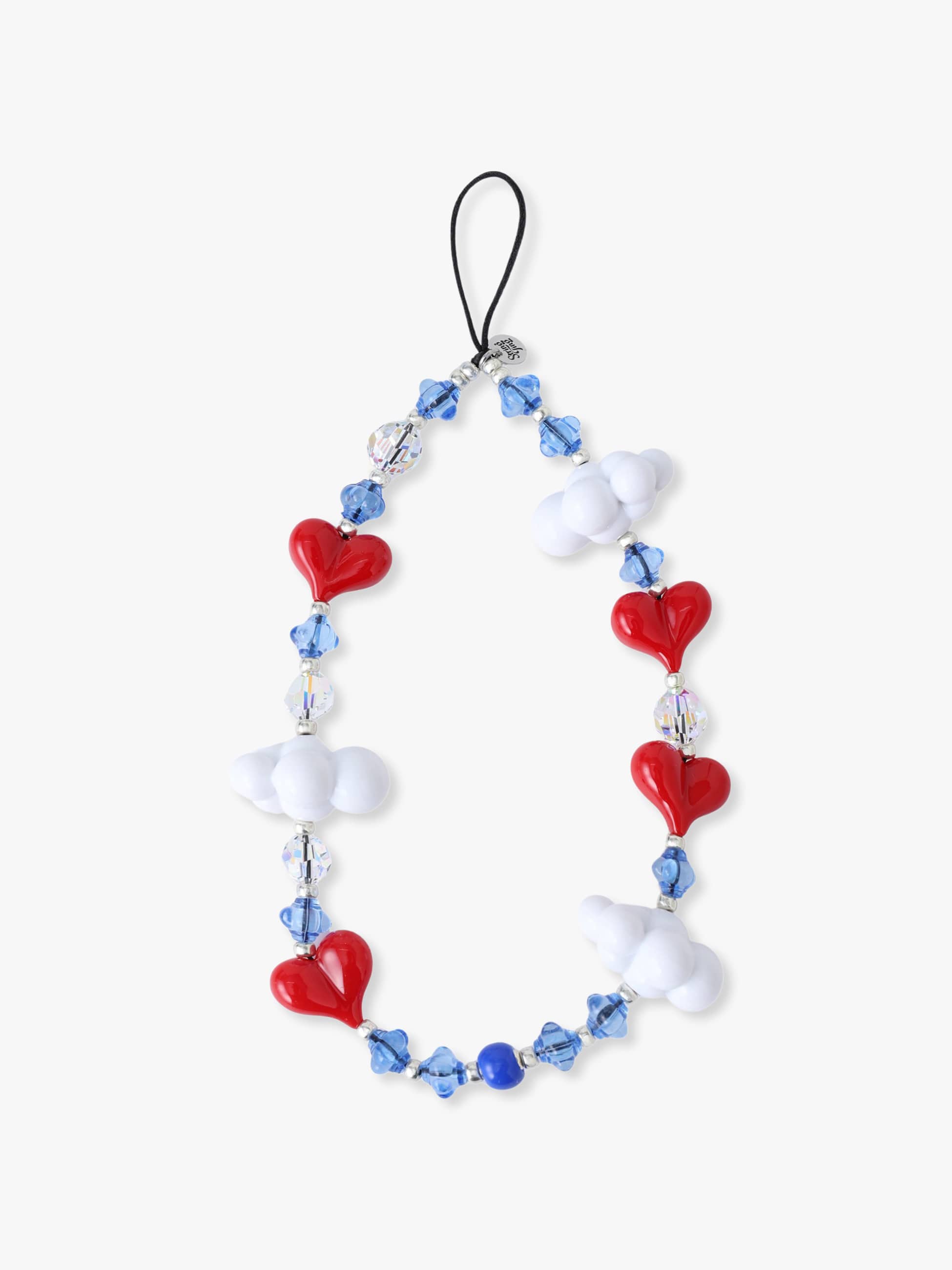 大粒の雲とハートのモチーフに、小ぶりなブルーとクリアのビーズを組み合わせた、とびきりキュートなストラップです。ロンドンで一つ一つ手作業で作られている、特別感のあるアイテムです。