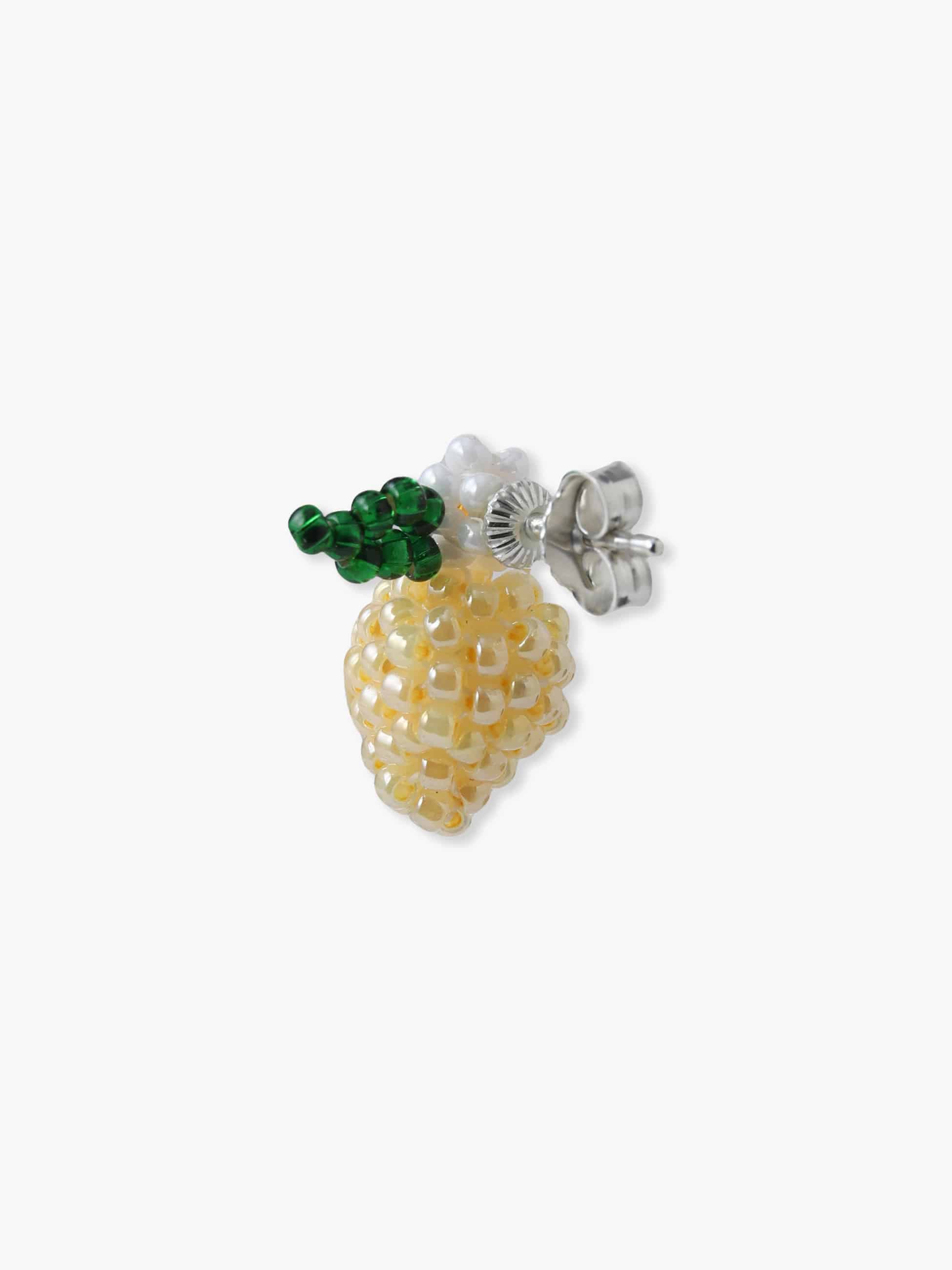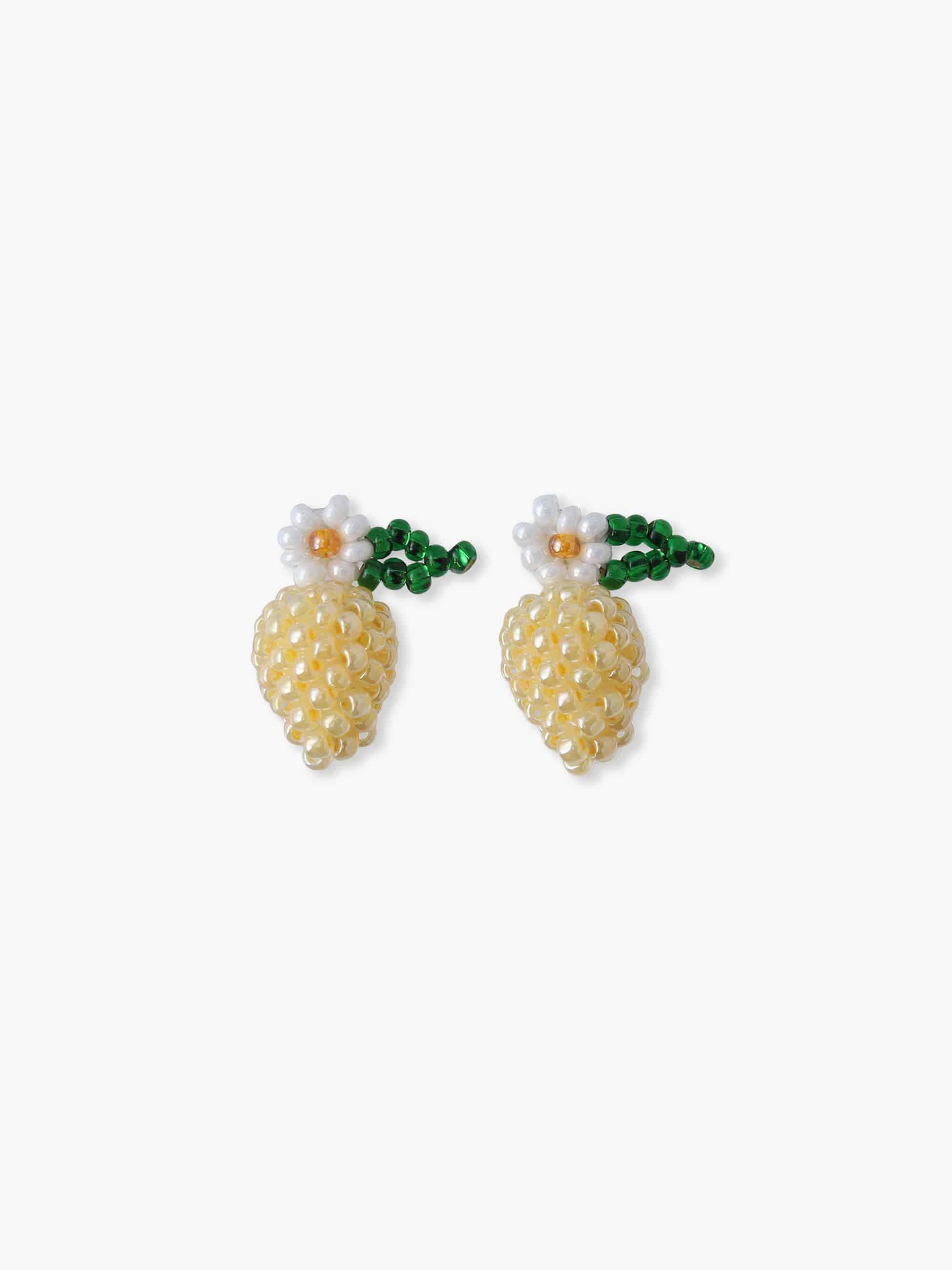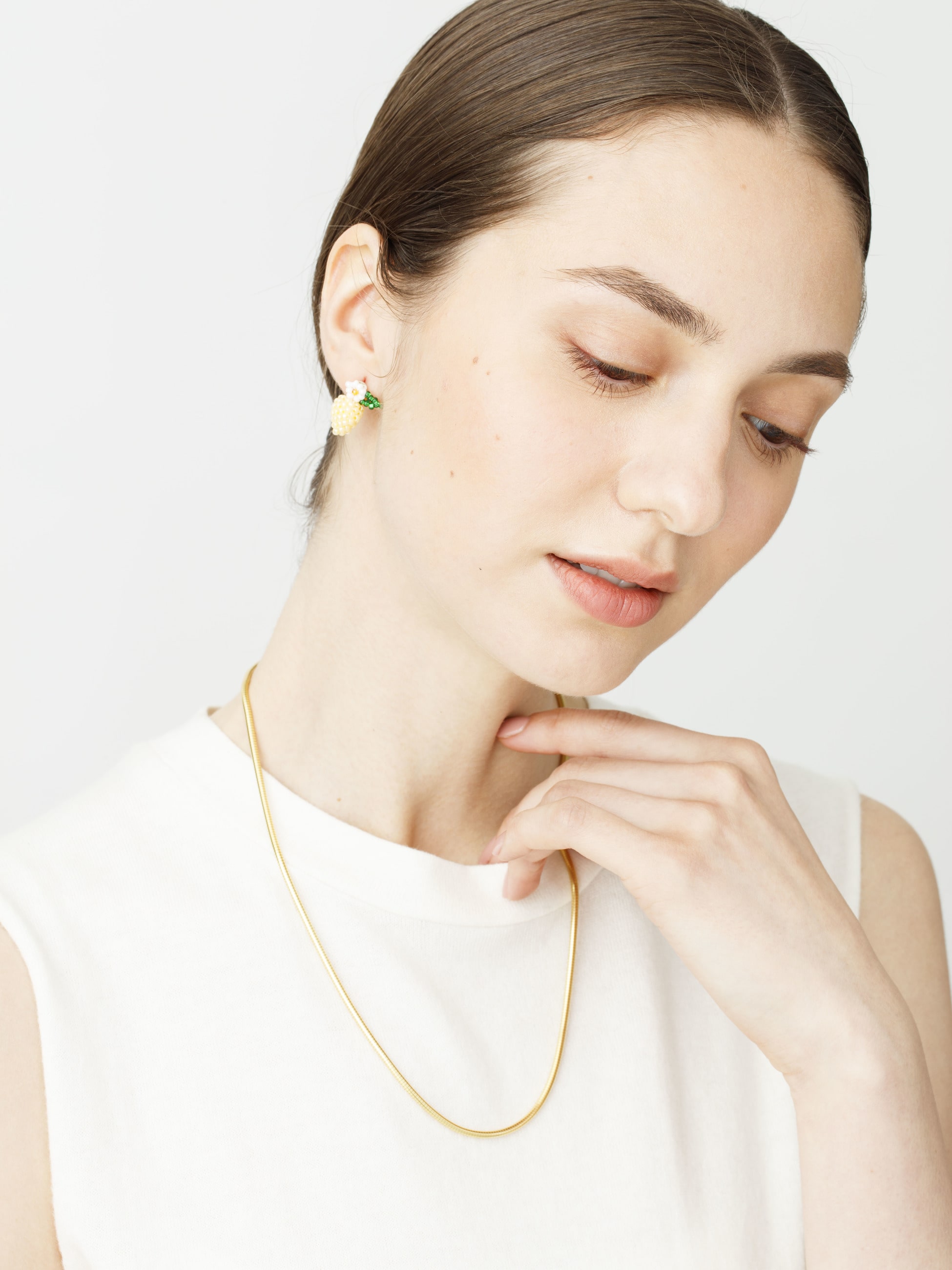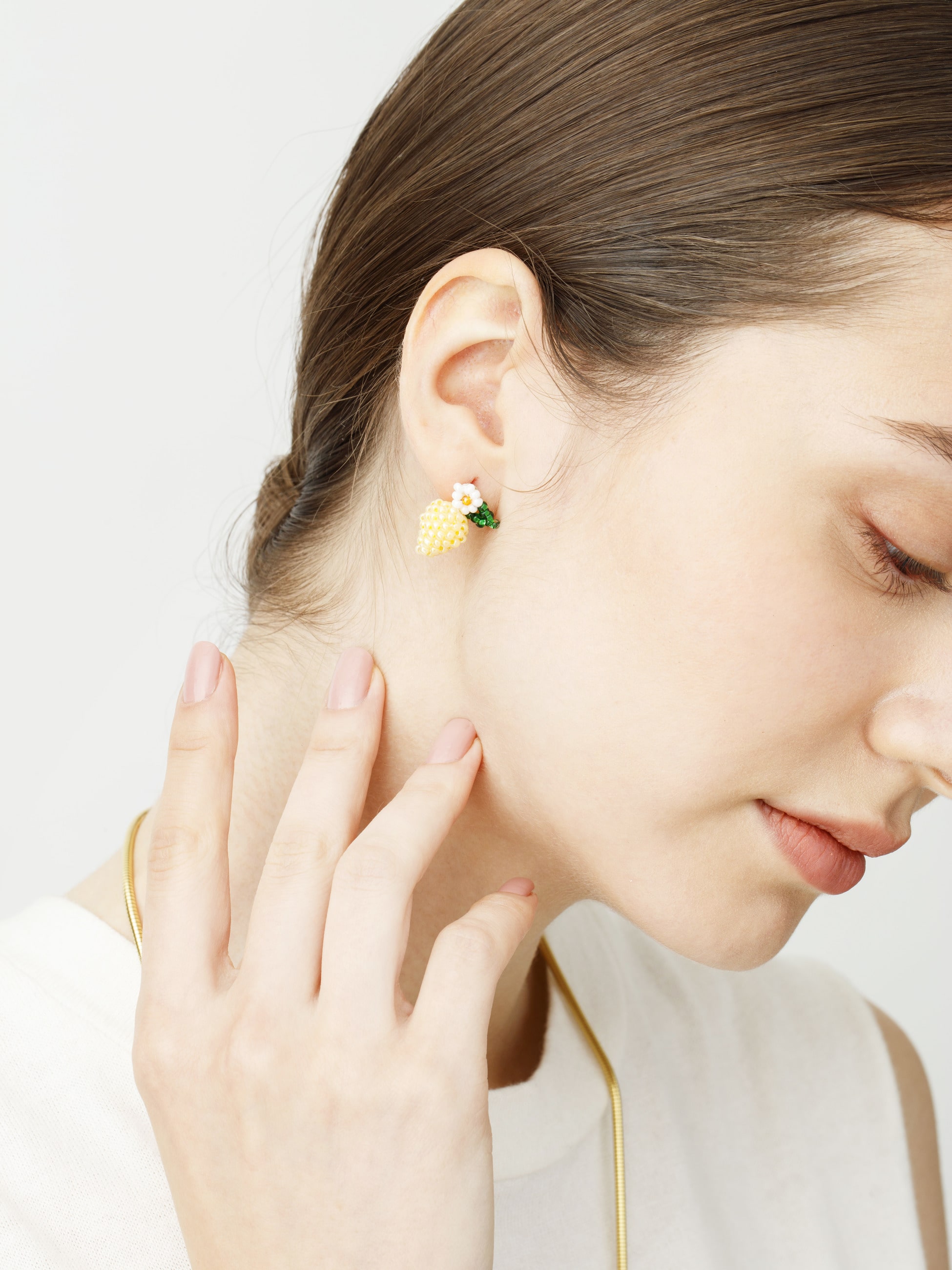 高品質のガラスビーズを使用し、職人によって1点ずつ生み出されるピアスは、愛らしいレモンモチーフにお花が寄り添い、グリーンの葉っぱがアクセントの別注デザインです。コーディネートにさりげない遊び心をプラスする、Pura Utzらしいデザイン性が楽しめるアイテムです。