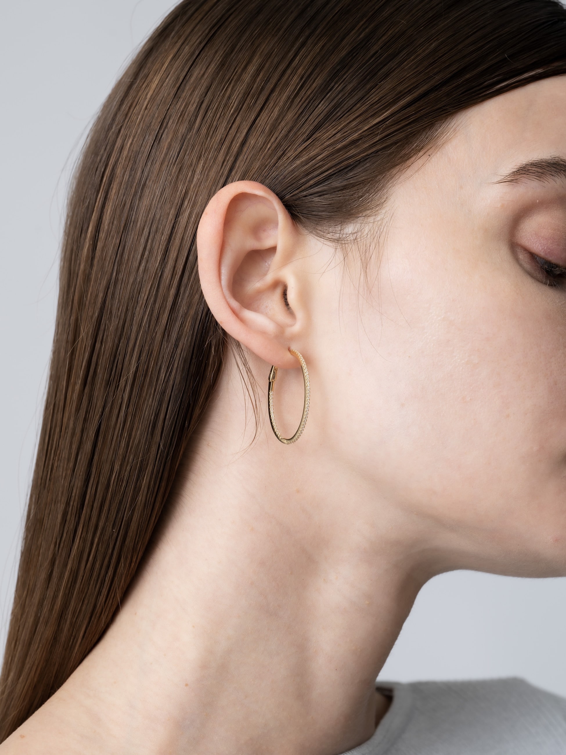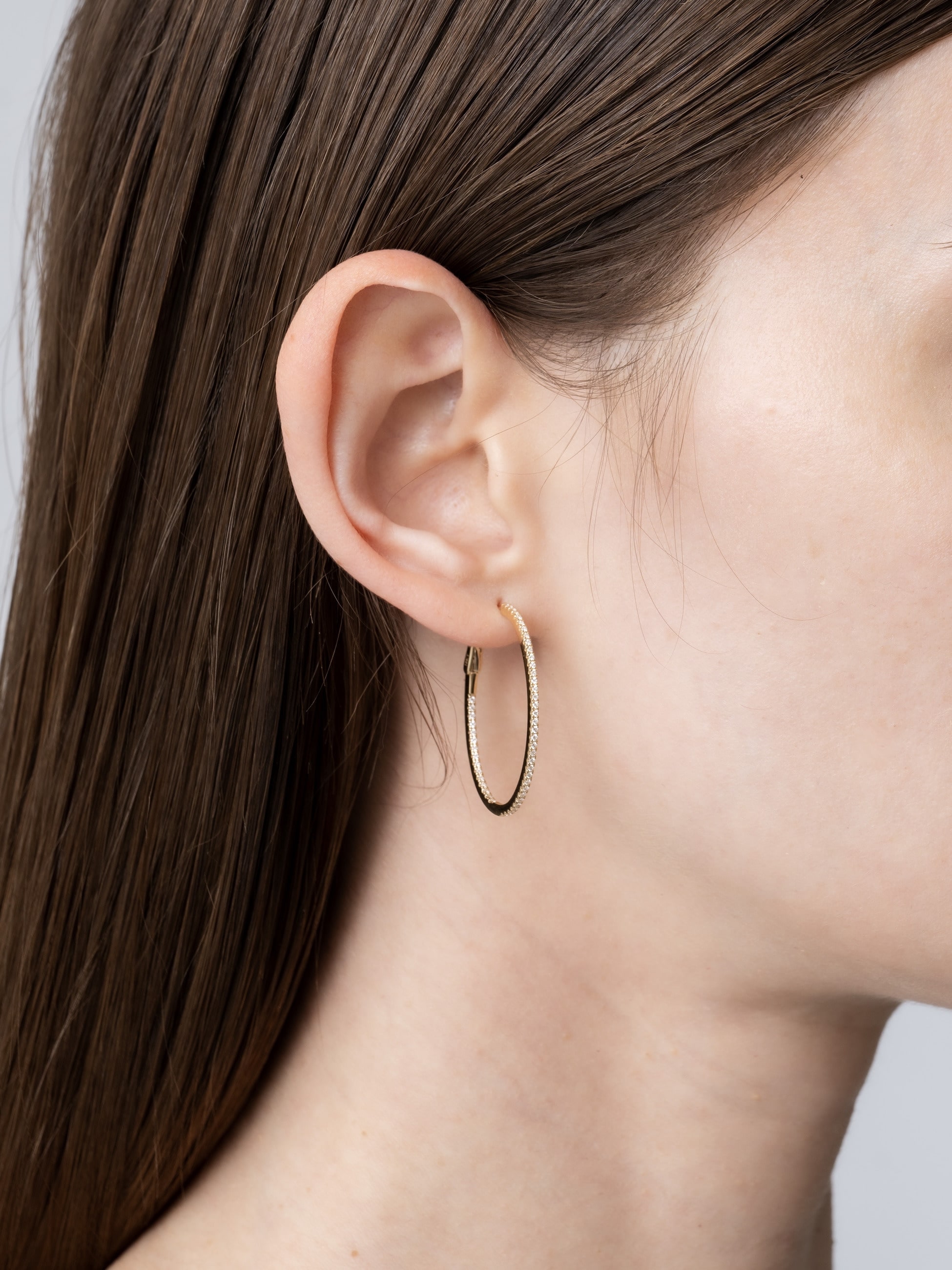 - シンプルなオーバルシルエットに、贅沢に埋め込まれたダイヤモンドが繊細な輝きを放つピアスは、サークルの後ろ側は、内側にもダイヤモンドがあしらわれており、デザイン性をお楽しみいただけます。クリップ式で着脱もしやすく、永くご愛用いただけるピアスです。