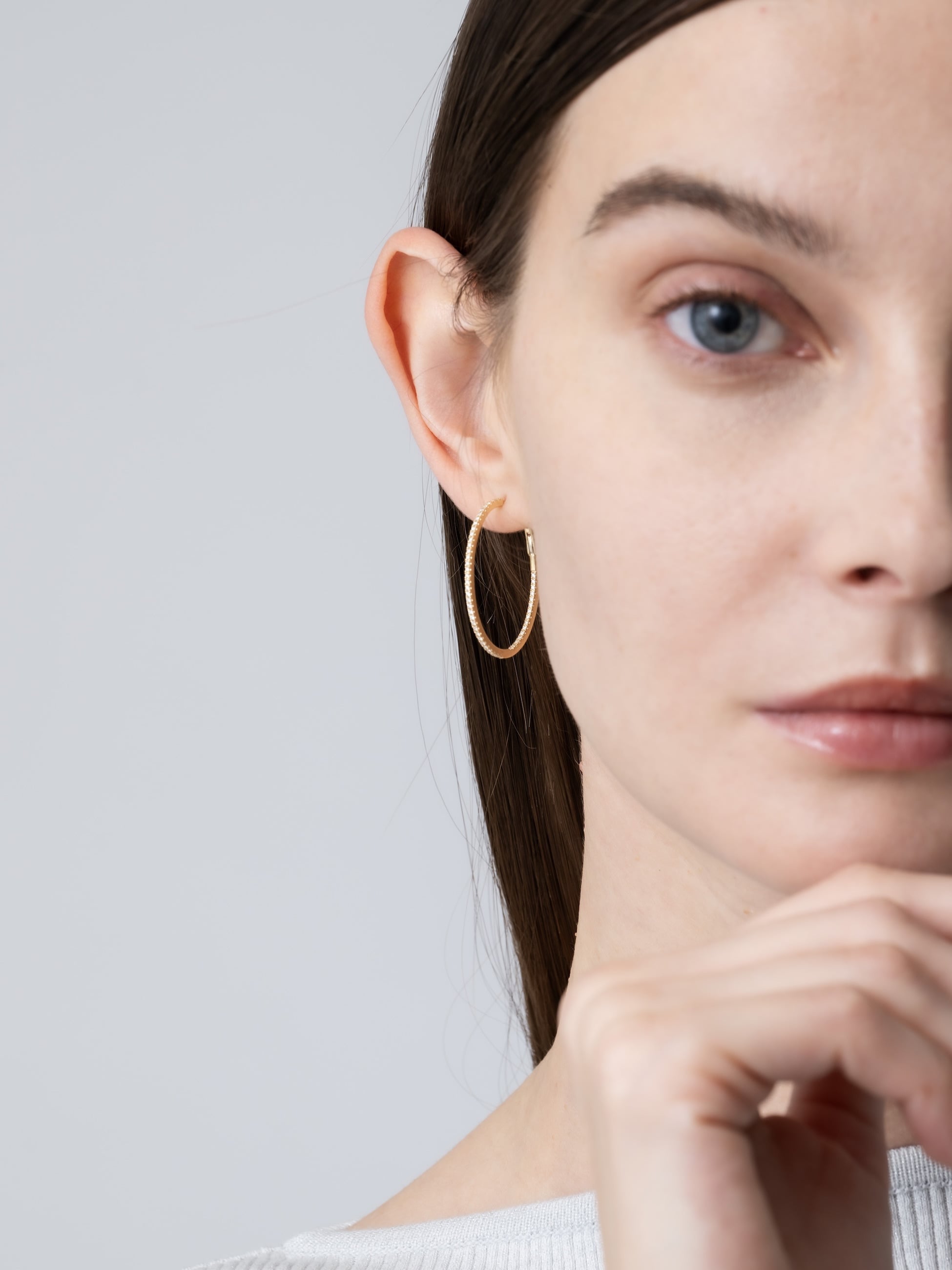 一見シンプルに見えますがデザイナーのこだわりが詰まったピアスです。表だけでなく内側半面にもダイヤモンドがセットされていてどの角度から見ても美しいです!憧れ続け、数年経った今も身に着けるたびに心が躍るお気に入りのひとつです。ドレッシーな装いはもちろん、デニムにTシャツなどカジュアルな装いの時にこそ引き立つアイテムです。