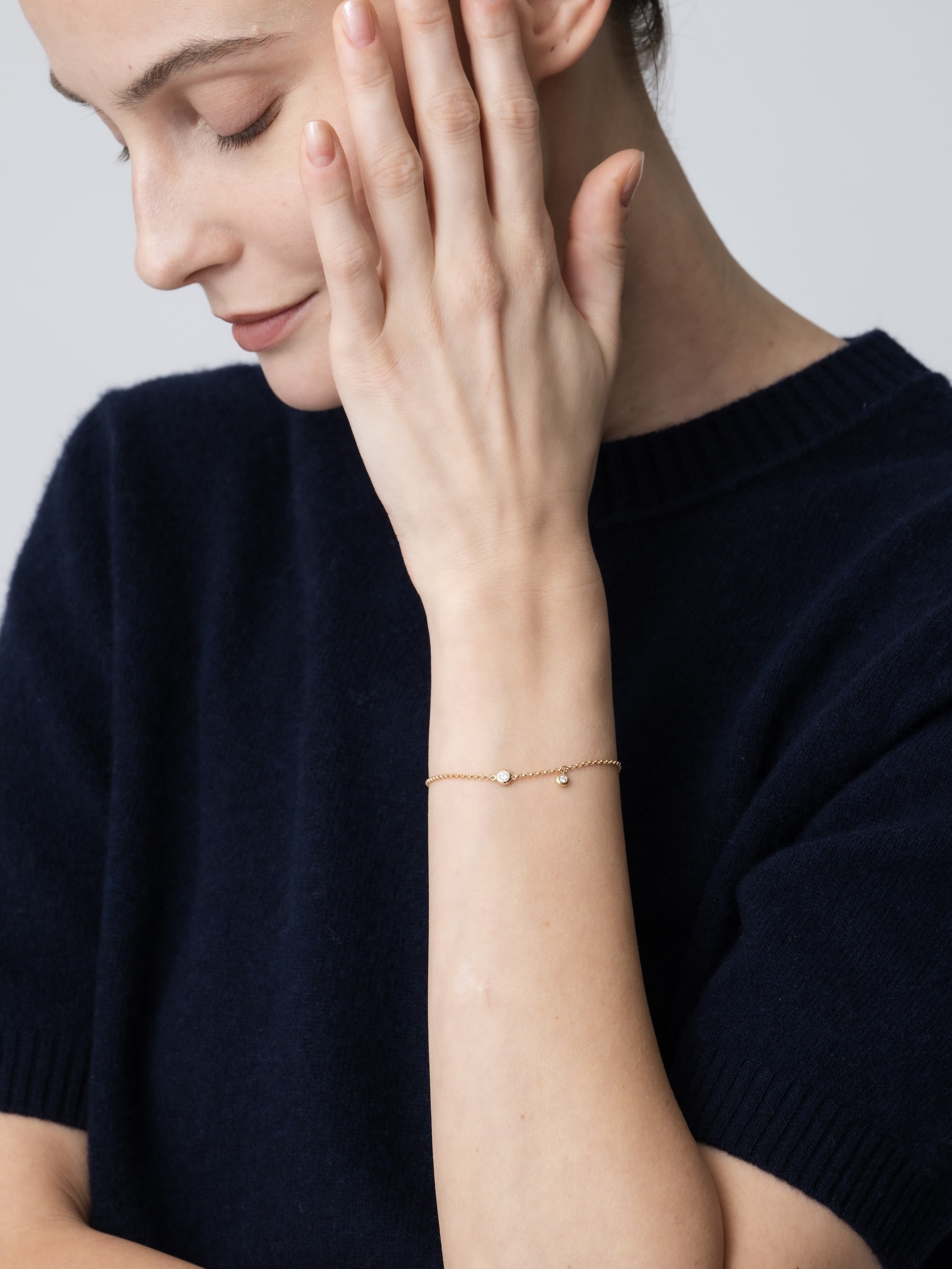 上品でシンプルなデザインのブレスレットは、アシンメトリーの配置でデザインされたダイヤモンドがポイントです。留め具部分のムーンチャームにもさりげなくダイヤモンドがあしらわれています。どんな装いにもマッチし、ベーシックアイテムとして長くお使いいただけます。