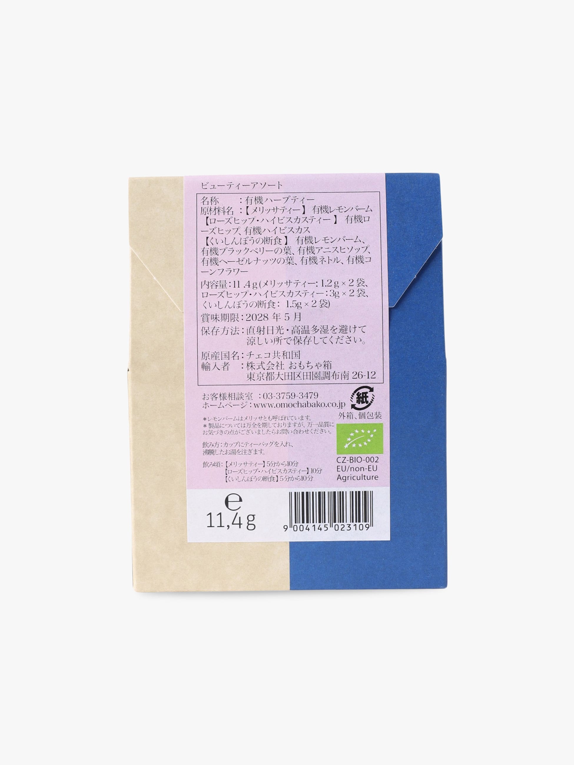 有機レモンバーム、有機ブラックベリーの葉、有機アニスヒソップ、有機ヘーゼルナッツの葉、有機ネトル、有機コーンフラワー -