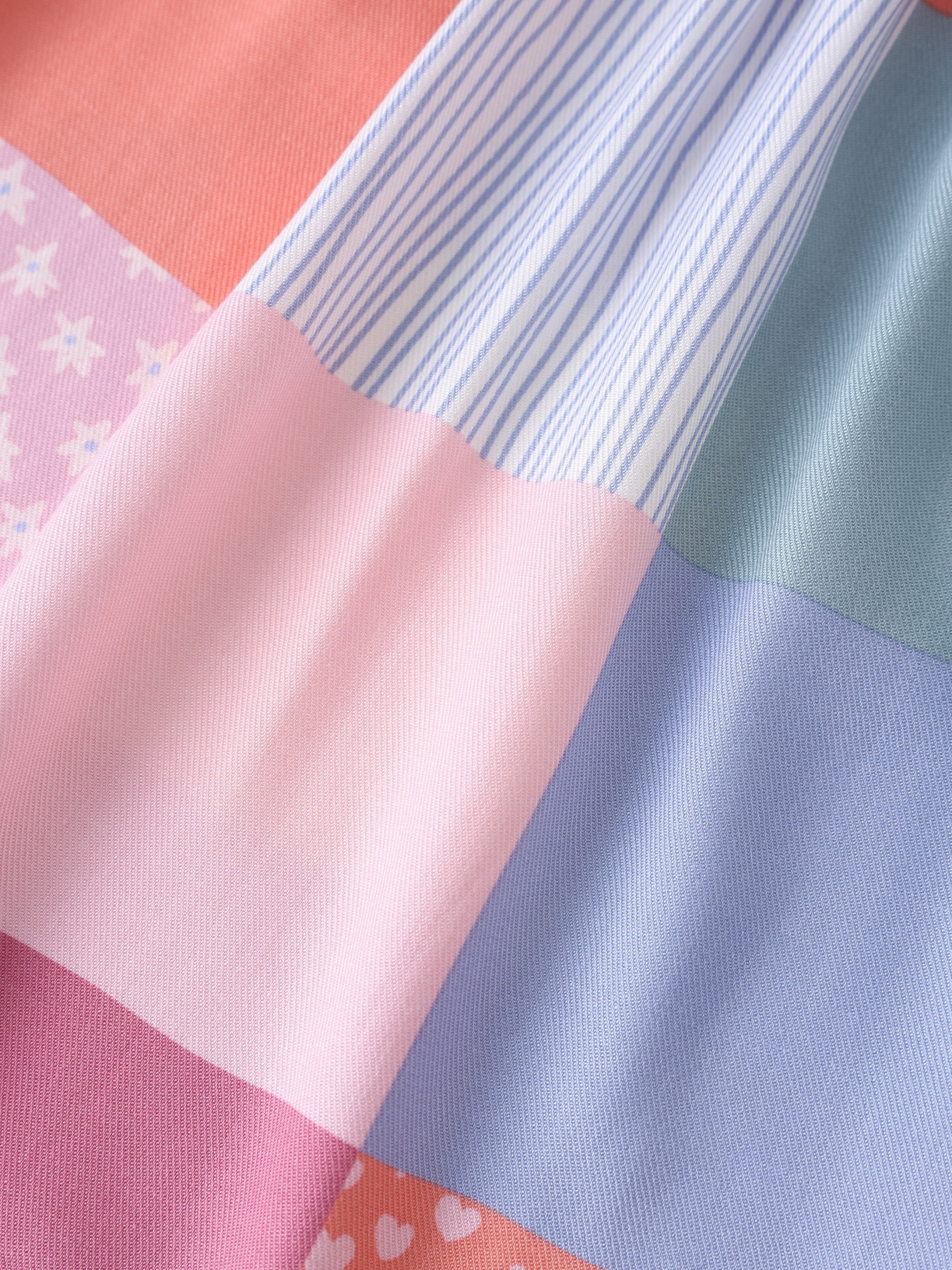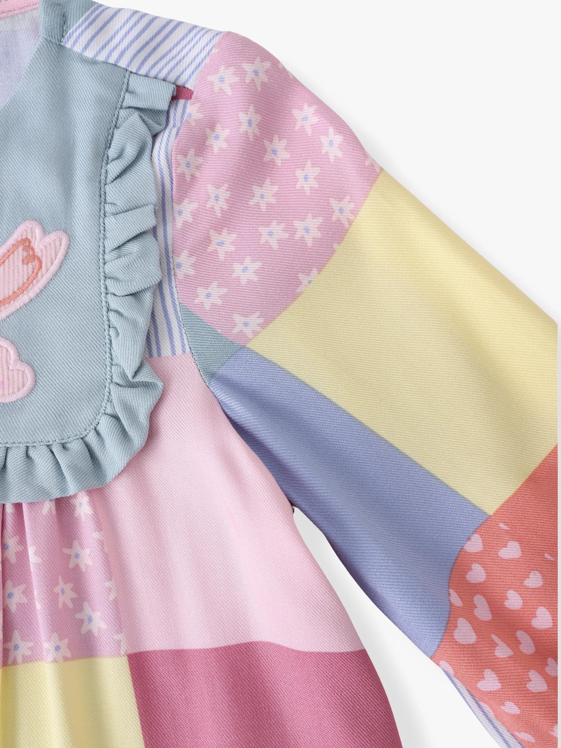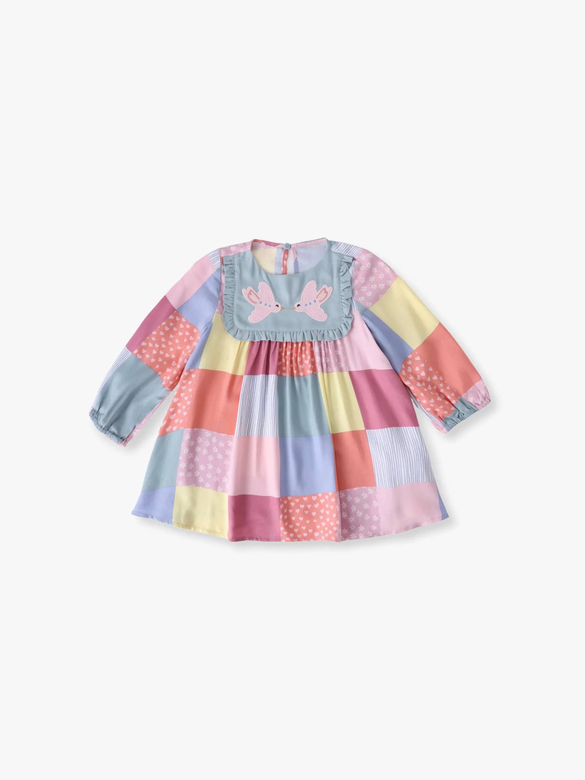 カラフルなパネルデザインがとびきりキュートなセットアップは、1枚でコーディネートの主役になります。首元には平和の象徴とされる愛らしい2羽の白鳩があしらわれています。