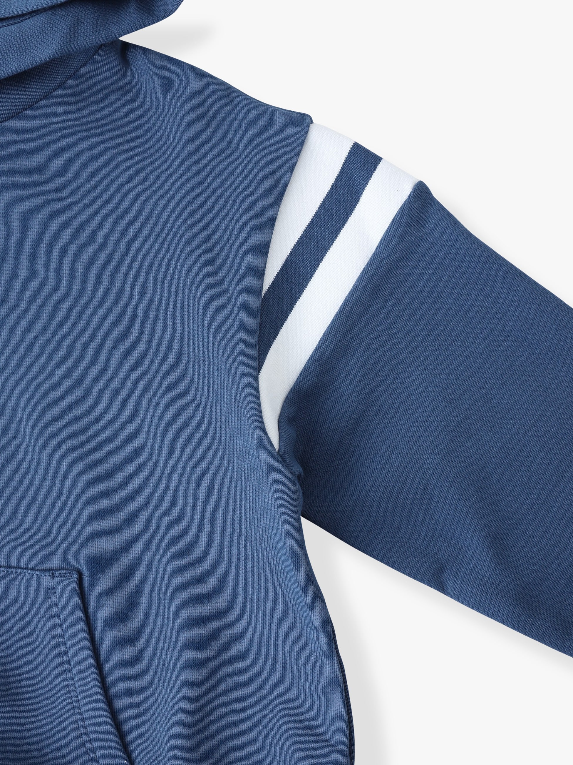 ショルダーにかけてアスレジャーなムードの、控えめのストライプがあしらわれたフーディーです。柔らかなオーガニックコットンフリースを使用し、肌触りがよく快適な着心地です。同シリーズのポケットラインショーツ(ブルー/4-10Y)とセットアップで着ると、統一感のあるスタイルに仕上がります。
