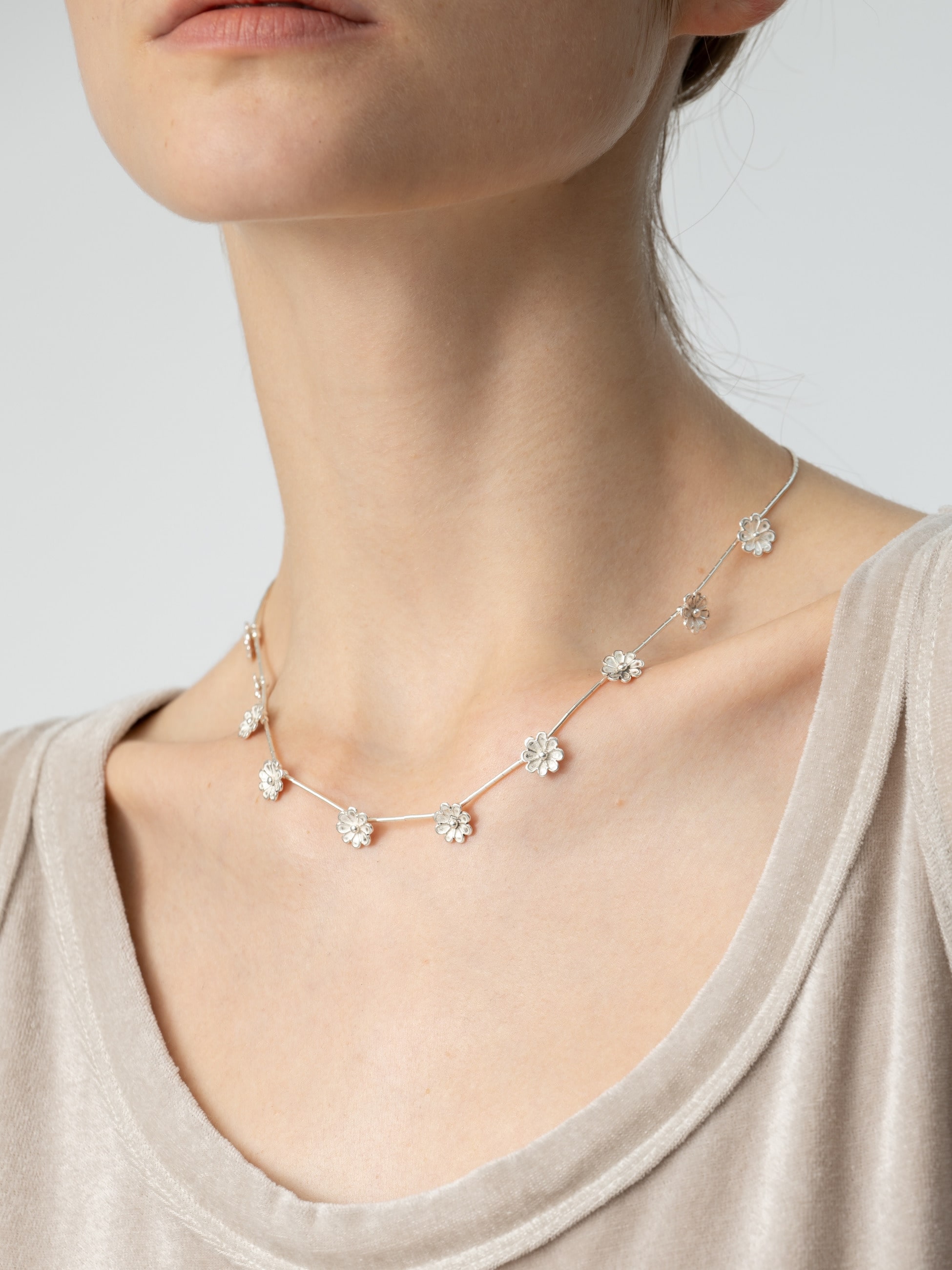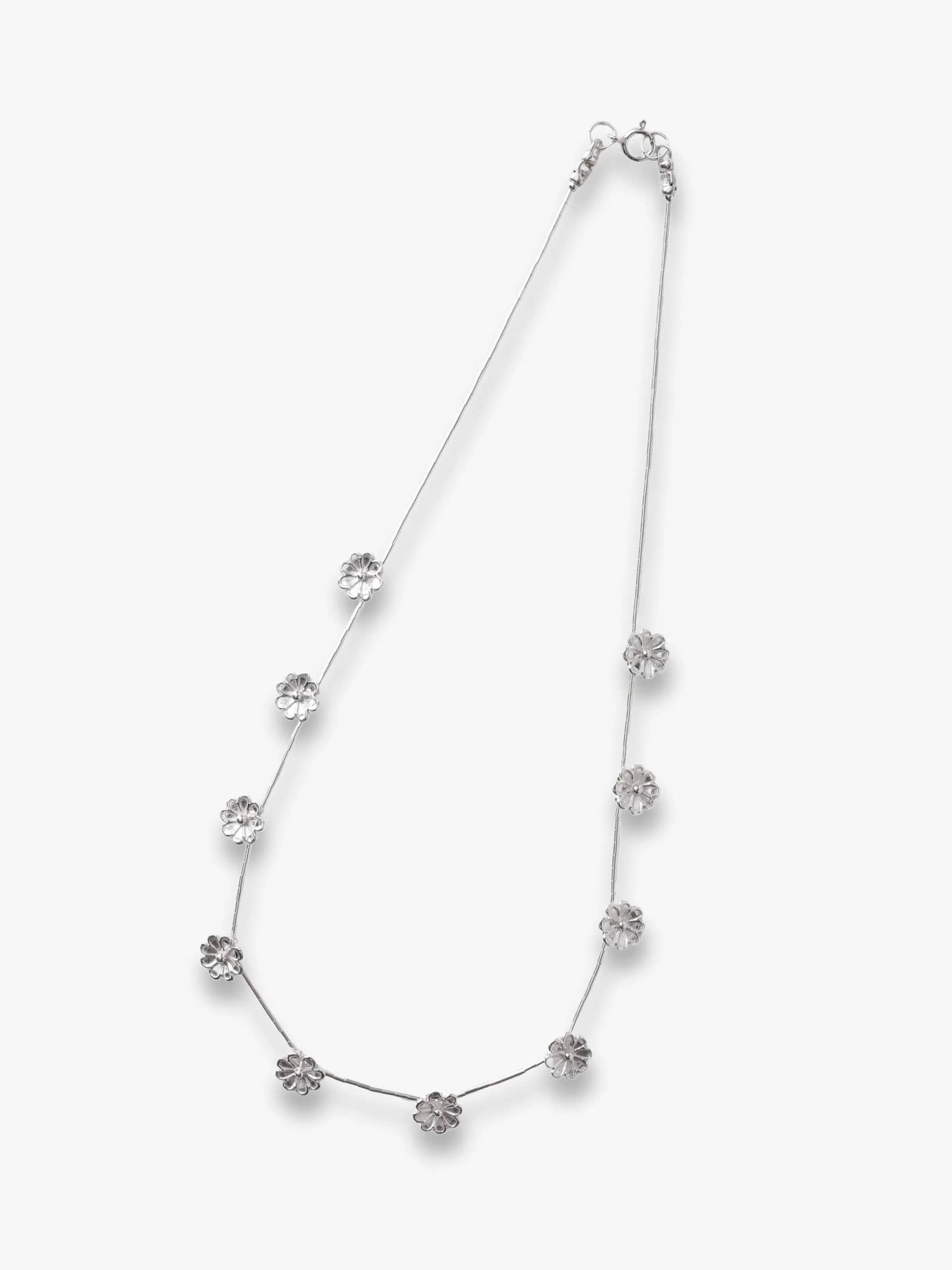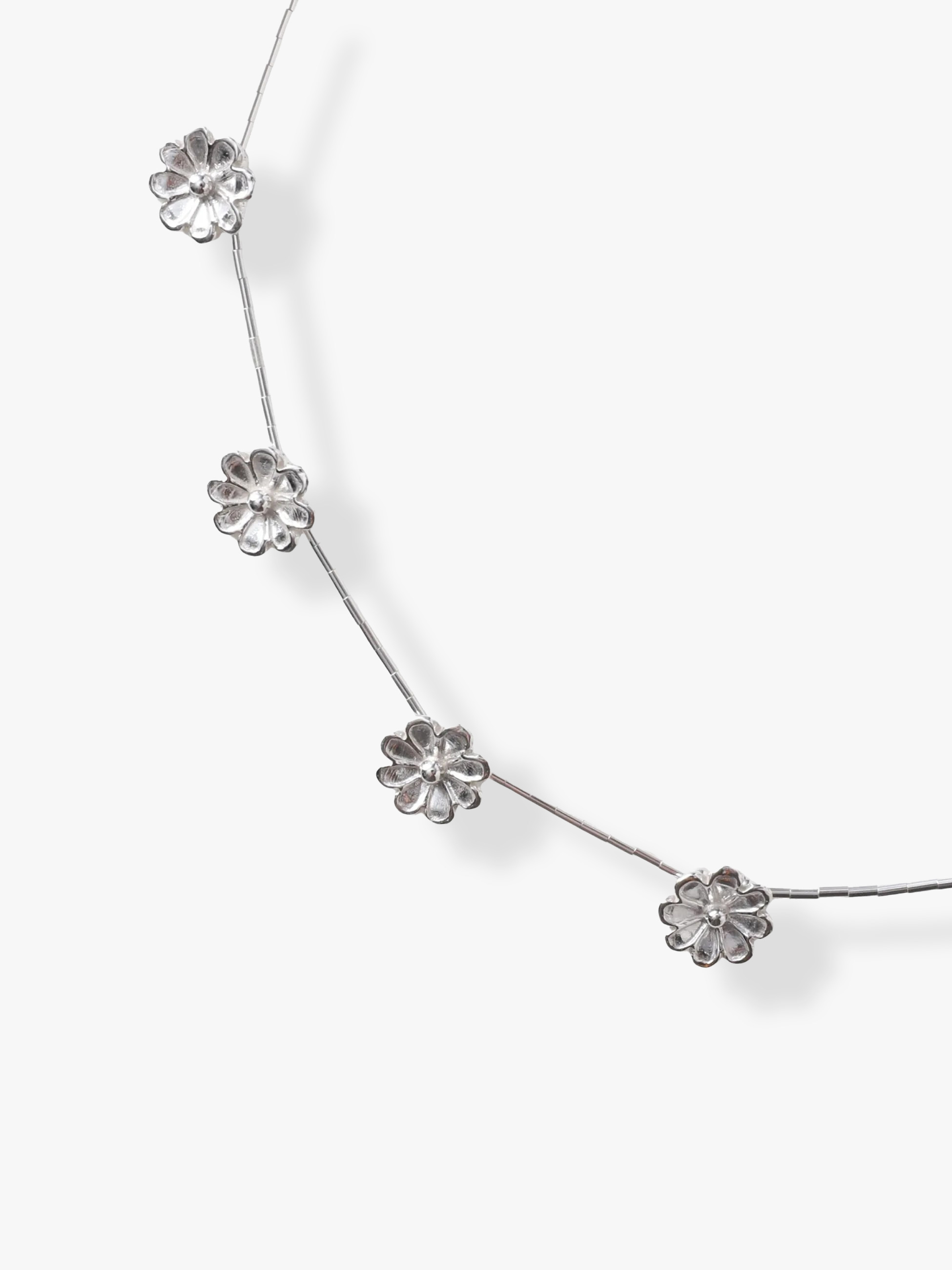 - 華奢なラインに愛らしいフラワーモチーフをあしらった別注シリーズが登場です。鎖骨ラインにそっと沿うネックレスは、シルバーとの繊細なバランス感が心をくすぐります。ネイティブアメリカンジュエリー定番のいぶし加工をあえて入れず、シルバー本来のツヤを生かしたミニマルなデザインは、肌にやわらかく寄り添いながら、日常のスタイルを上品に彩ります。