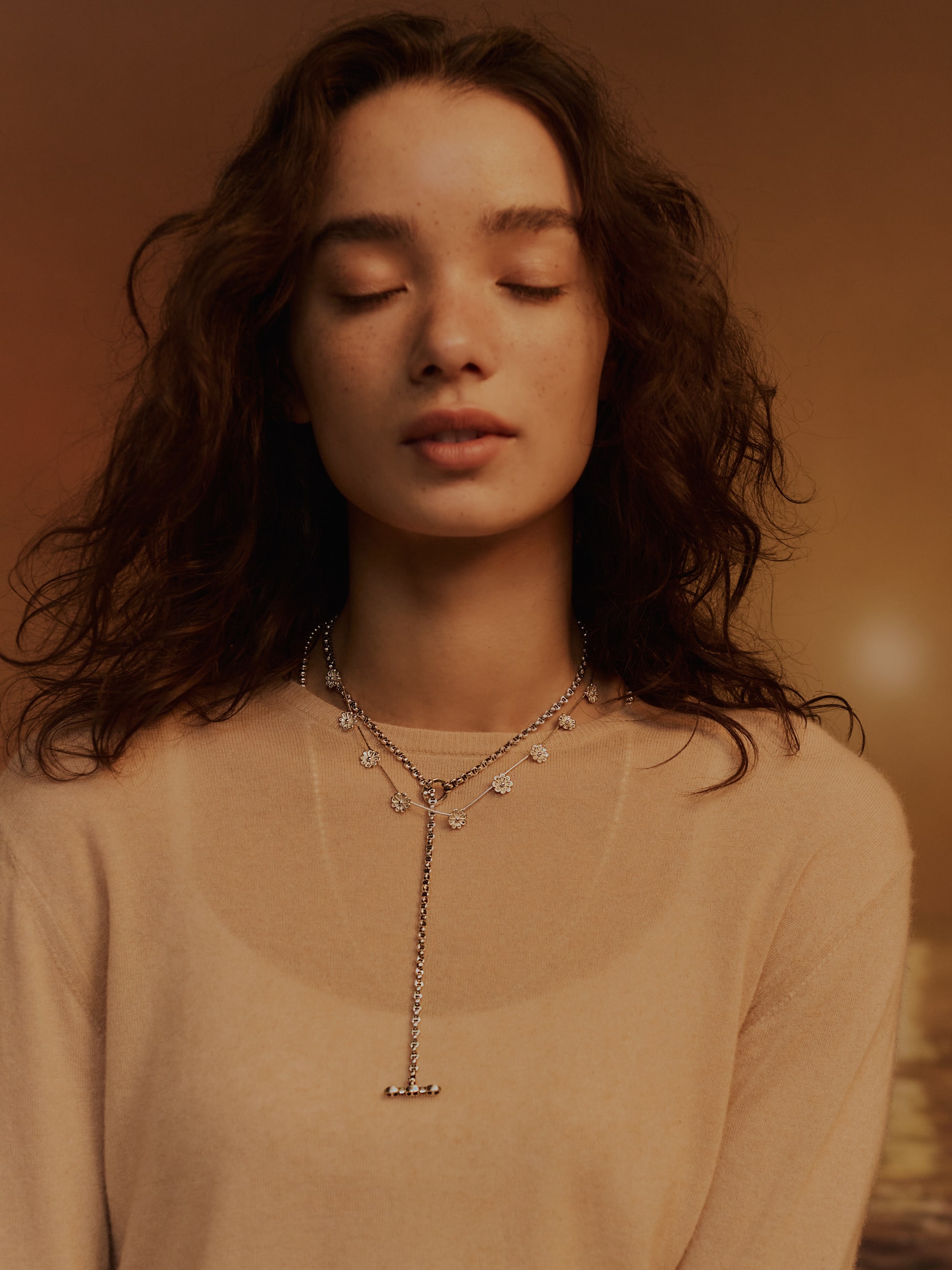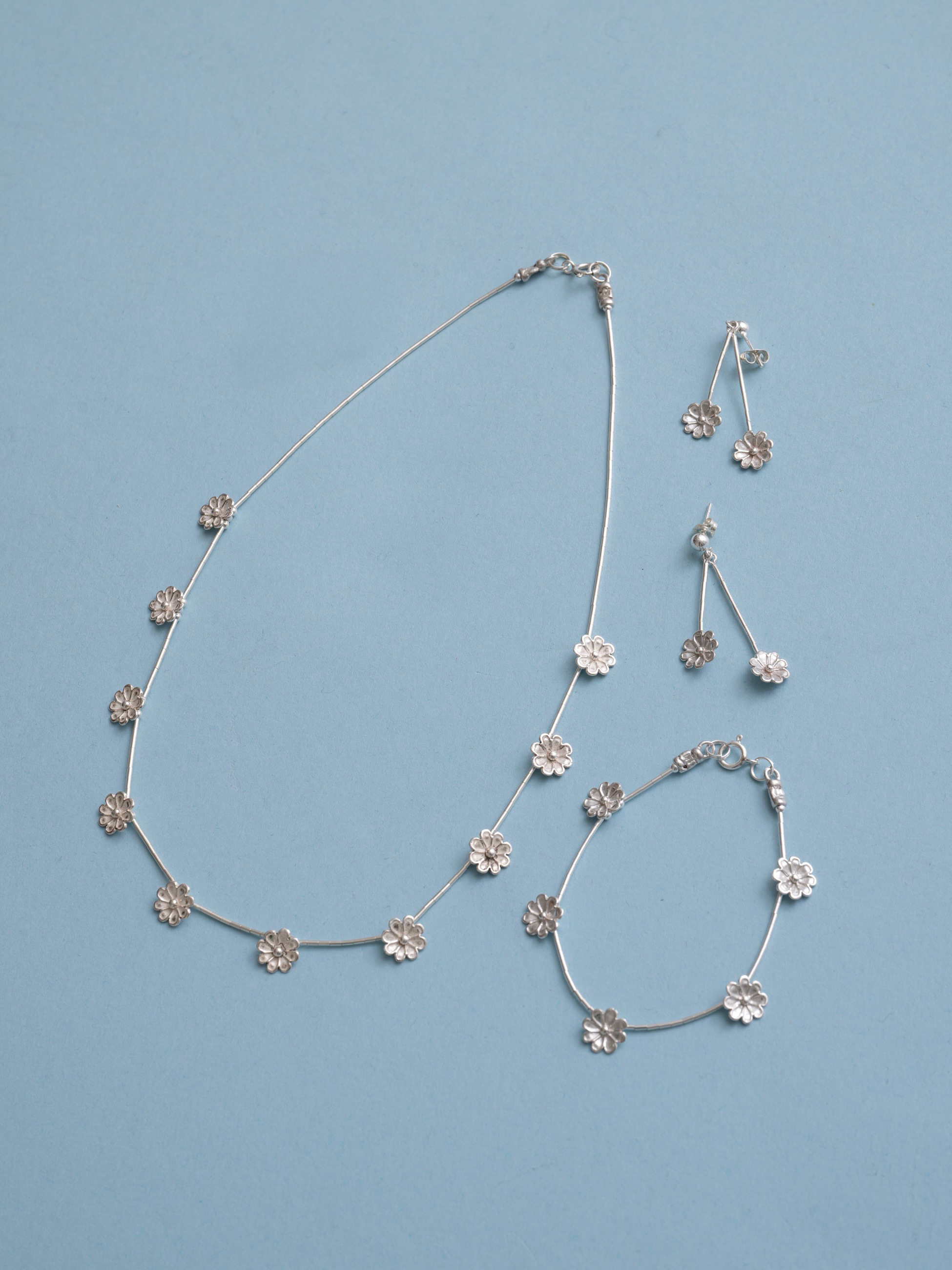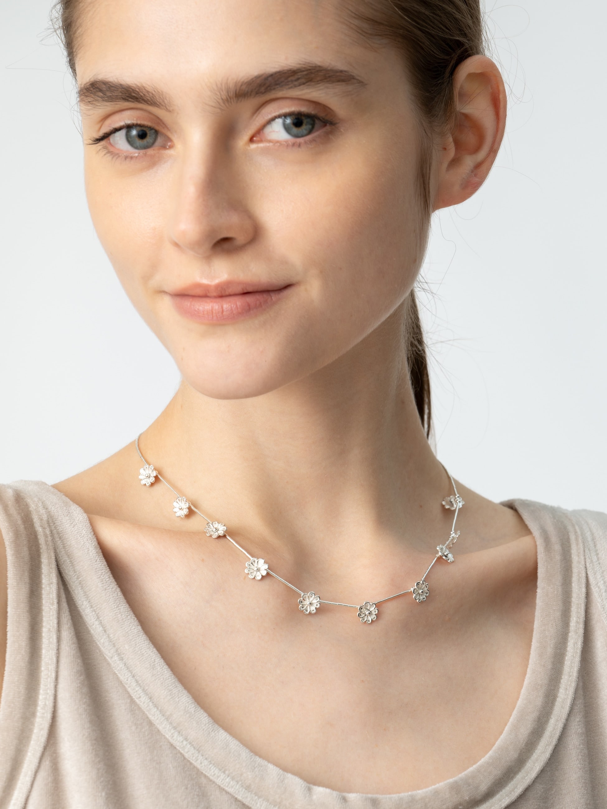 - 華奢なラインに愛らしいフラワーモチーフをあしらった別注シリーズが登場です。鎖骨ラインにそっと沿うネックレスは、シルバーとの繊細なバランス感が心をくすぐります。ネイティブアメリカンジュエリー定番のいぶし加工をあえて入れず、シルバー本来のツヤを生かしたミニマルなデザインは、肌にやわらかく寄り添いながら、日常のスタイルを上品に彩ります。