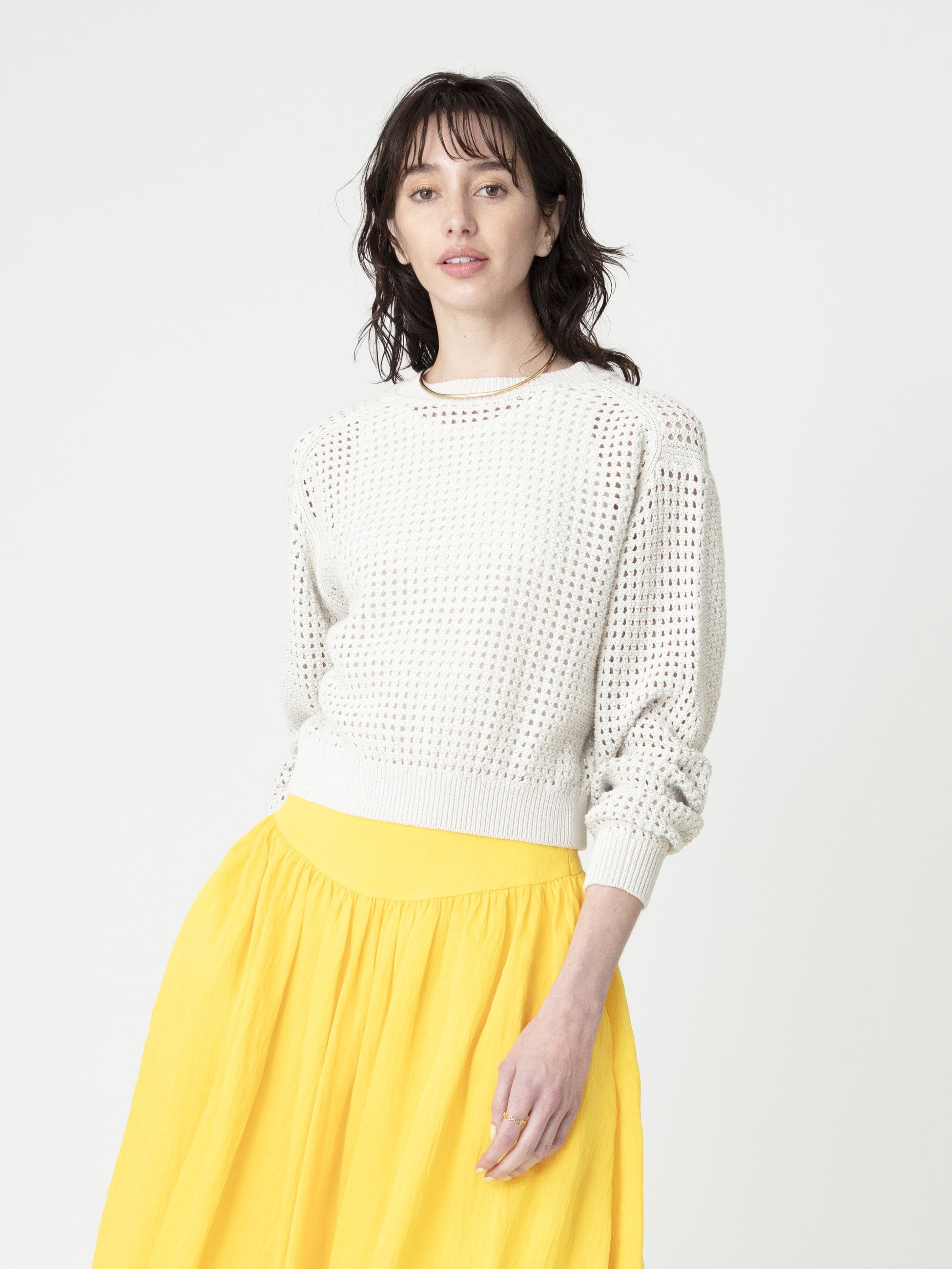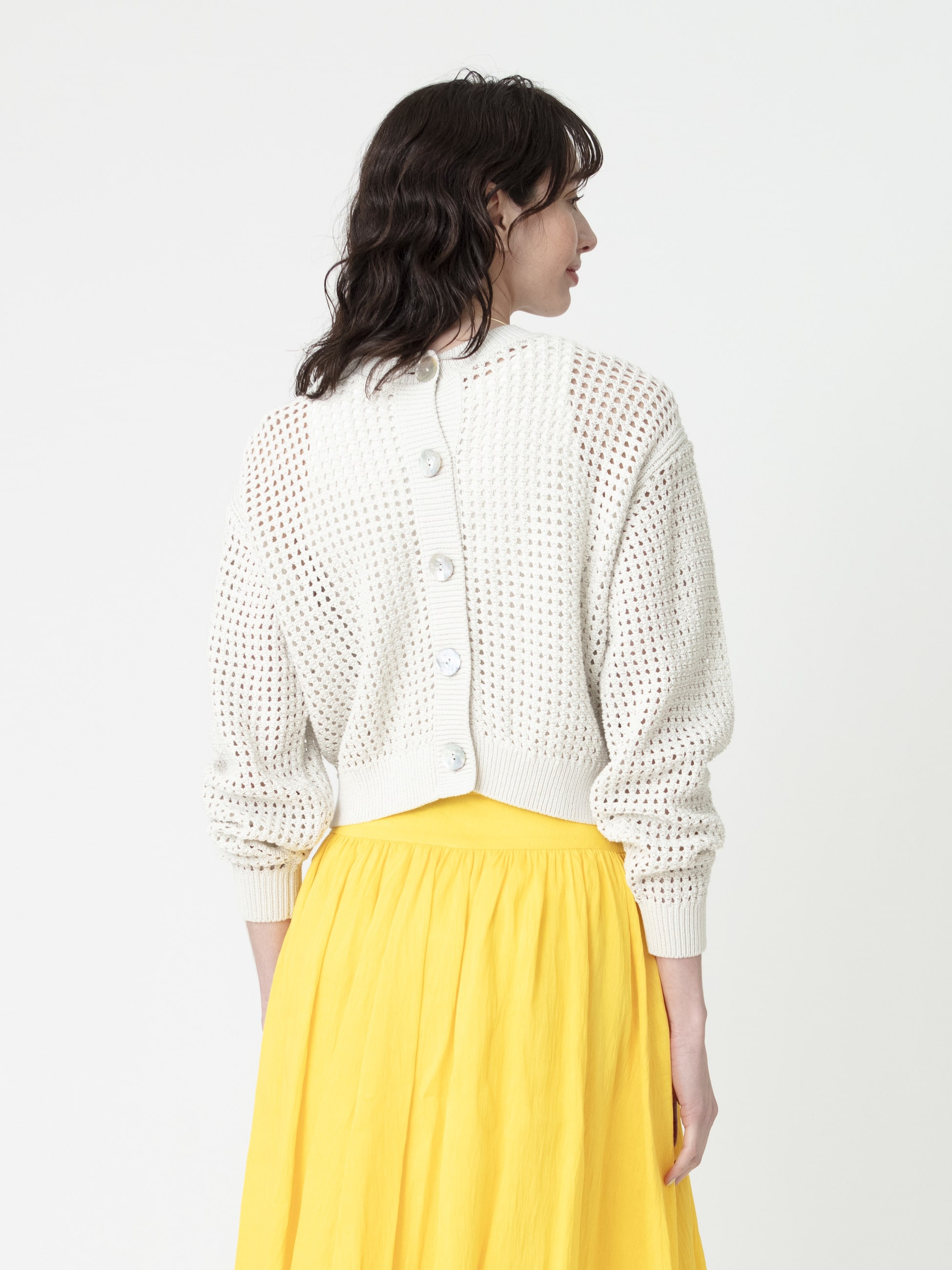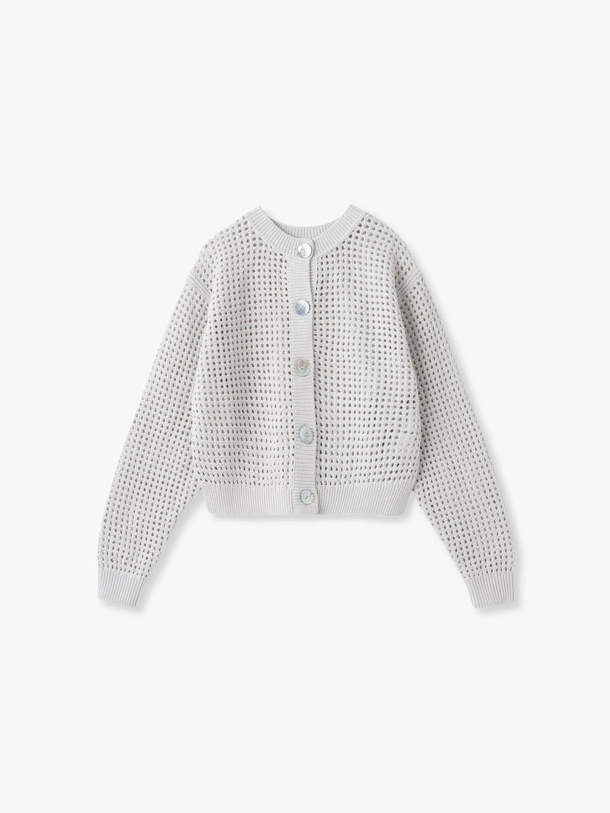 - オーガニックコットン糸とペーパー糸を撚り合わせた糸で編み立てたメッシュカーディガンです。ドライタッチな肌触りで、暑い時期まで快適な着心地なのも嬉しいポイント。ベーシックなクルーネックデザインでありながら、大きなシェルボタンがアクセントです。前後2WAYで着用いただけ、スタイリングの幅も広がります。