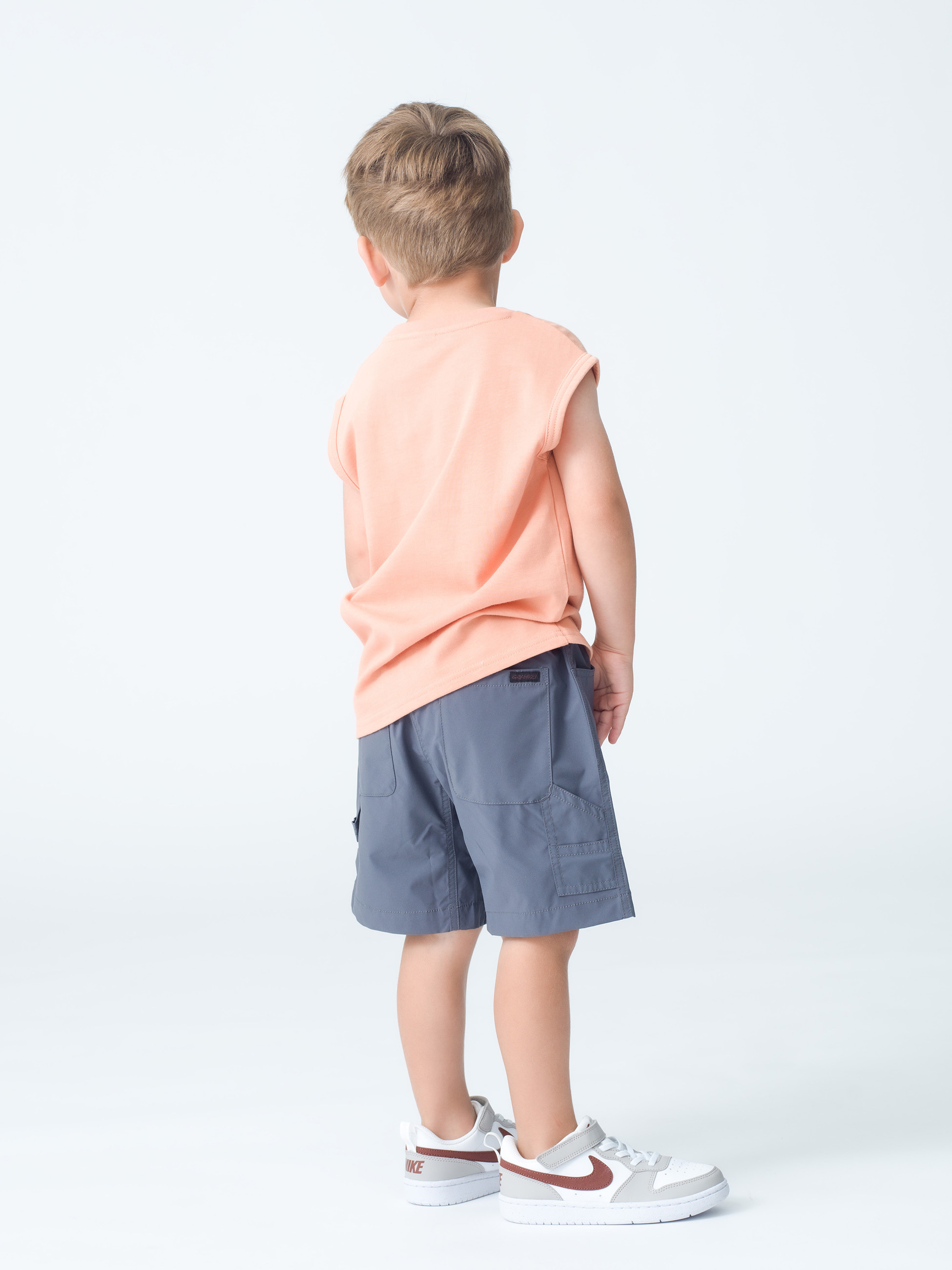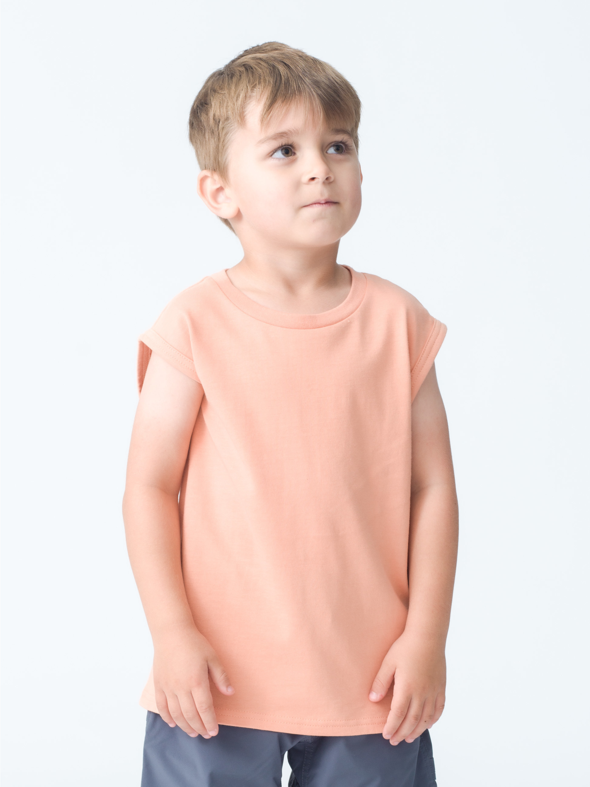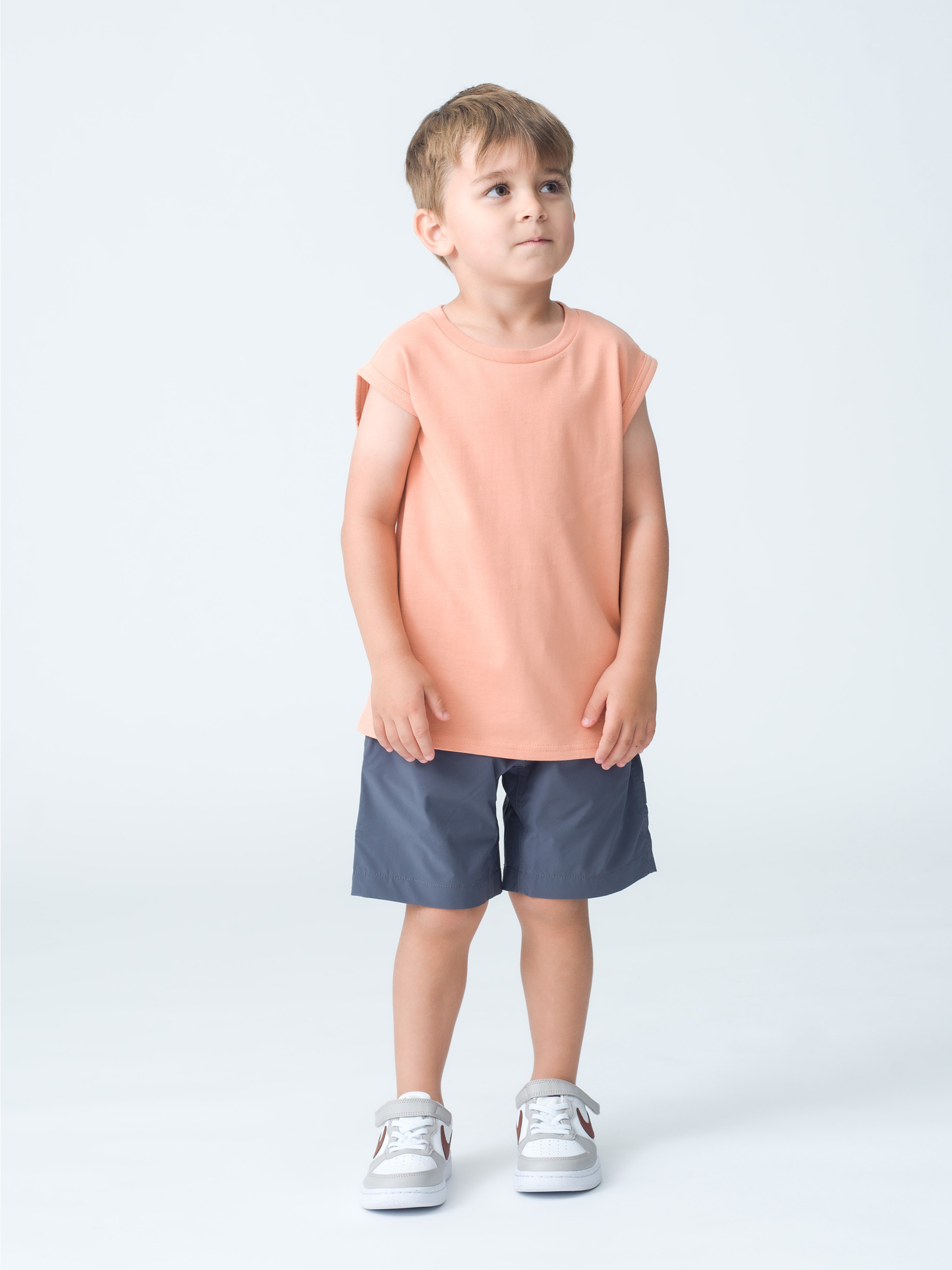 肩からドロップしたリラクシーなシルエットのスリーブレストップは、オーガニックコットンの空紡糸を使用したドライタッチな肌触りで、吸汗と速乾の役割を備えています。暑いシーズンもお子さまが動きやすく、心地良く過ごしていただけるよう、シンプルな中にもこだわりをぎゅっと詰め込んだアイテムです