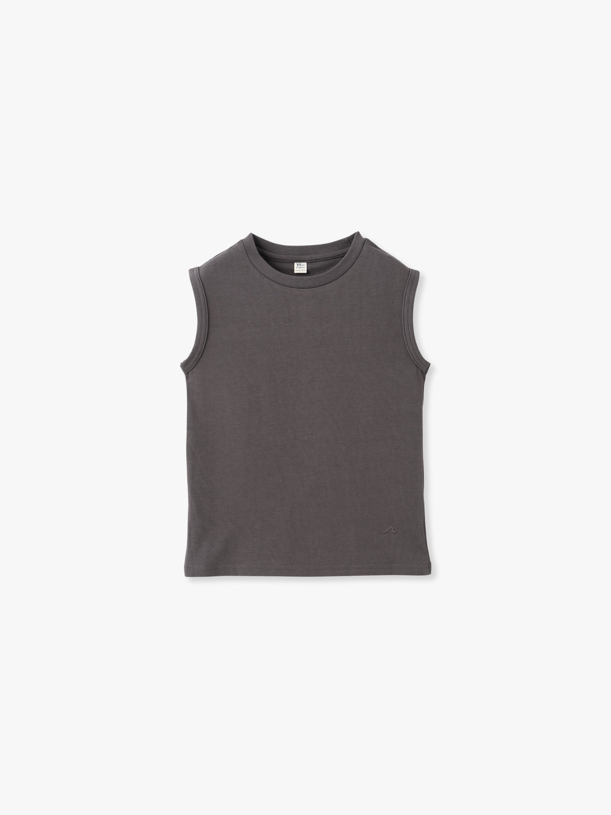 肩からドロップしたリラクシーなシルエットのスリーブレストップは、オーガニックコットンの空紡糸を使用したドライタッチな肌触りで、吸汗と速乾の役割を備えています。暑いシーズンもお子さまが動きやすく、心地良く過ごしていただけるよう、シンプルな中にもこだわりをぎゅっと詰め込んだアイテムです