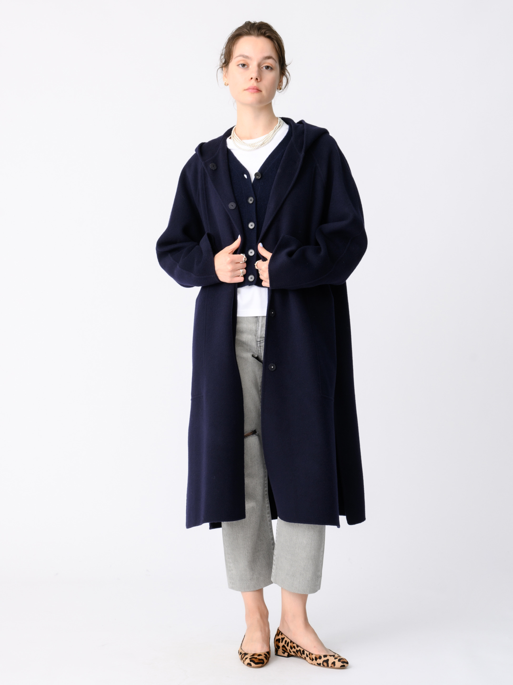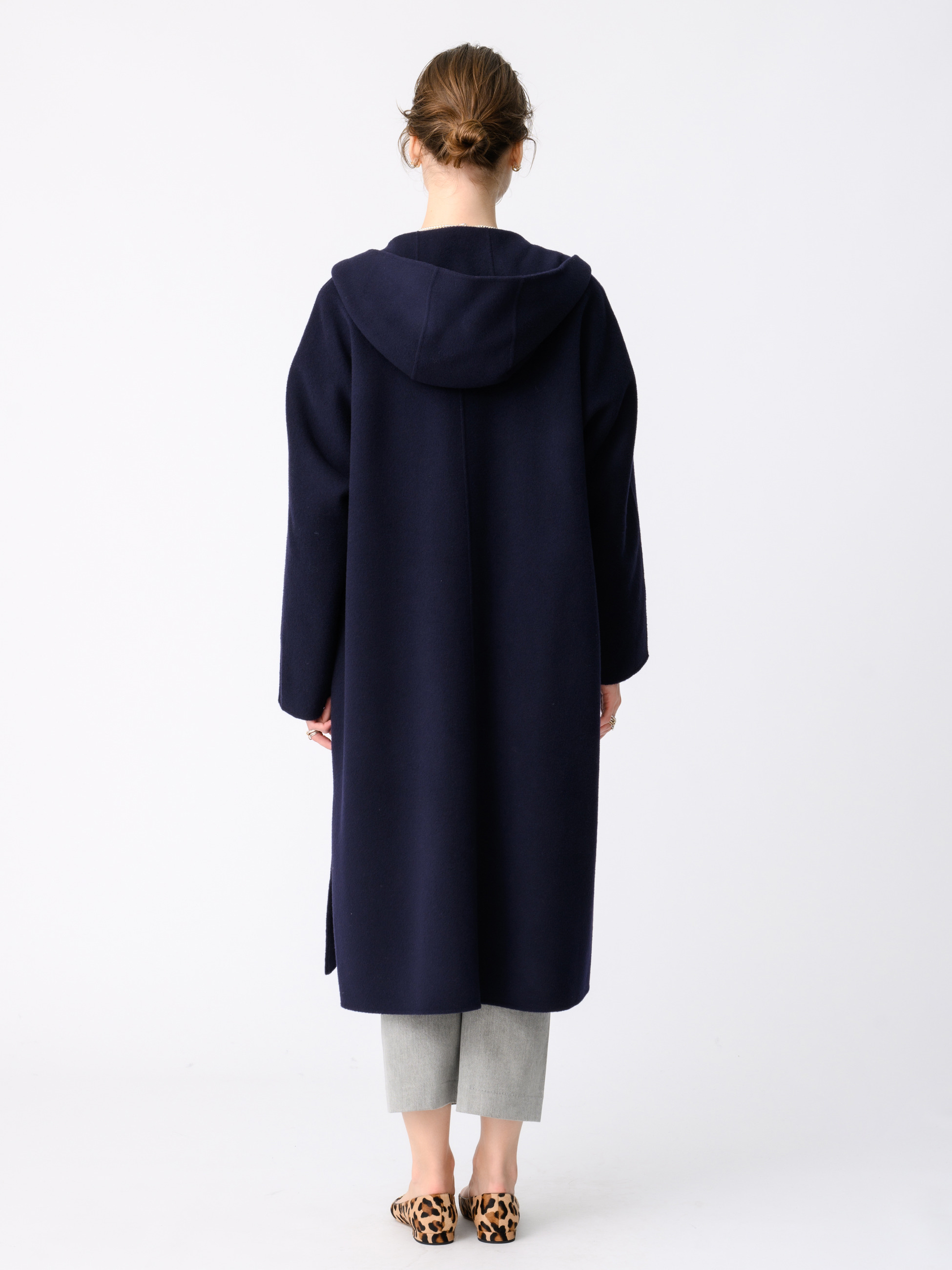 - リバー仕立てのウールフーディーコートは、ぎゅっと詰まった肉厚地が風を通しにくく、寒い日もあたたかく着用いただけます。ややオーバーサイズのフォルムでありながらも、フロントはスナップ開きになったすっきりとした見た目でデイリーユースにもぴったり。サイドスリットを入れることで足捌きもよく、デザインのアクセントになっています。