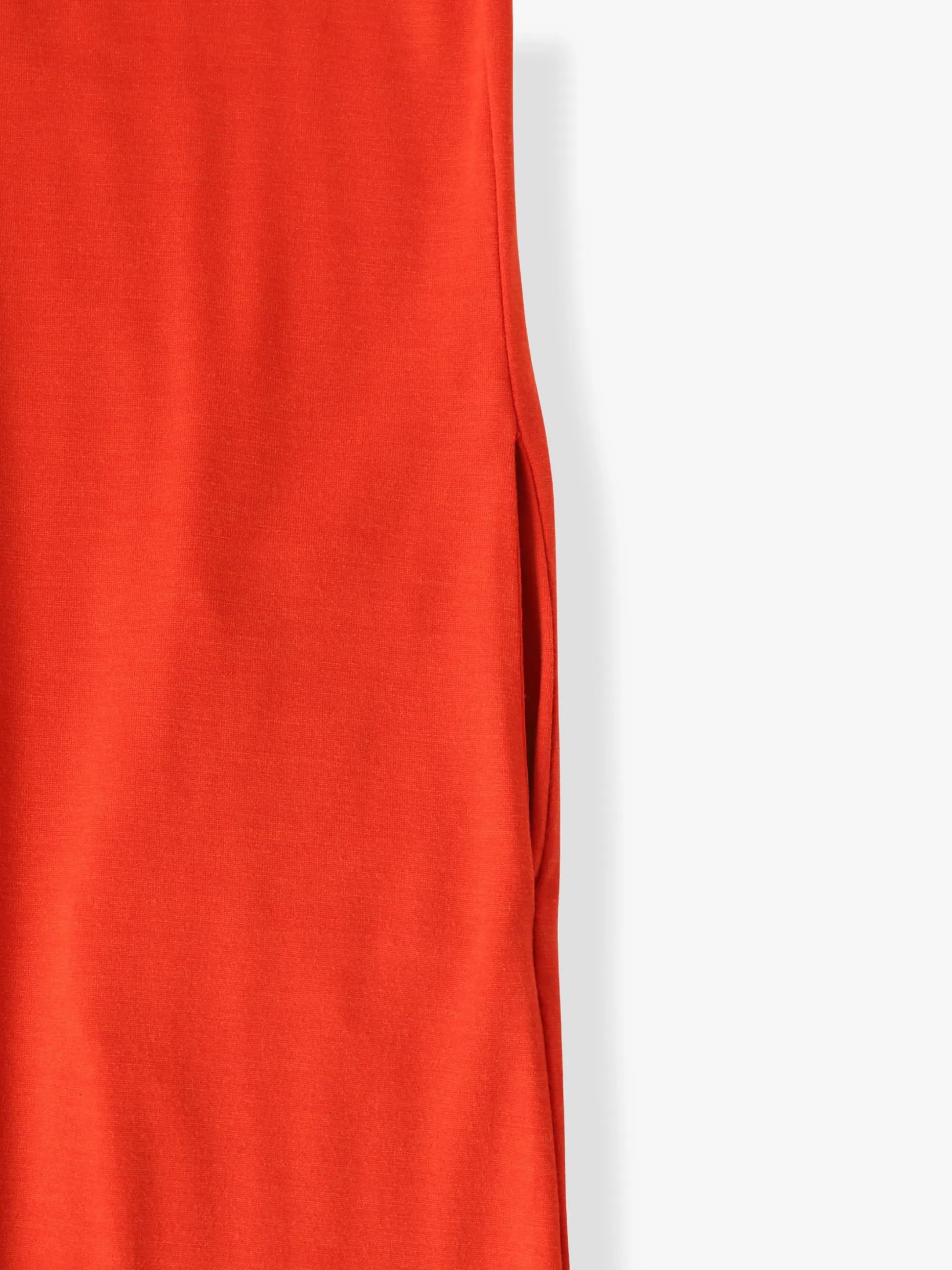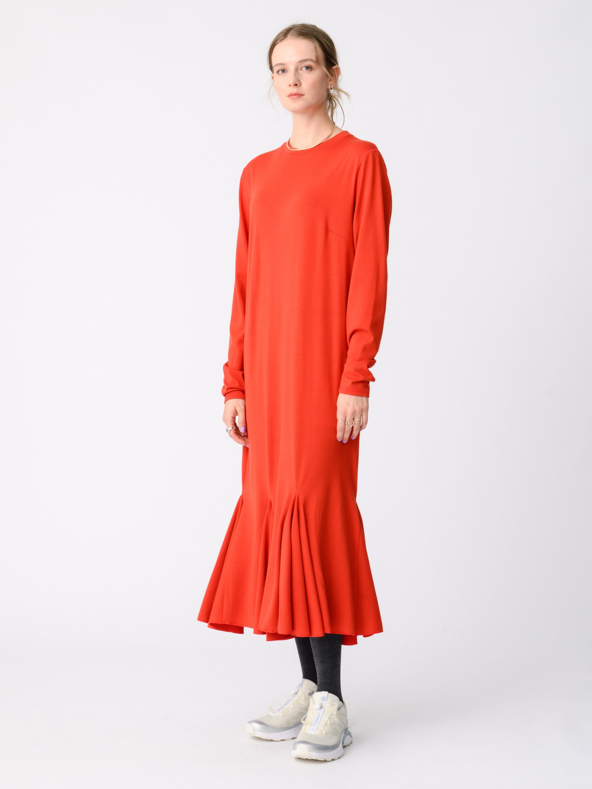 - さらっとした表面感が特徴の天竺素材のマキシ丈のドレスです。デイリーにもぴったりなブラックと、存在感を醸す鮮やかなレッドの2色展開です。すとんとしたIラインシルエットに、裾に施した三角マチのフリルが女性らしさをプラスし、寒い時期はタイツと合わせたスタイリングもおすすめです。