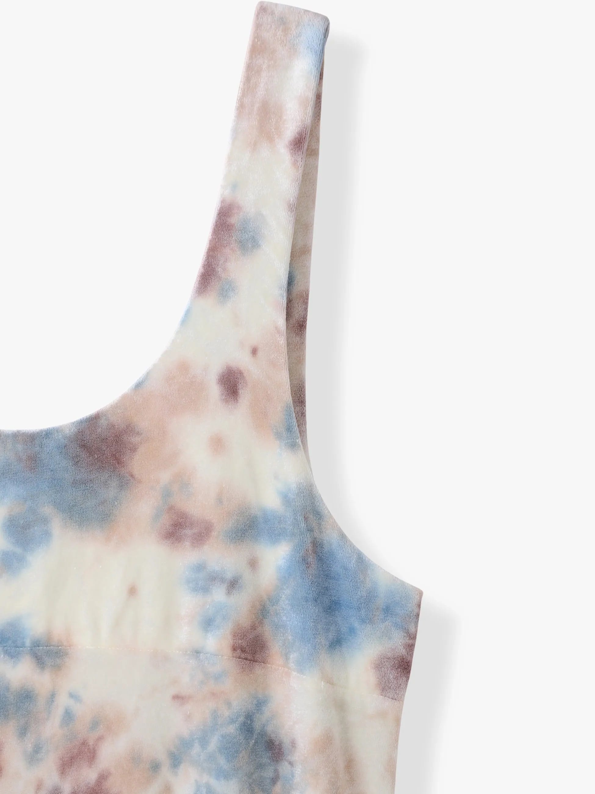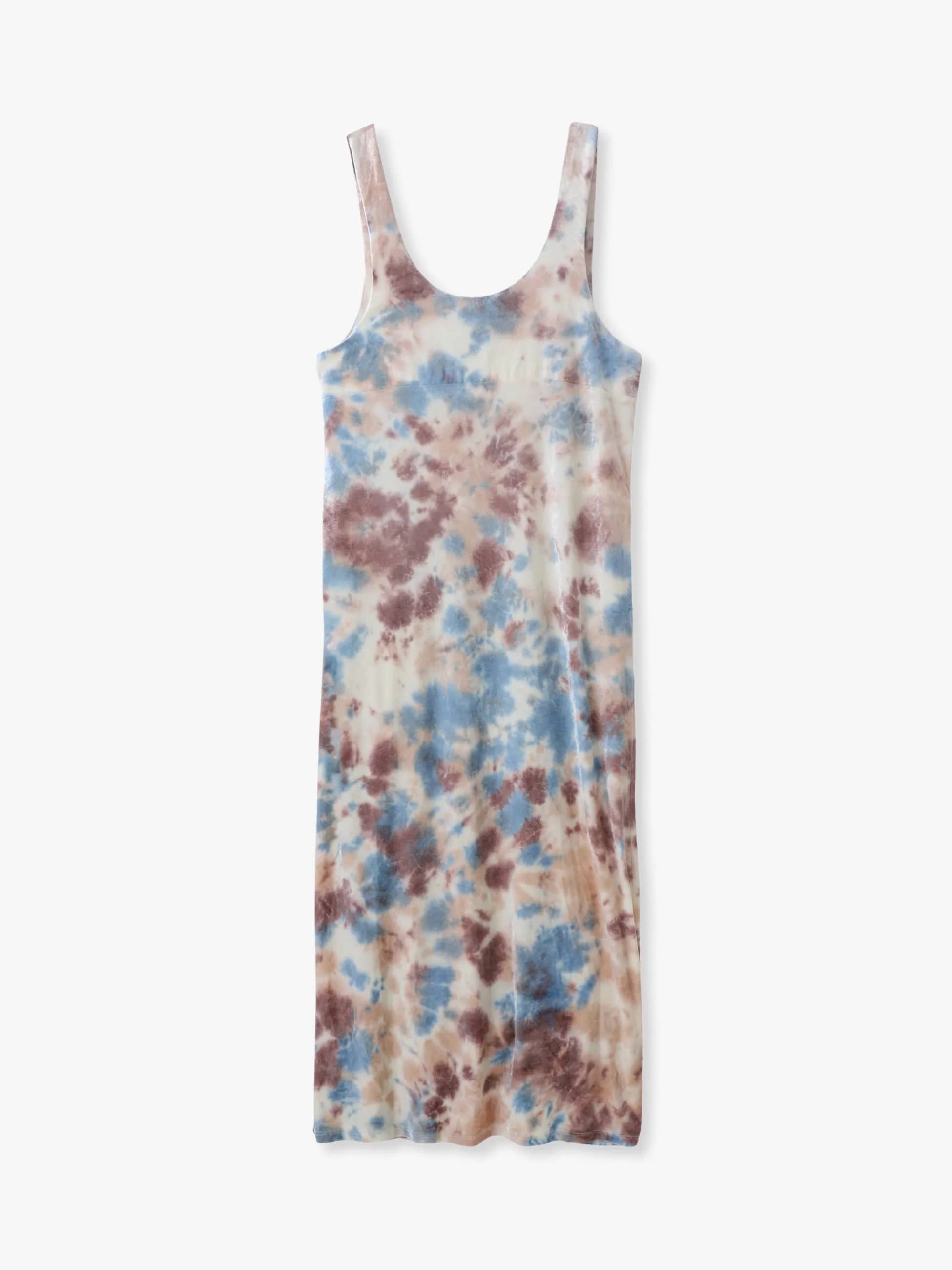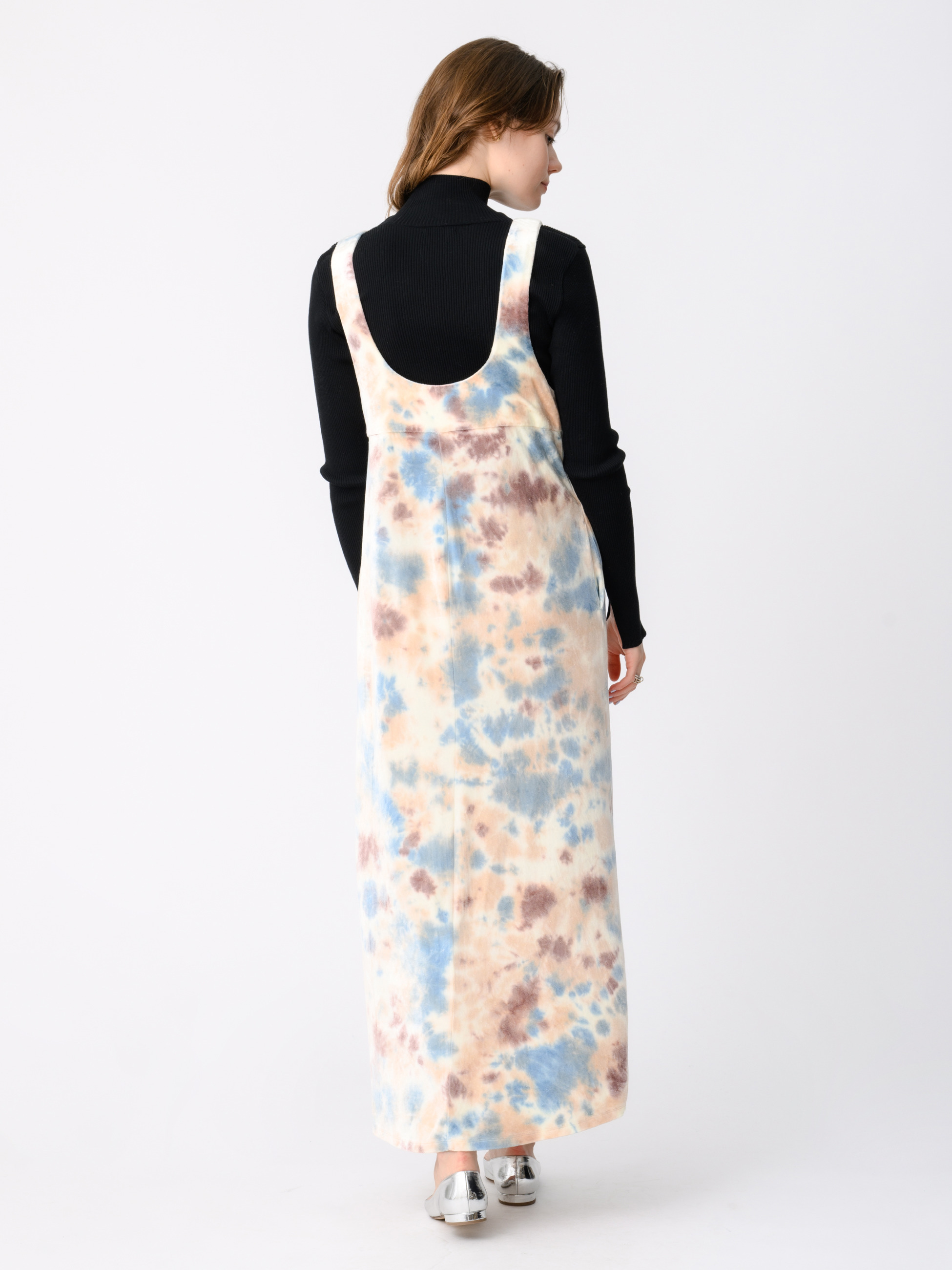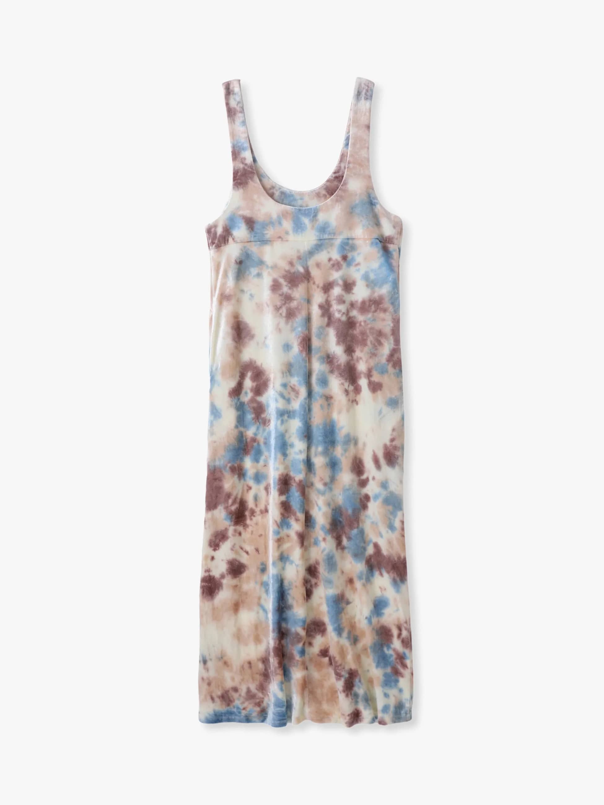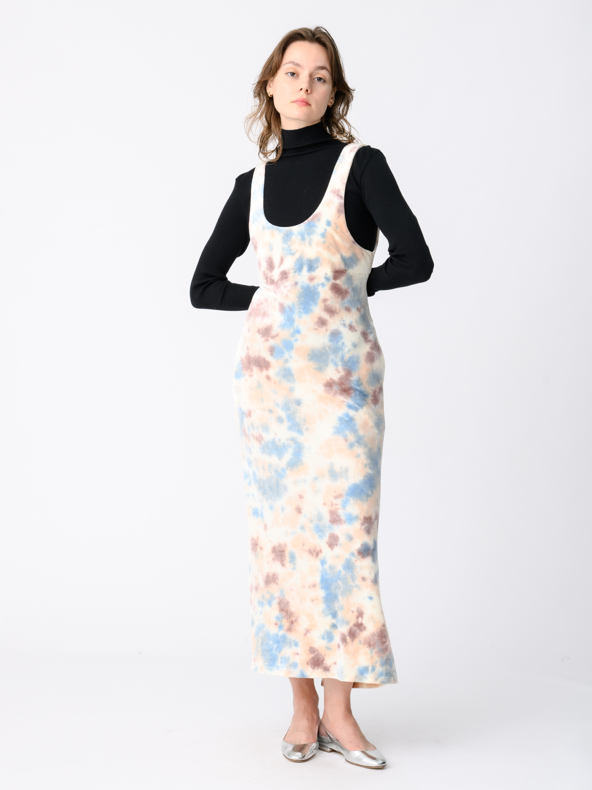 - 淡く柔らかな色合いに仕上げたスリーブレスドレスは、ベロア生地の上品さと、タイダイの華やかさを持ち合わせた1着です。深めのネックラインが女性らしく、美しいデコルテラインを演出します。シーズンにあわせたインナーとのレイヤードや、スウェットやニットなどを上から重ねたスタイリングもお楽しみいただけます。同シリーズのタイトスカートもございます。