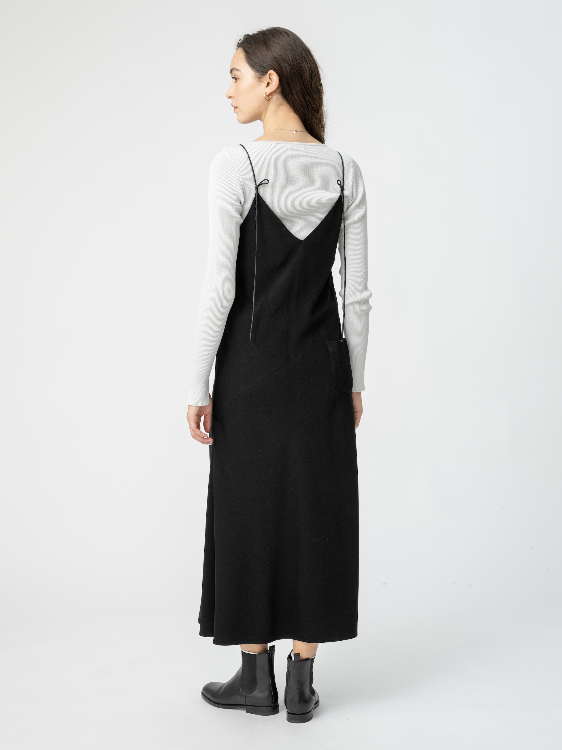 上品な光沢が女性らしさを惹きたてるサテン素材のキャミソールドレスは、程よく身体に馴染み、動くたびに美しいシルエットを演出します。ポリエステル混でシワになりにくいのも嬉しいポイントです。インナーにギザボートネックプルオーバーを合わせたり、オーバーサイズのニットやスウェットを上からかぶせスカートのように合わせるスタイリングも素敵です。同シリーズのサテンスカートもございます。