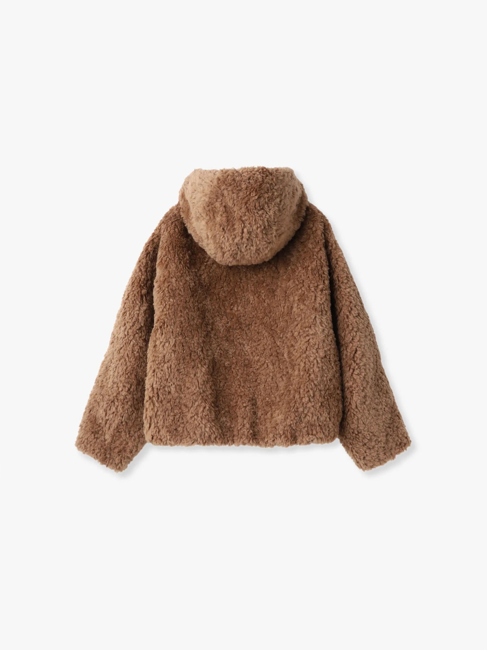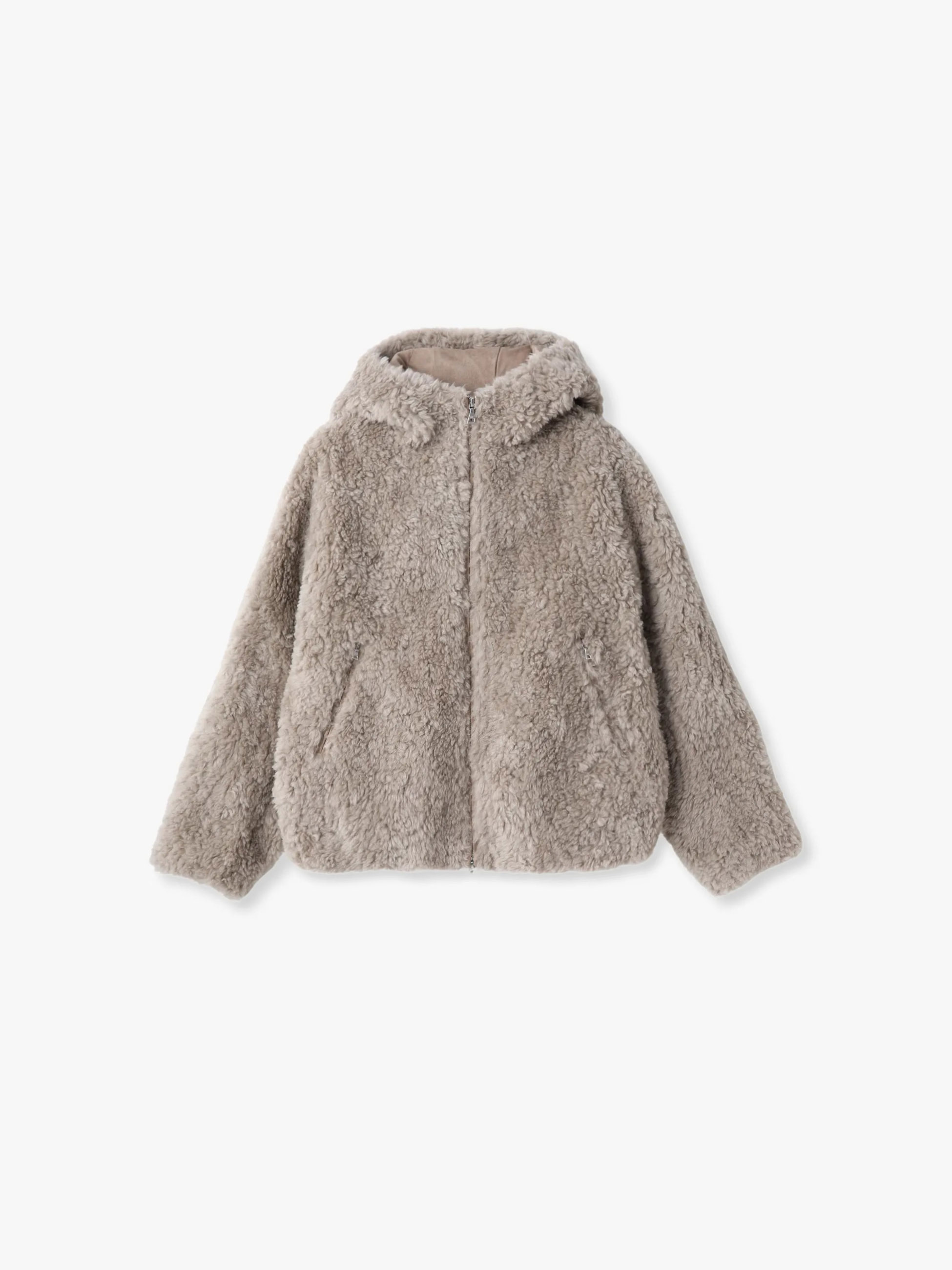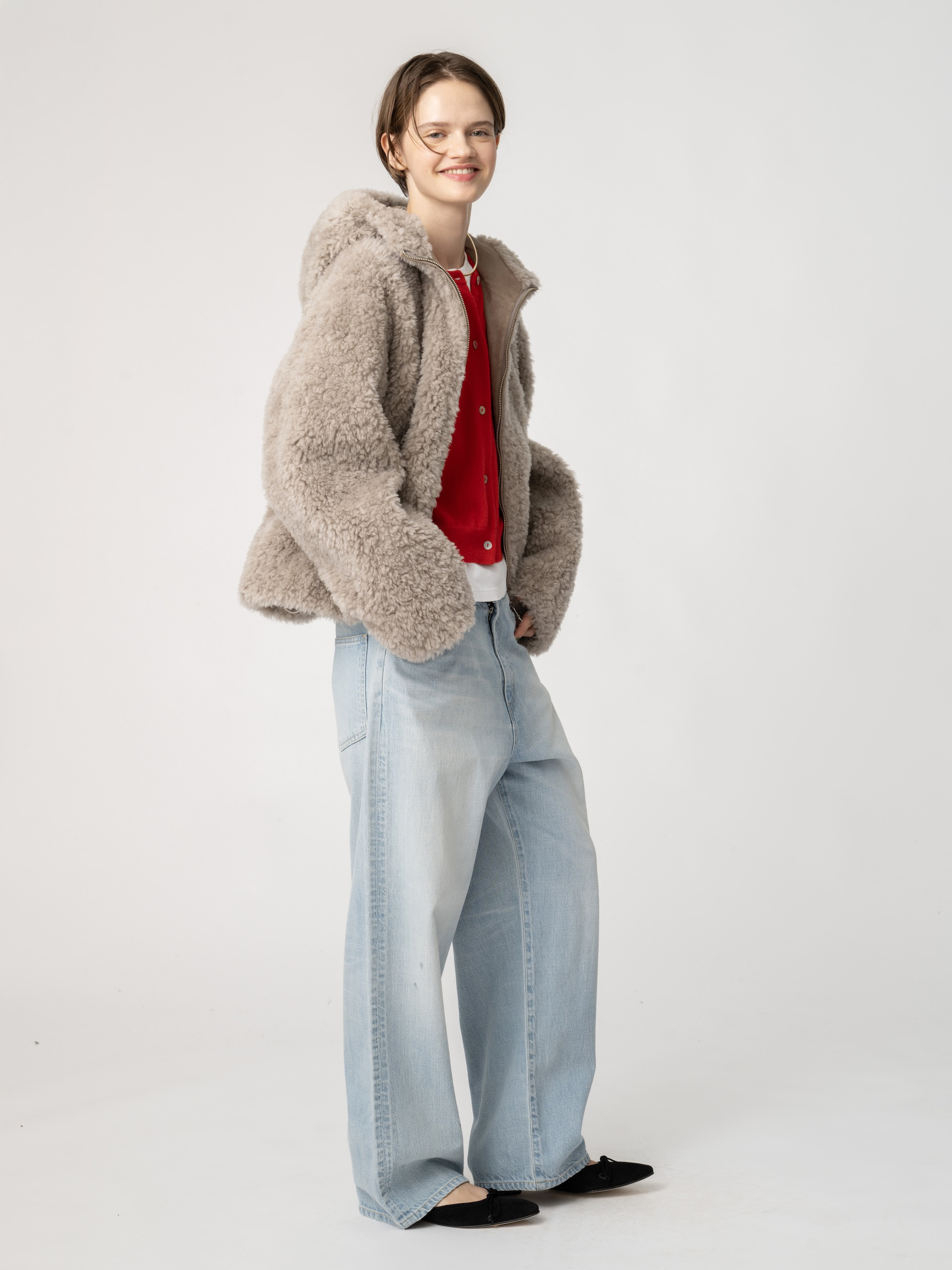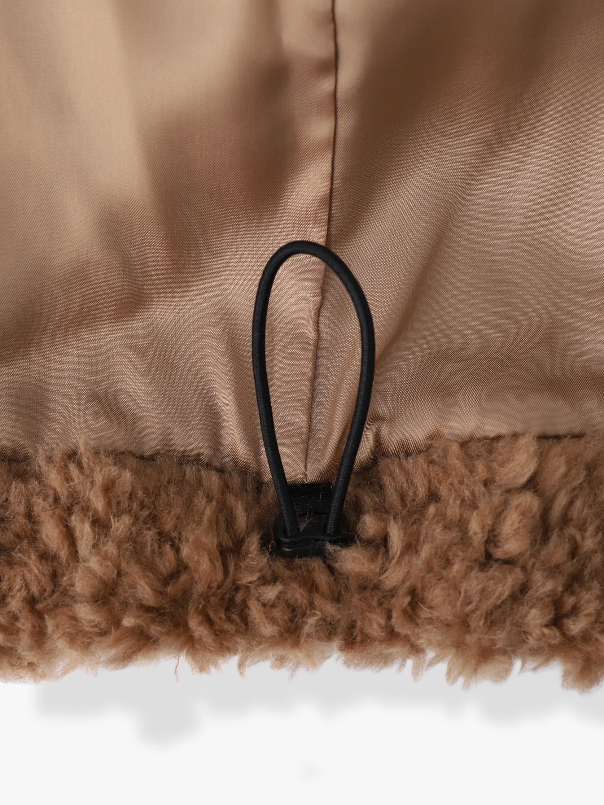 - 長めの毛足を使用したウール100%のボアジャケットは、見た目にもあたたかく軽い着心地が特徴です。首元までしっかり防寒できるフードブルゾンのデザインは、裾のドローコードでシルエットの変化も楽しむことができ、スタイリングのバランスも取りやすい着丈にもこだわった一枚です。