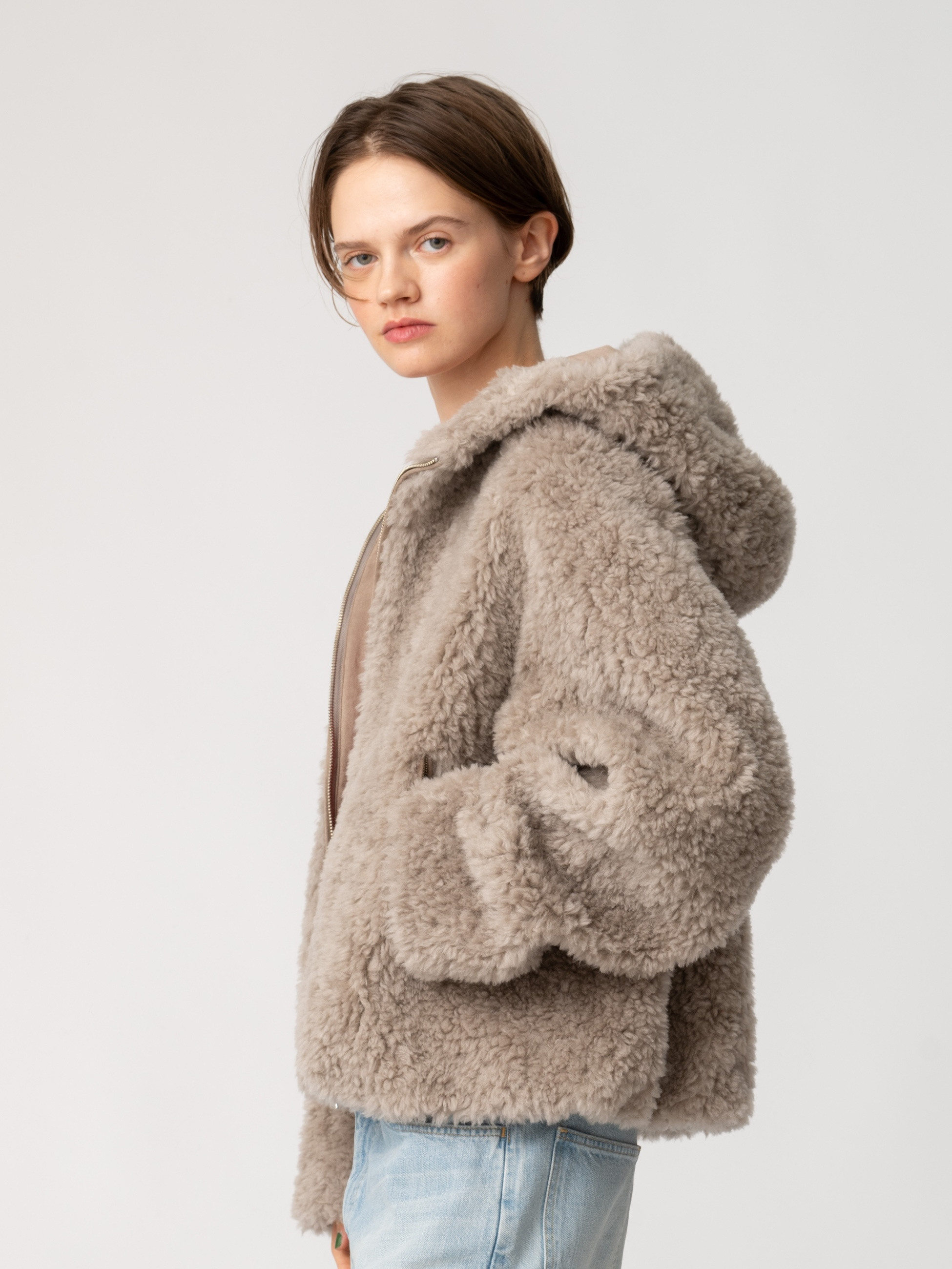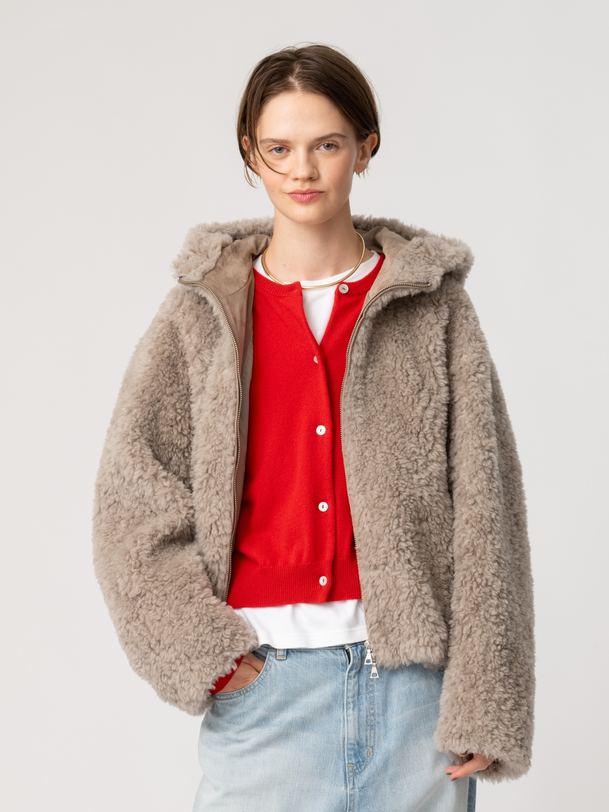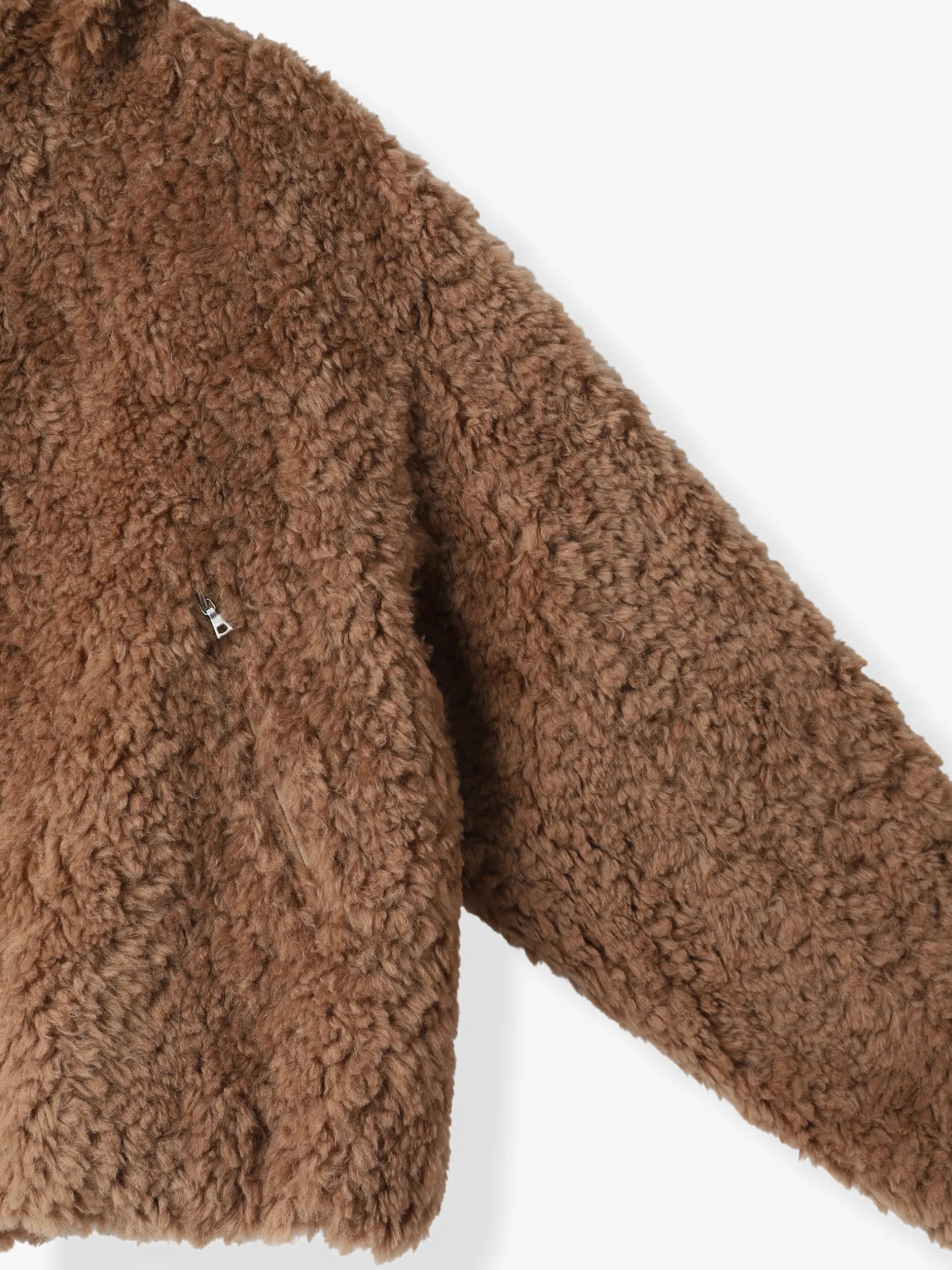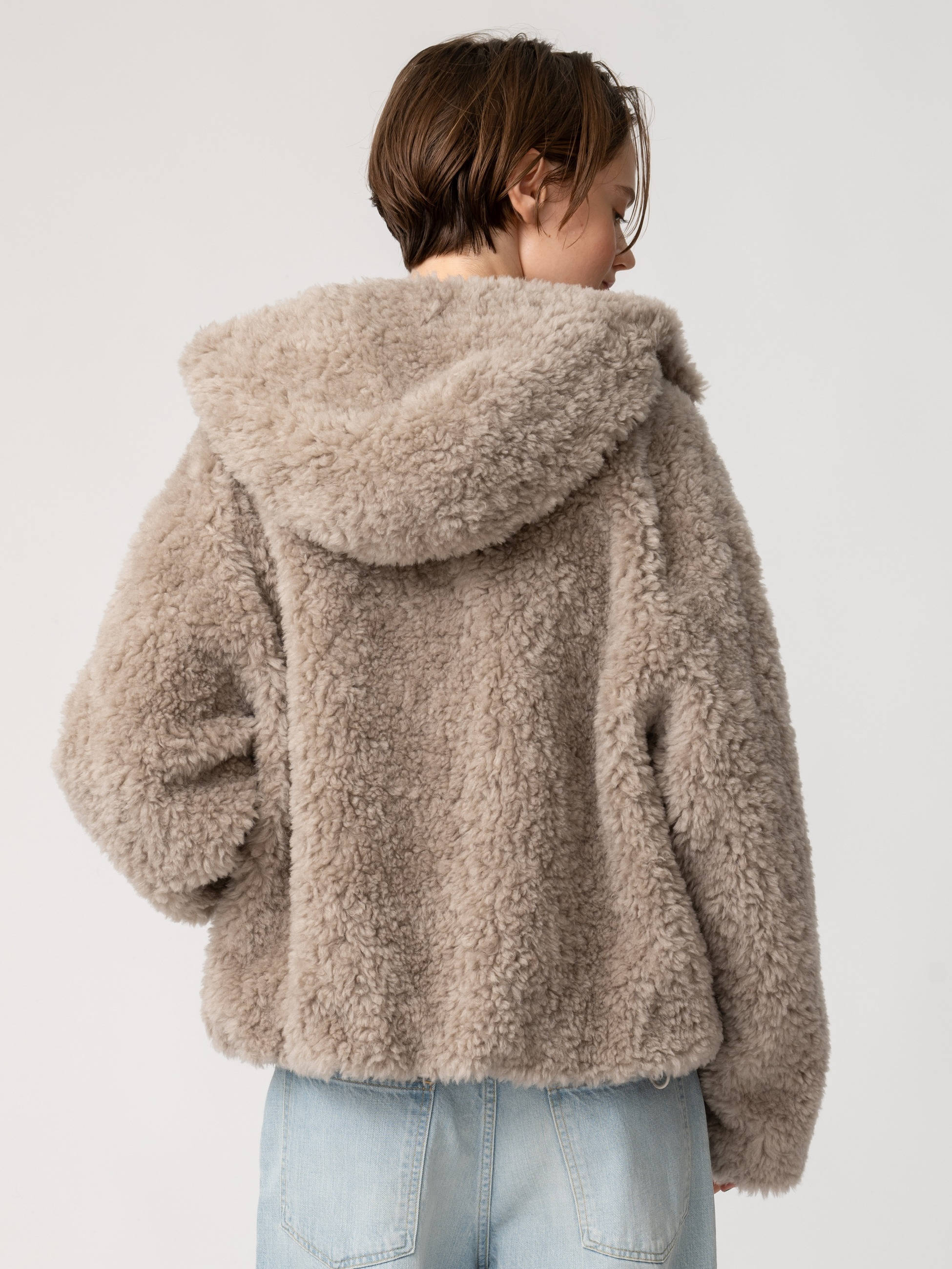 - 長めの毛足を使用したウール100%のボアジャケットは、見た目にもあたたかく軽い着心地が特徴です。首元までしっかり防寒できるフードブルゾンのデザインは、裾のドローコードでシルエットの変化も楽しむことができ、スタイリングのバランスも取りやすい着丈にもこだわった一枚です。