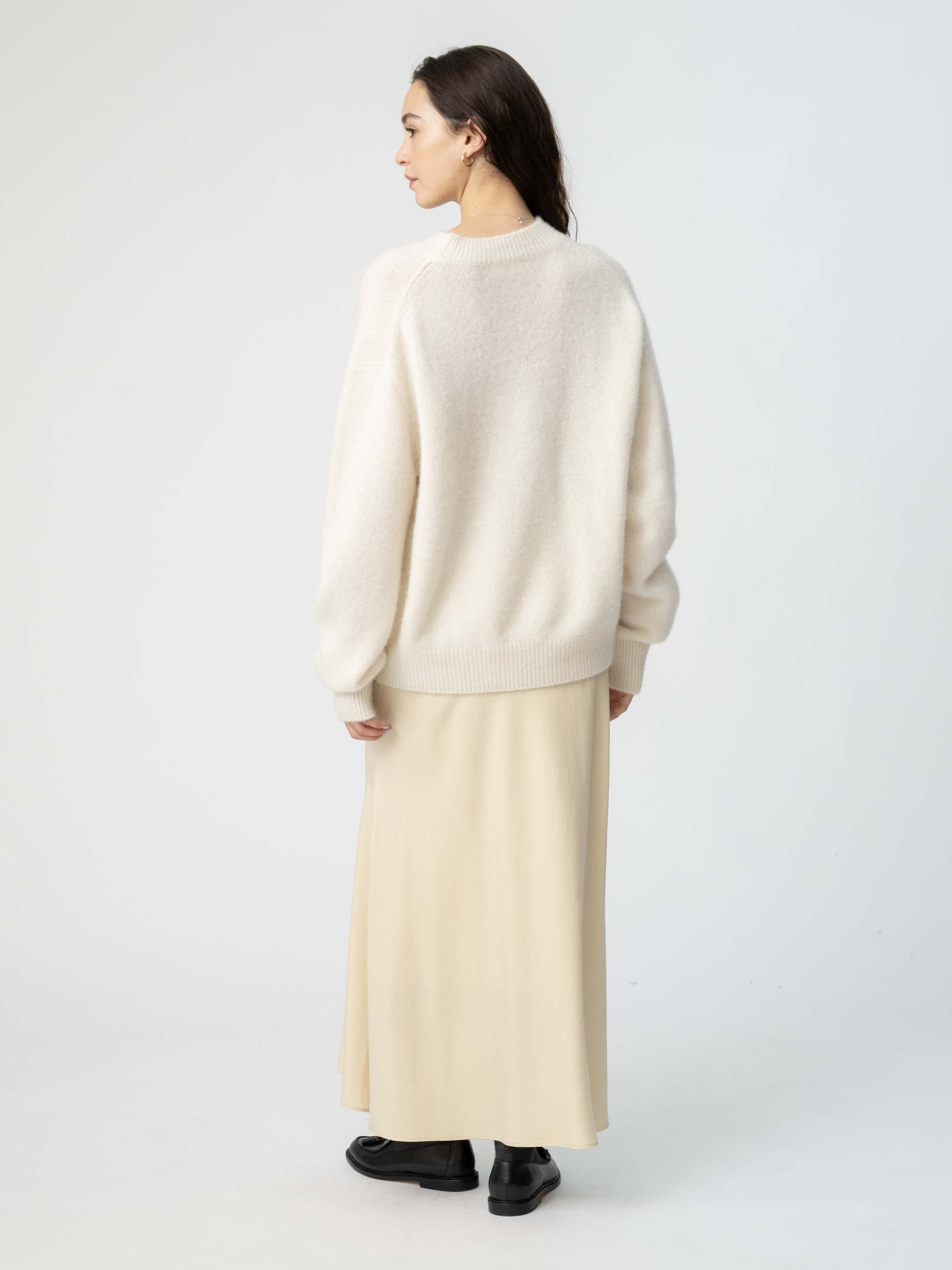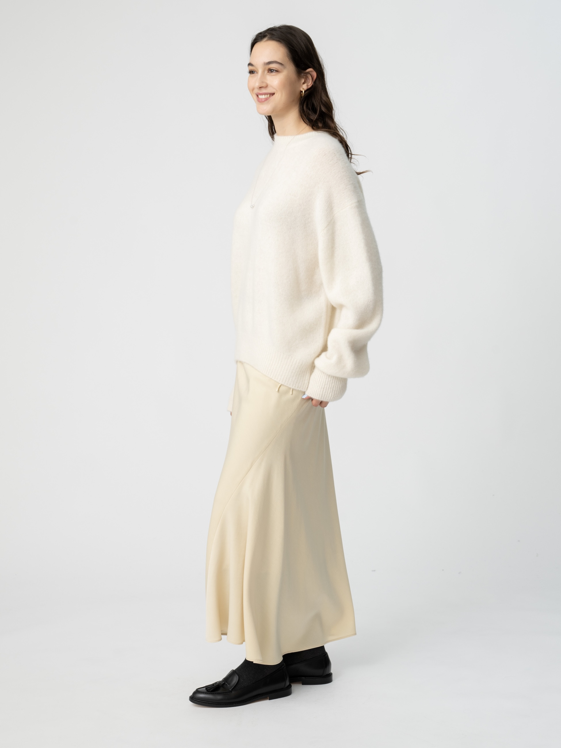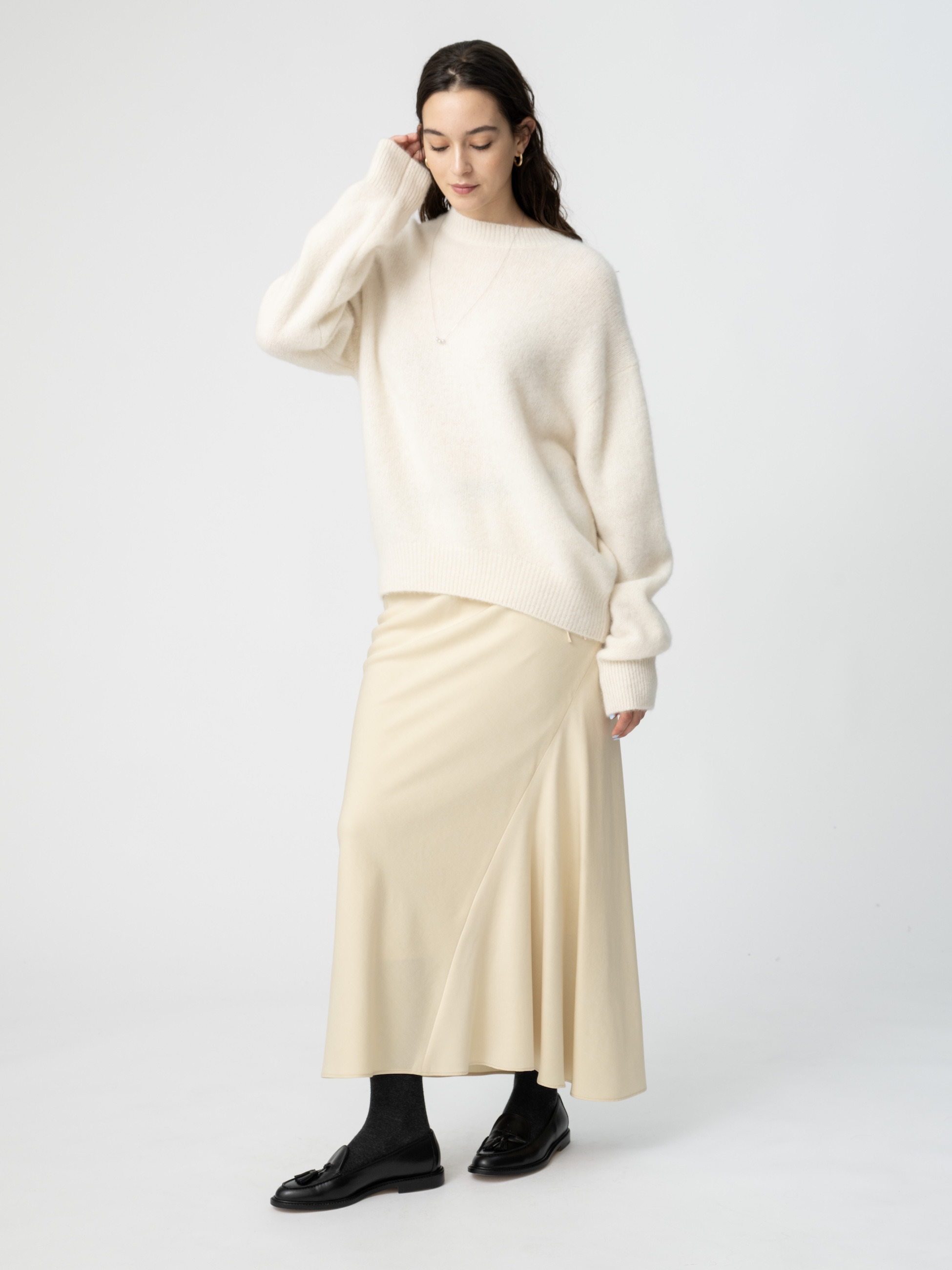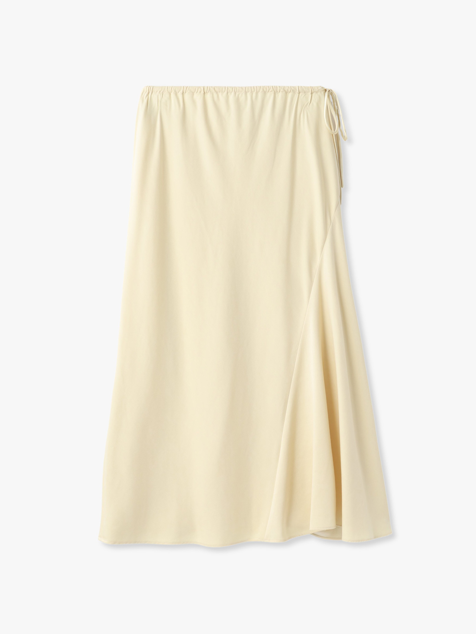 上品な光沢が女性らしさを惹きたてるサテン素材のロングスカートは、アシンメトリーに施されたラインが、動くたびに美しいシルエットを演出します。ポリエステル混でシワになりにくいのも嬉しいポイントです。トップスにはオーバーサイズのニットやスウェットを合わせるスタイリングも素敵で、ホリデーシーズンのお出かけ着としても活躍します。