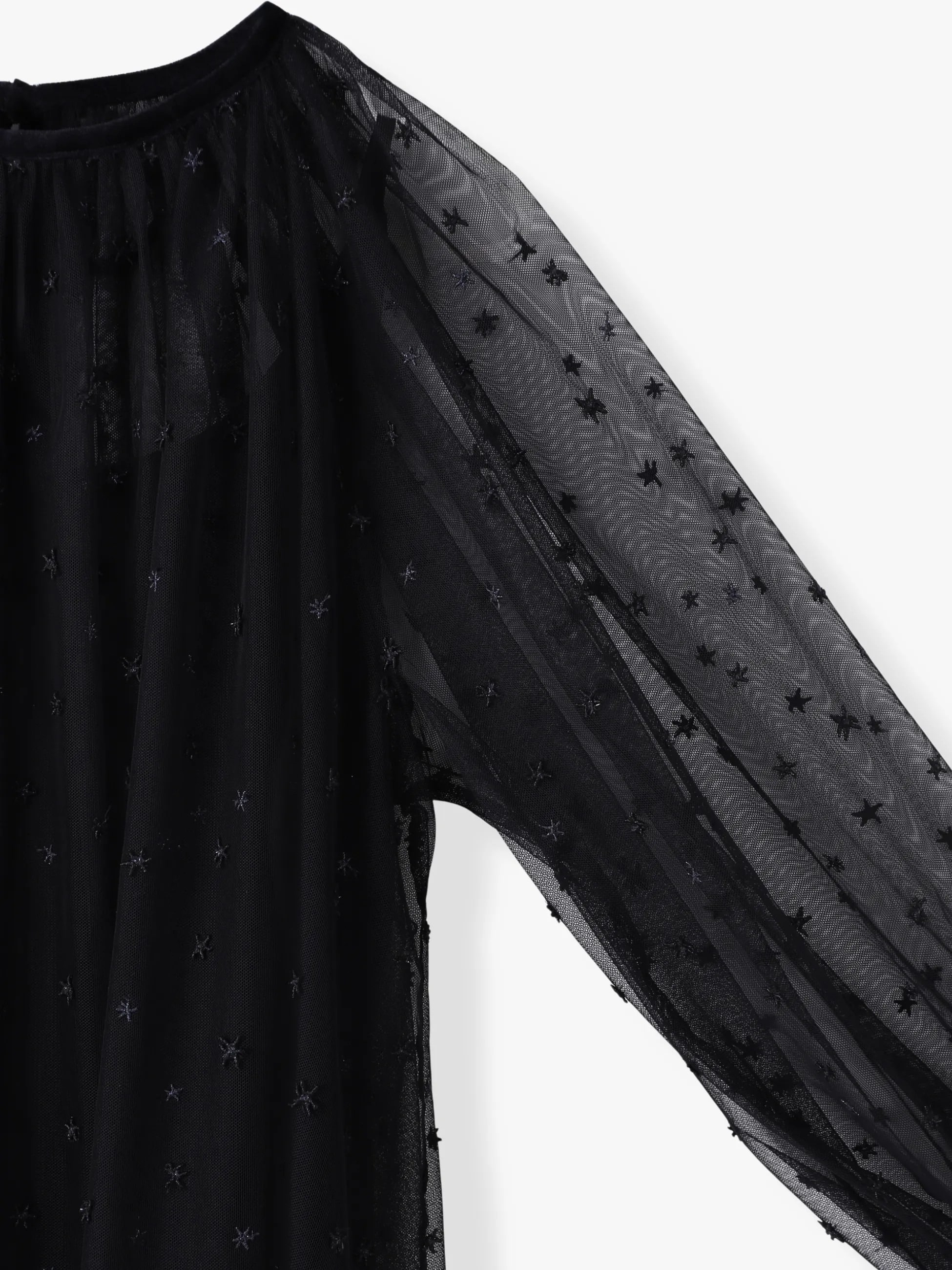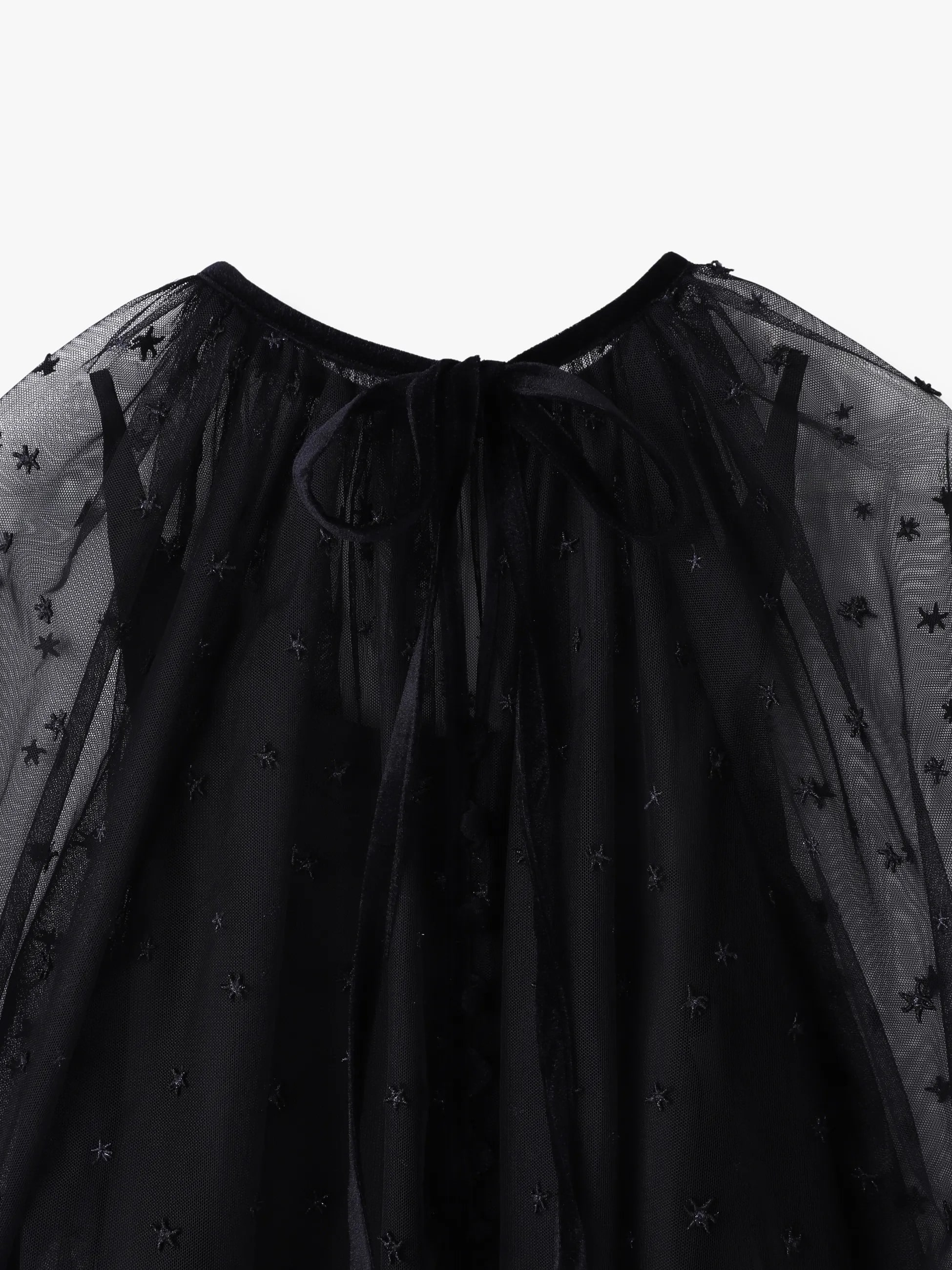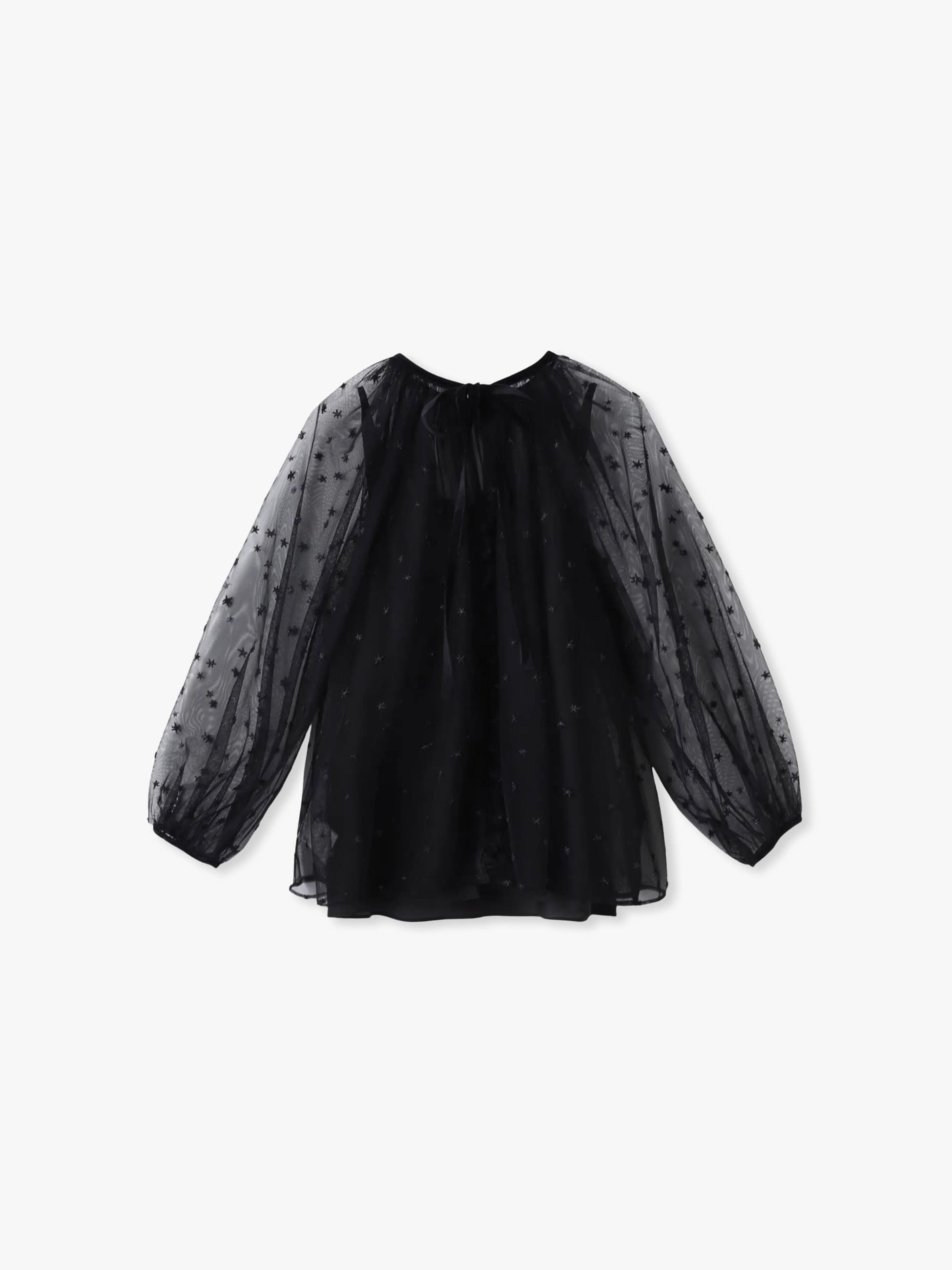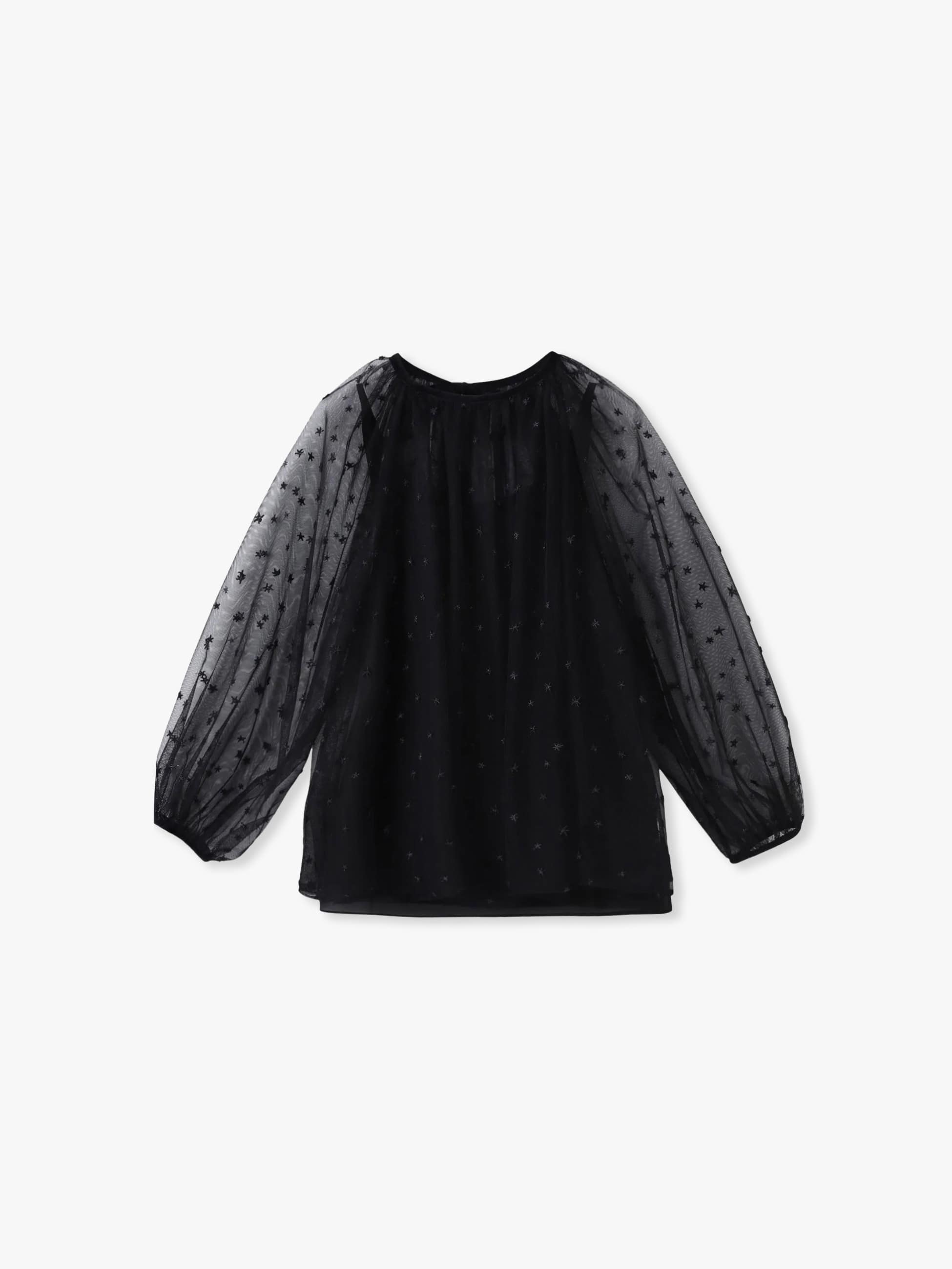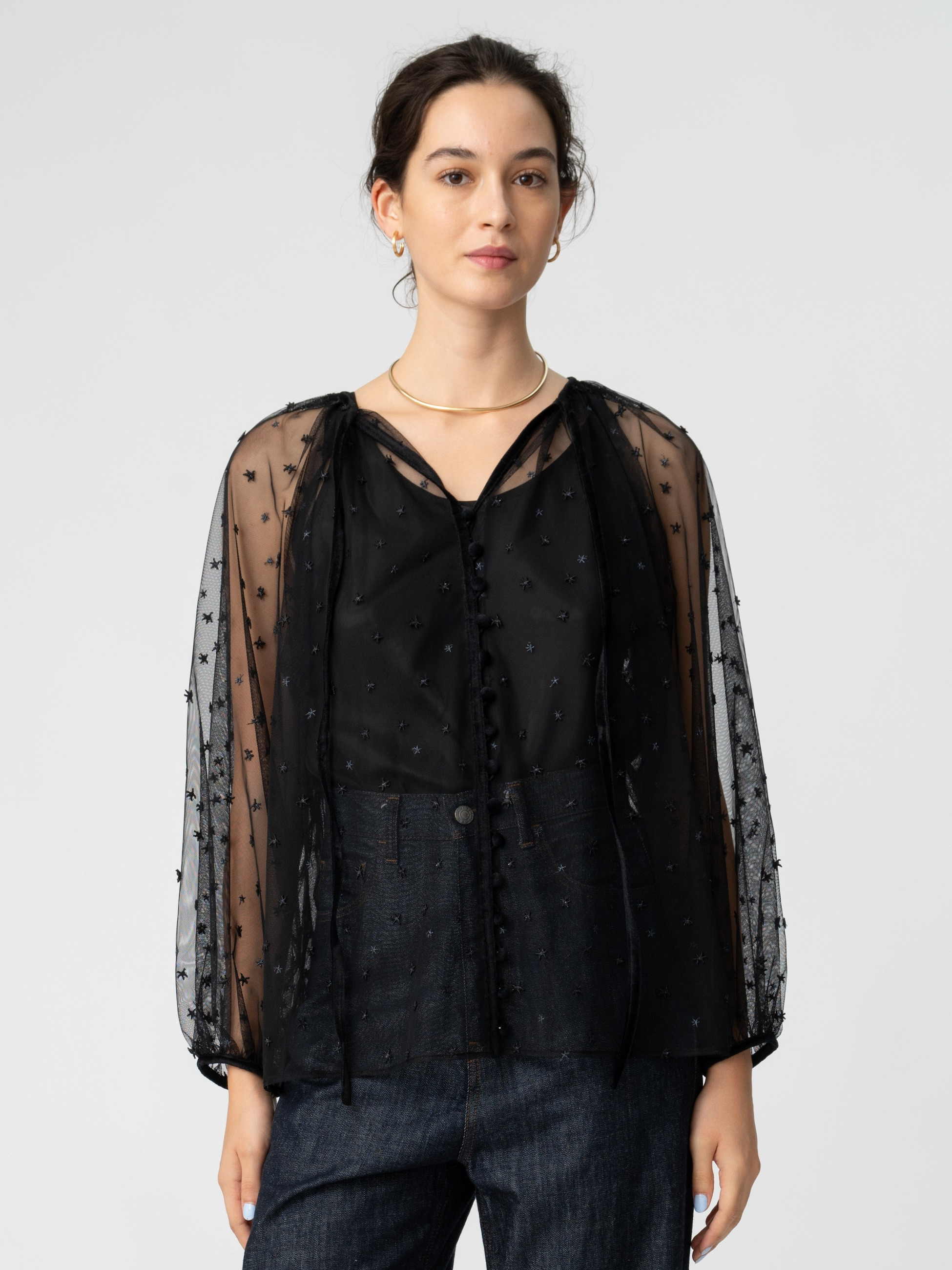- 立体的な星の刺繍を全面に施した華やかなチュールブラウスは、真夜中に輝く星空をイメージして仕立てられたロンハーマンオリジナル素材を使用しています。ブラウスは前後どちらでも着ることのできる2WAY仕様で、シンプルなペンシルスカートを合わせた、オケージョンにぴったりのスタイリングや、デニムパンツを合わせ日常に溶け込むカジュアルなスタイリングも素敵です。同シリーズのチュールスカートもございます。