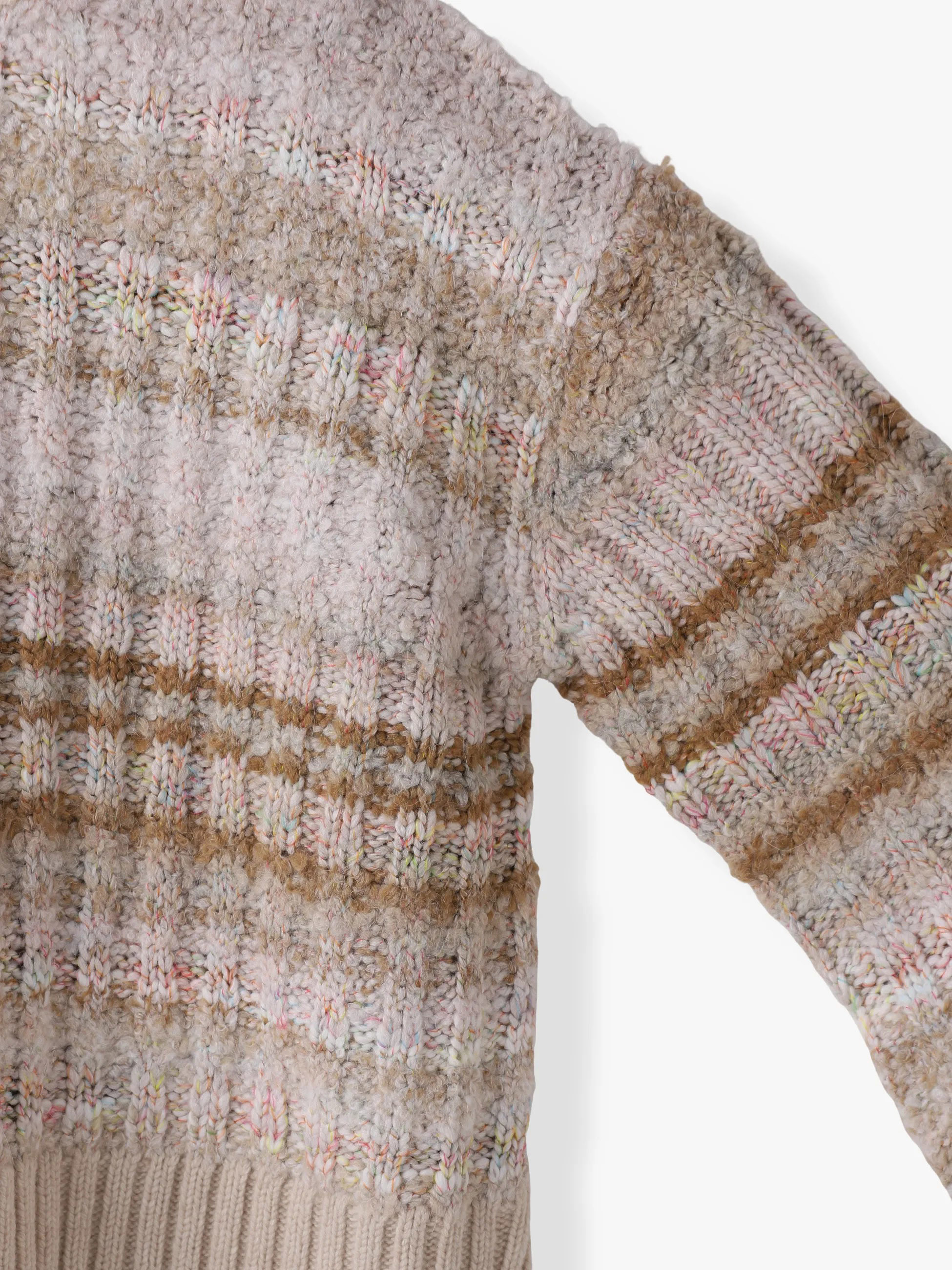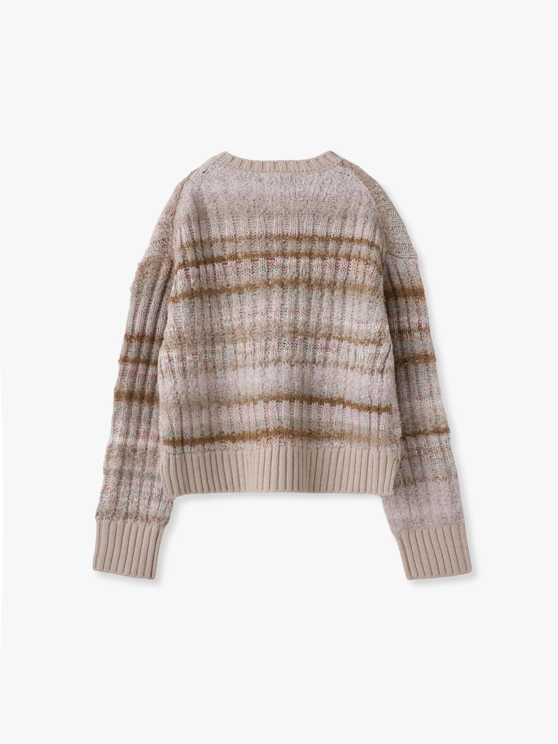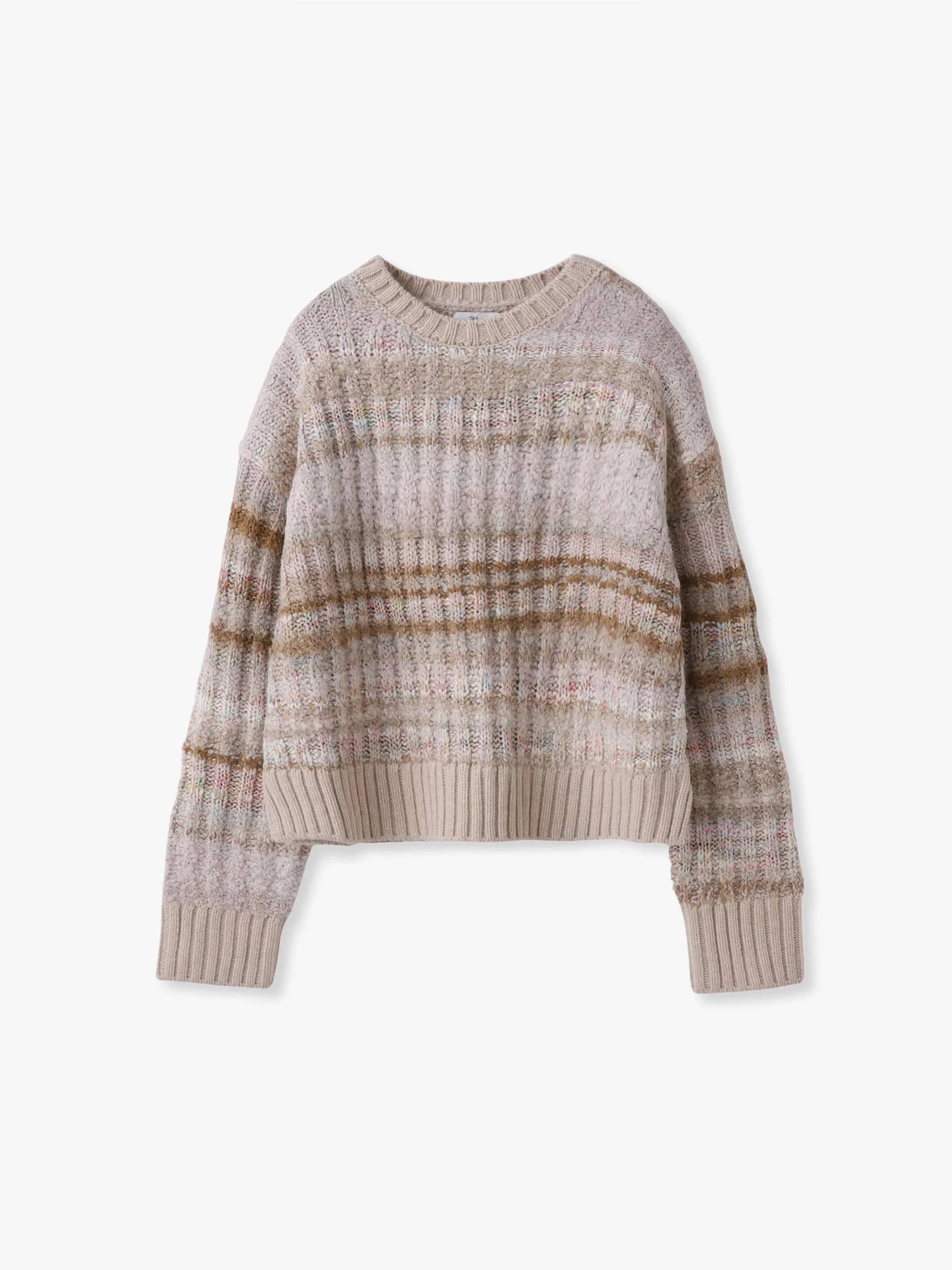 - ランダムなボーダー柄の浮き出るイタリアの糸を使用したニットプルオーバーは、ナチュラルな色味の中にピンクやブラウンなど様々なカラーの混じった配色が柔らかな雰囲気を引き立てます。ボトムスにはホワイトデニムやコーデュロイワークパンツと合わせたワントーンカラーの女性らしいスタイリングもおすすめです。