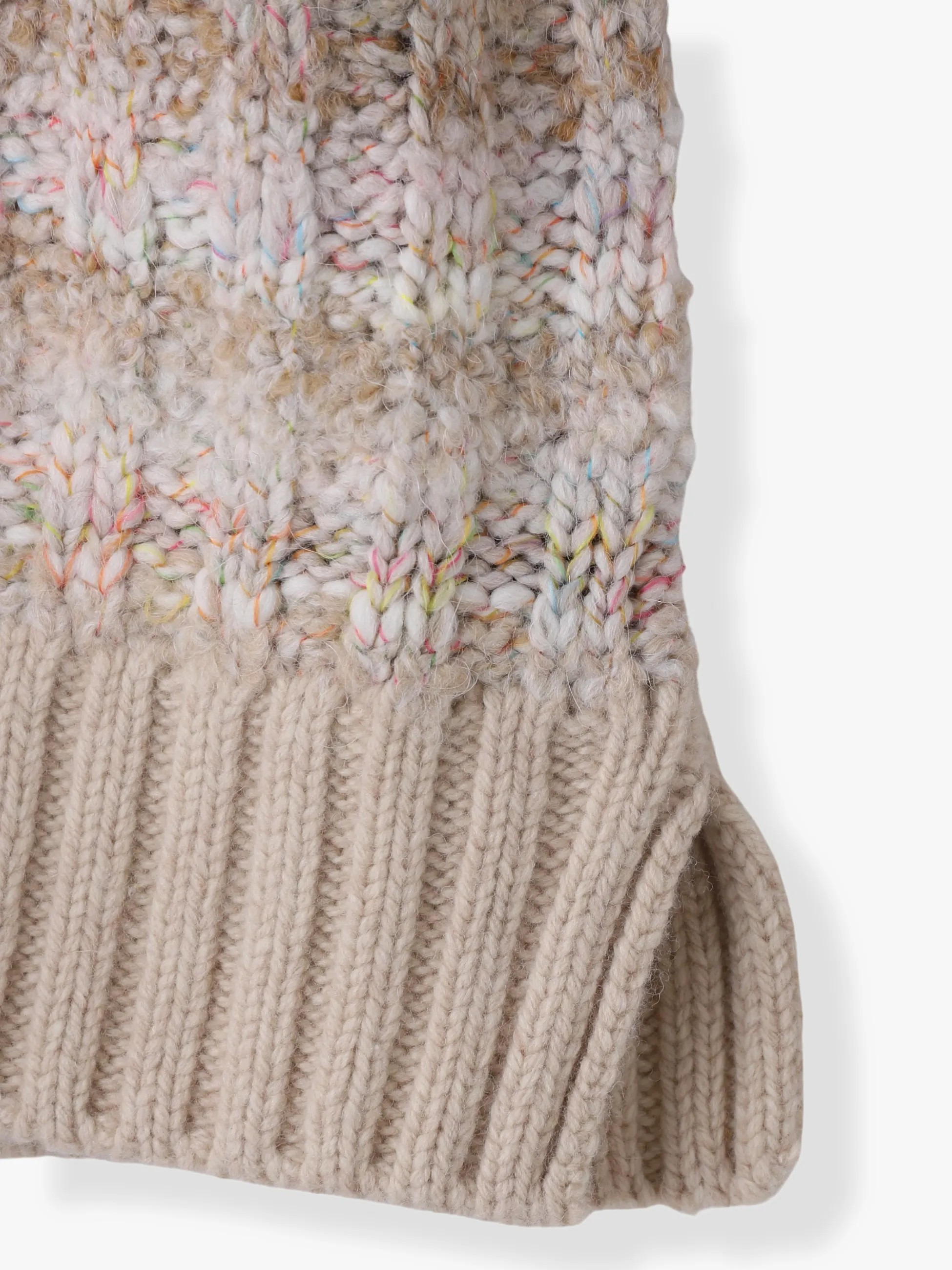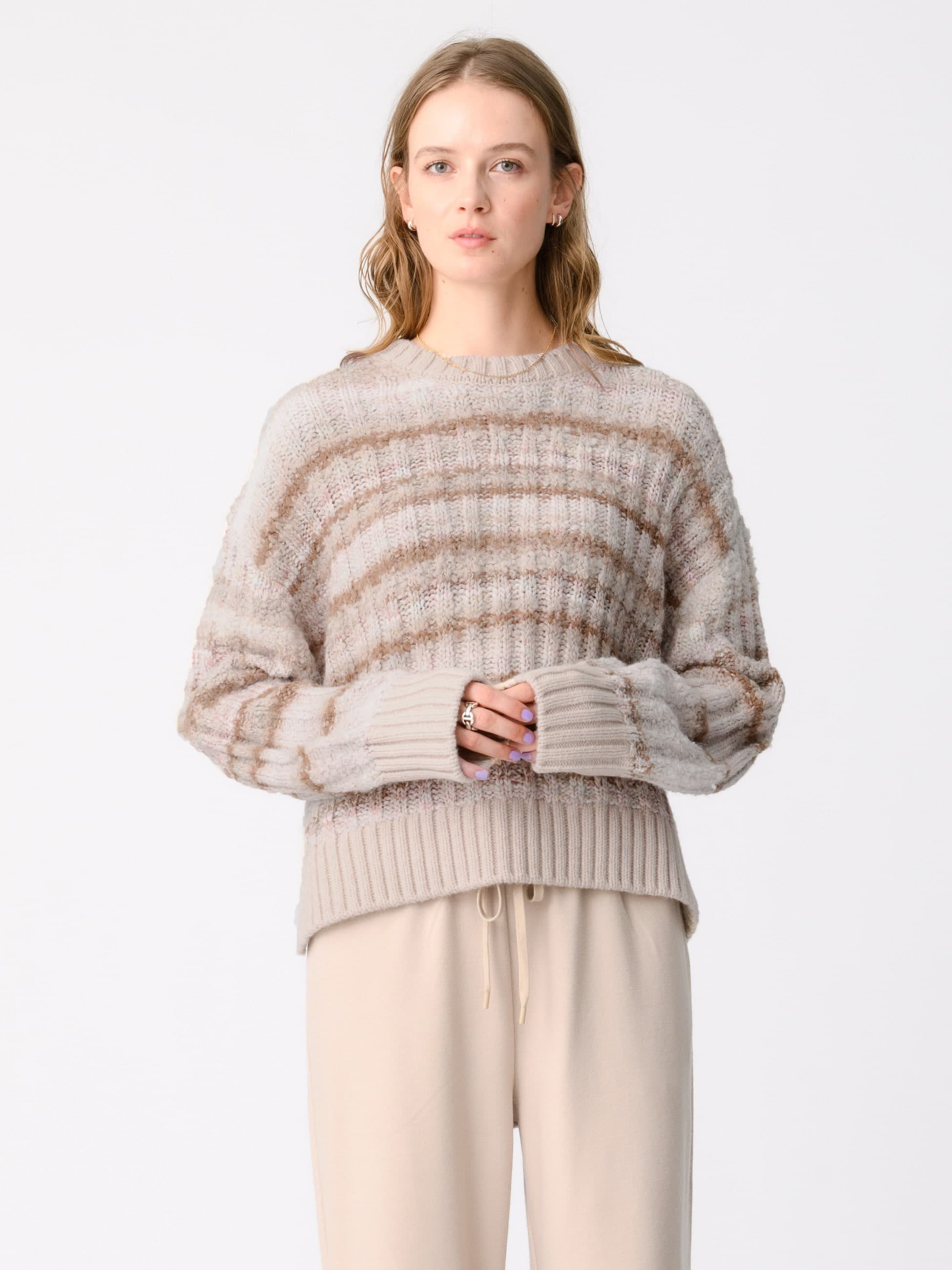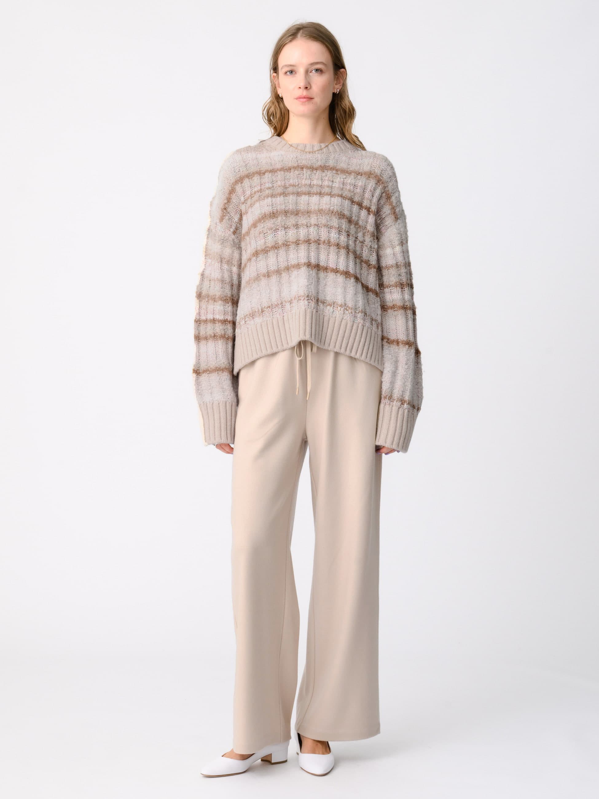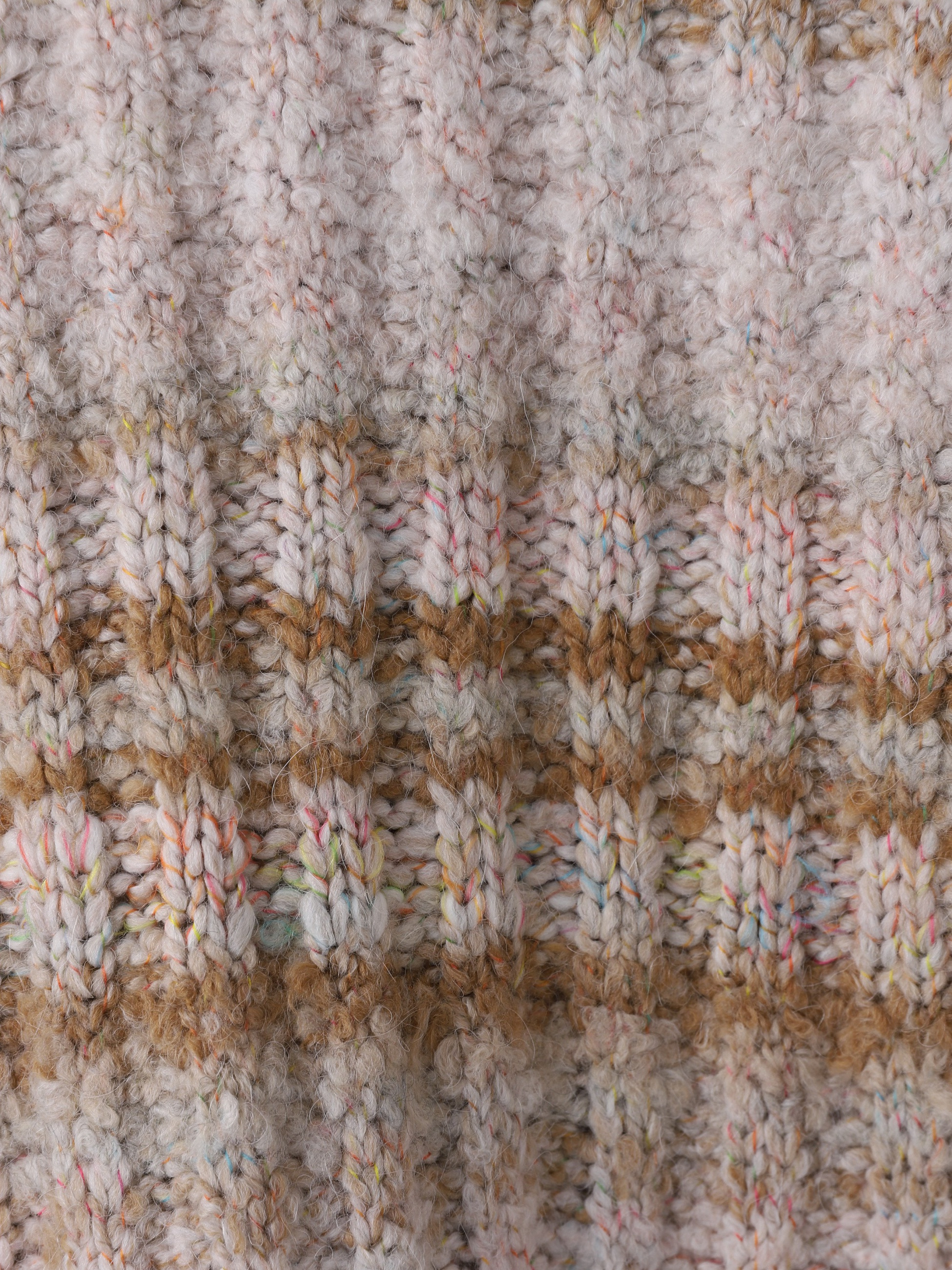 - ランダムなボーダー柄の浮き出るイタリアの糸を使用したニットプルオーバーは、ナチュラルな色味の中にピンクやブラウンなど様々なカラーの混じった配色が柔らかな雰囲気を引き立てます。ボトムスにはホワイトデニムやコーデュロイワークパンツと合わせたワントーンカラーの女性らしいスタイリングもおすすめです。