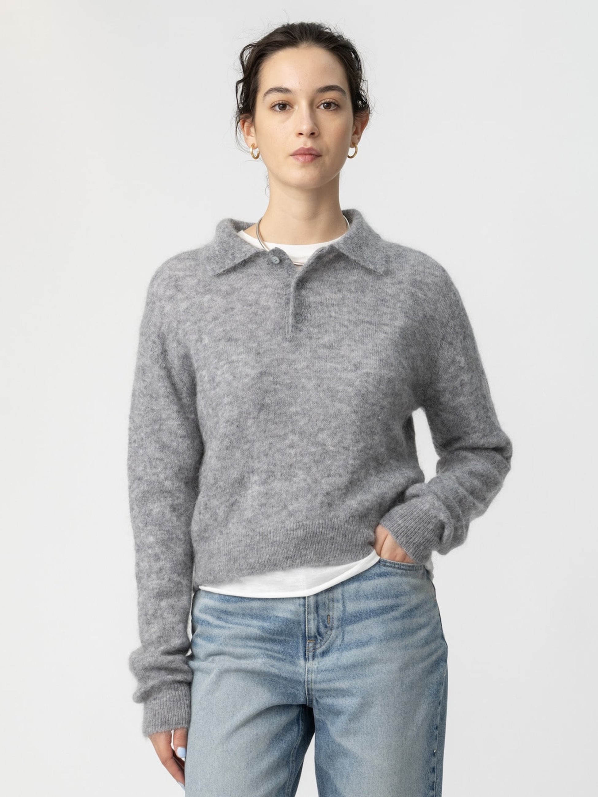 - ふわふわとした肌触りが心地よいモヘア素材を使用した、可愛らしい印象のポロニットトップスです。シンプルなブラック、ホリデーシーズンにぴったりなレッド、爽やかなライトブルーの3色展開です。コンパクトな着丈は、ハイウエストのボトムスとも好相性で、シンプルなスタイリングに女性らしさをプラスします。