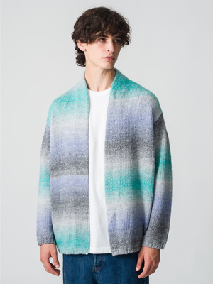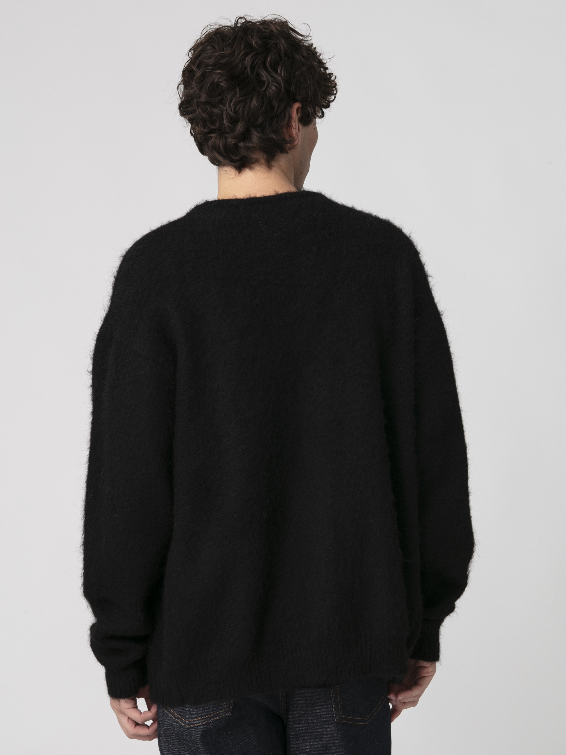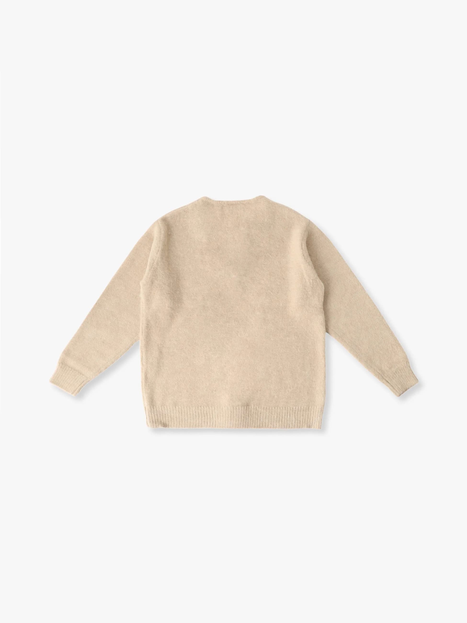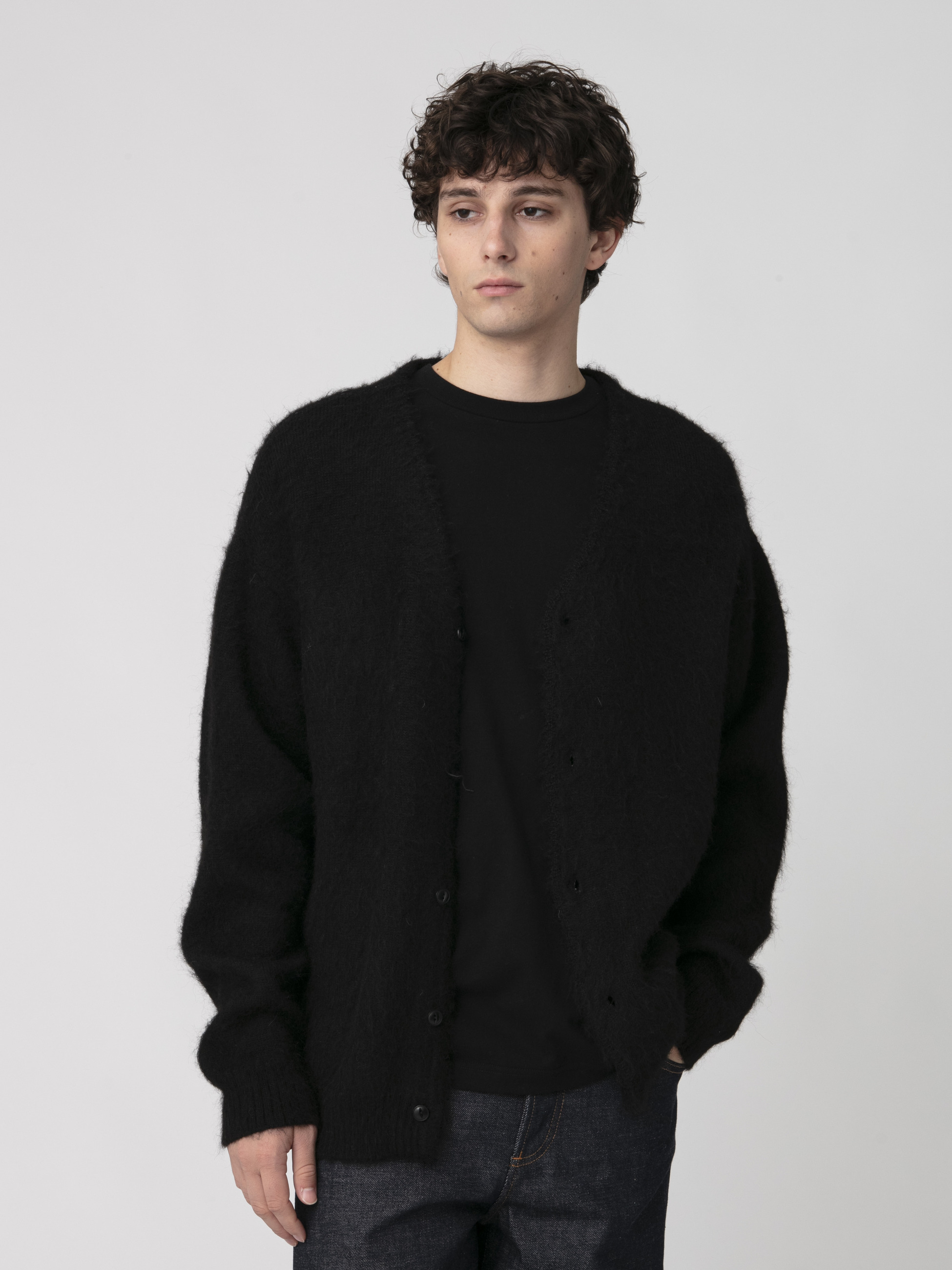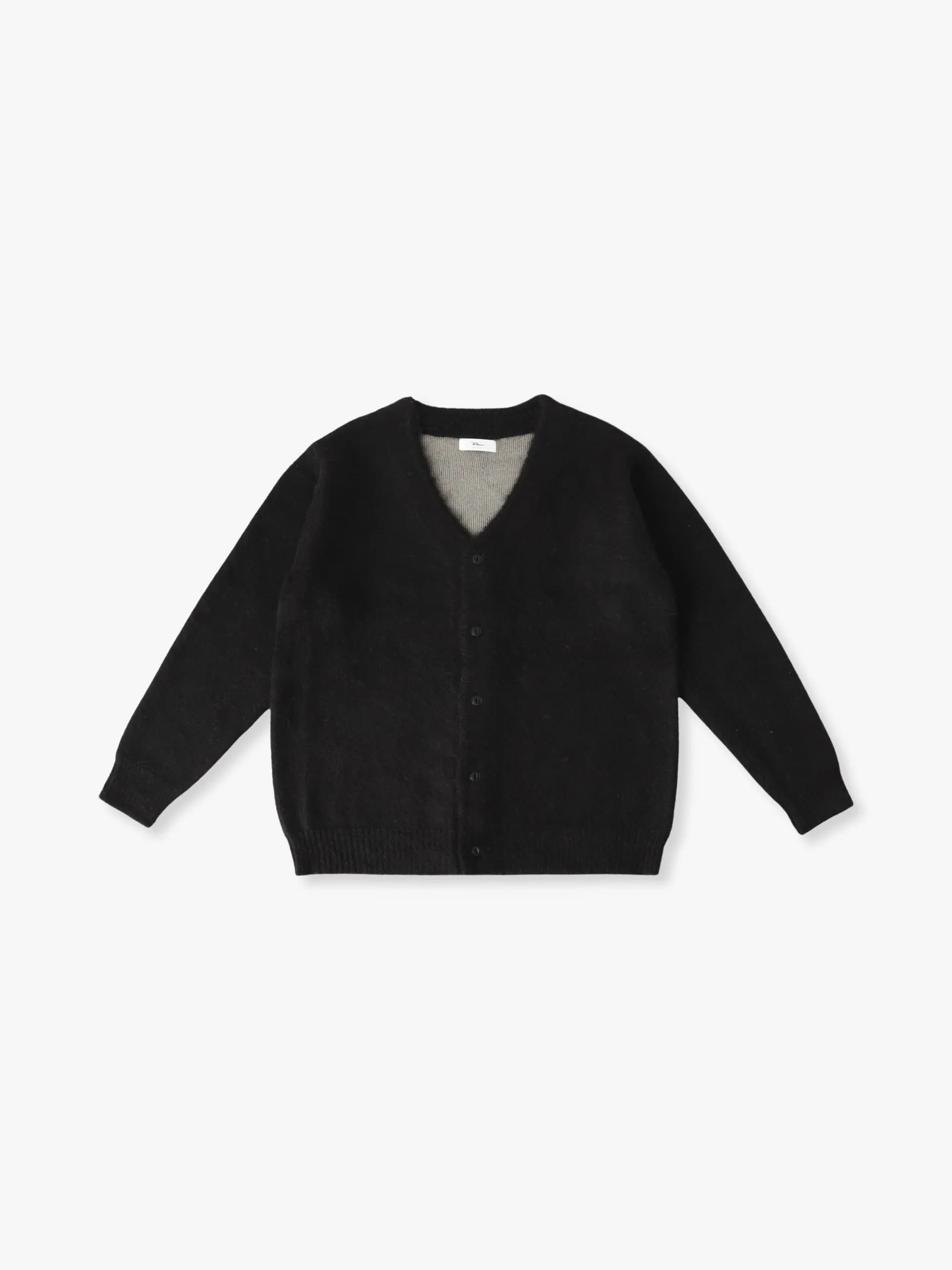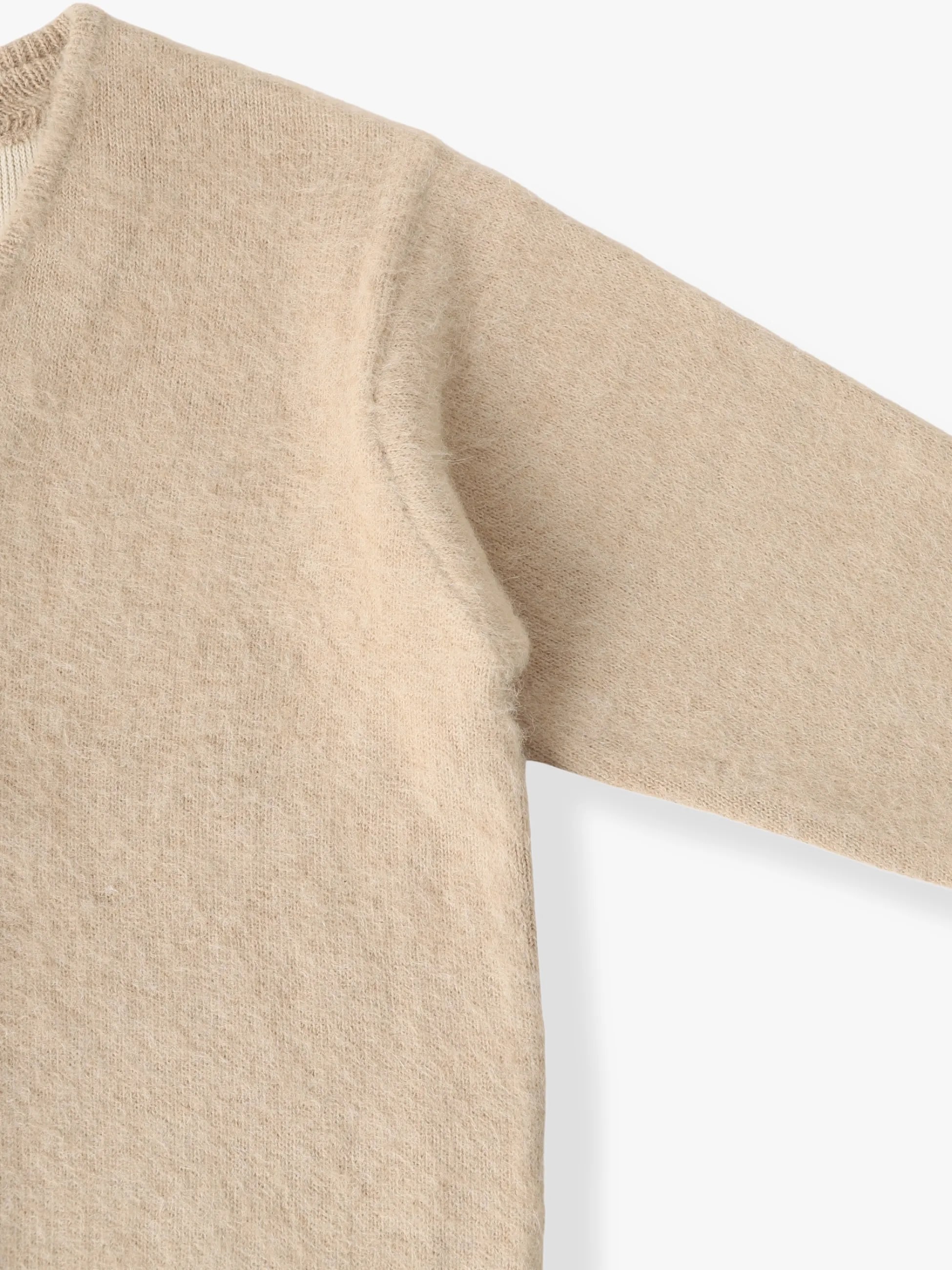 表面には無染色のアンゴラ糸と裏面にはサリーフォックスの茶綿をプレーティングした生地を使用したニットカーディガン。プレーティングによる程よく厚みのある生地とアンゴラ糸によるふんわりとした柔らかな肌触りが特徴です。また、古き良きアメリカンデザインを採用したソリッドな表情も魅力のひとつ。程よくゆったりとしたフィットは、デイリーユースしやすい一着です。