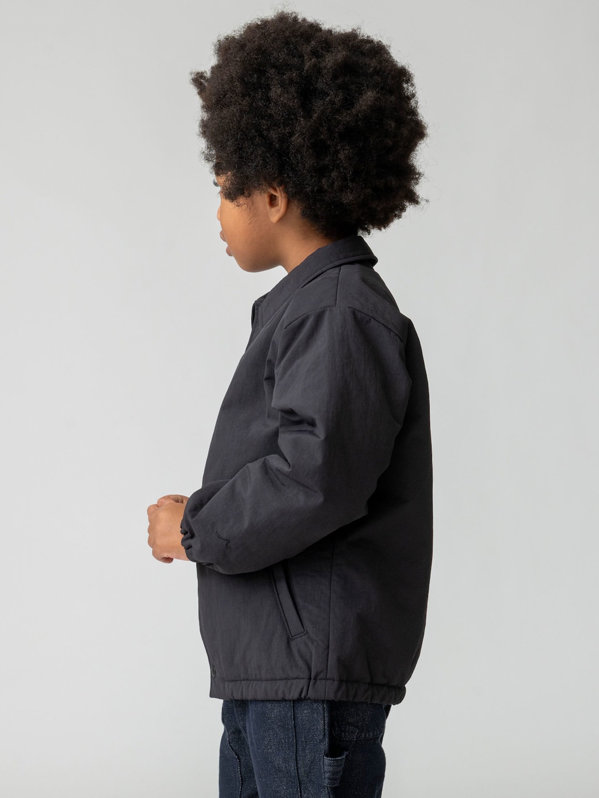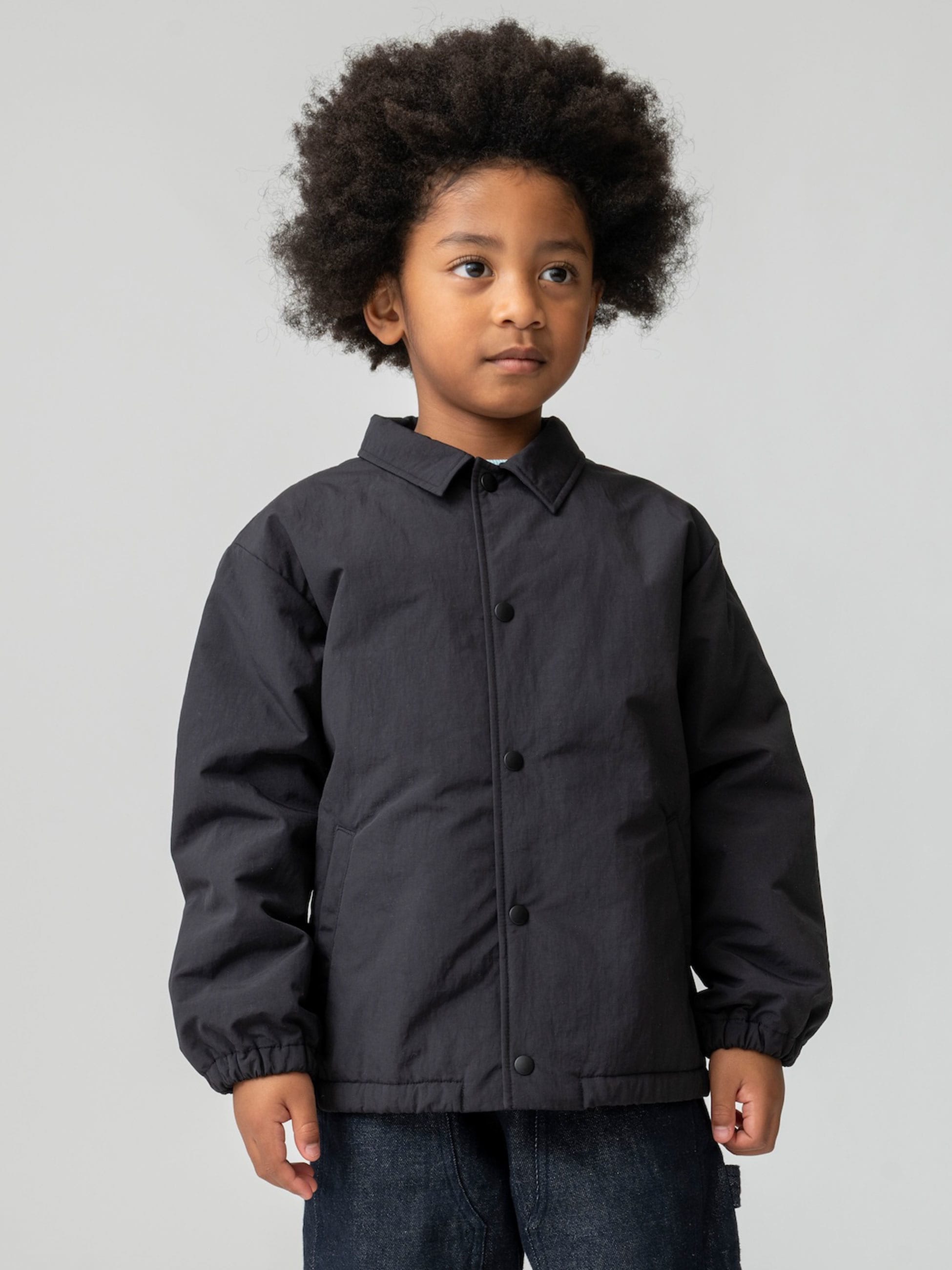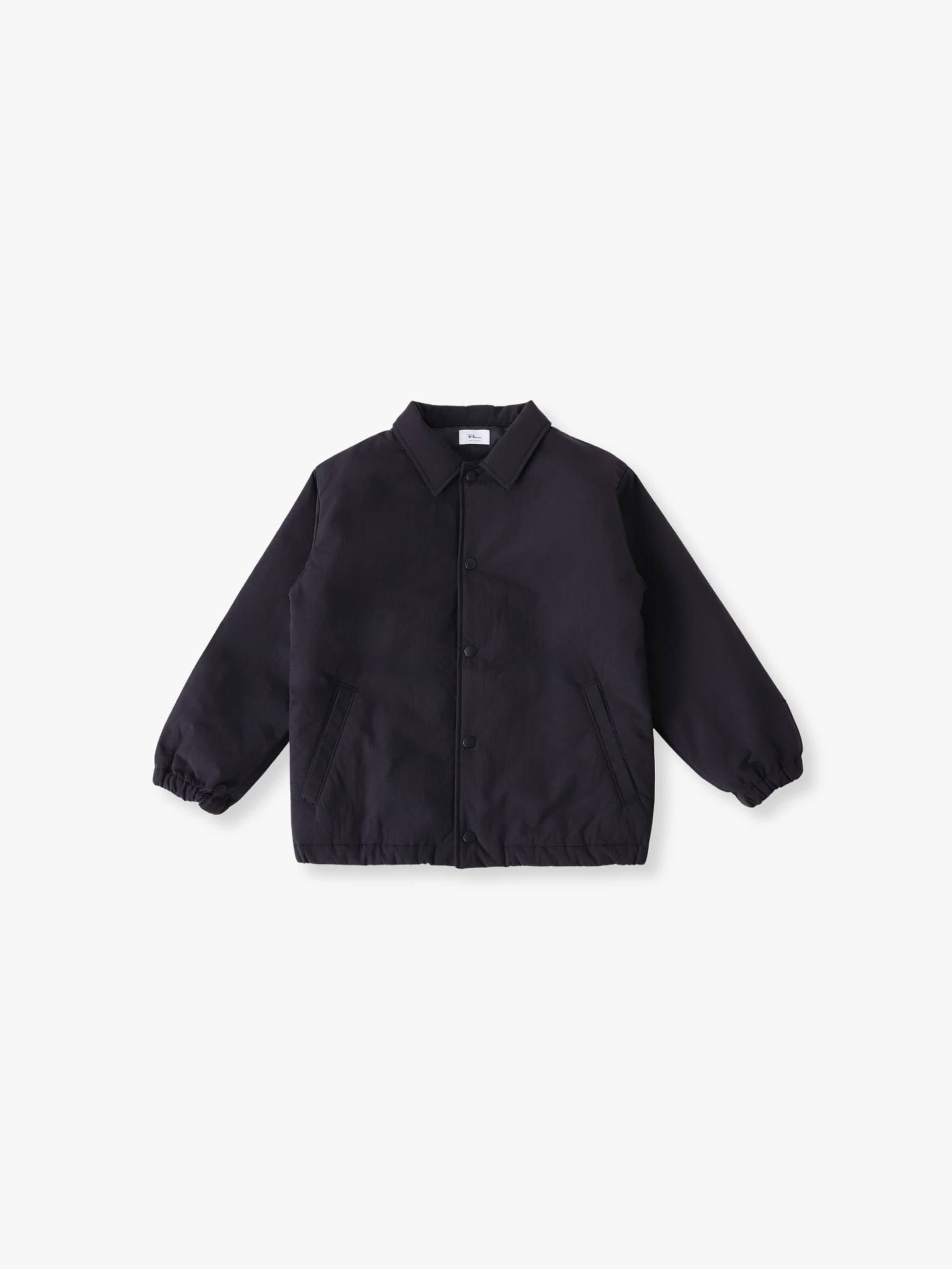軽くてあたたかい中綿入りのコーチジャケットは、動きやすいシルエットに、ほどよいボリューム感の中綿がしっかり防寒してくれるため、通学やお出かけにもぴったりなアイテムです。ベージュはやわらかくナチュラルな印象に、ブラックはシックで大人っぽい印象になります。フロントはスナップボタン仕様で着脱もスムーズ。シンプルなデザインのためどんなコーデにも合わせやすく、長く愛用できる一着です。同シリーズのパディング トラック パンツとセットアップで着ると、統一感のあるスタイルに仕上がります。