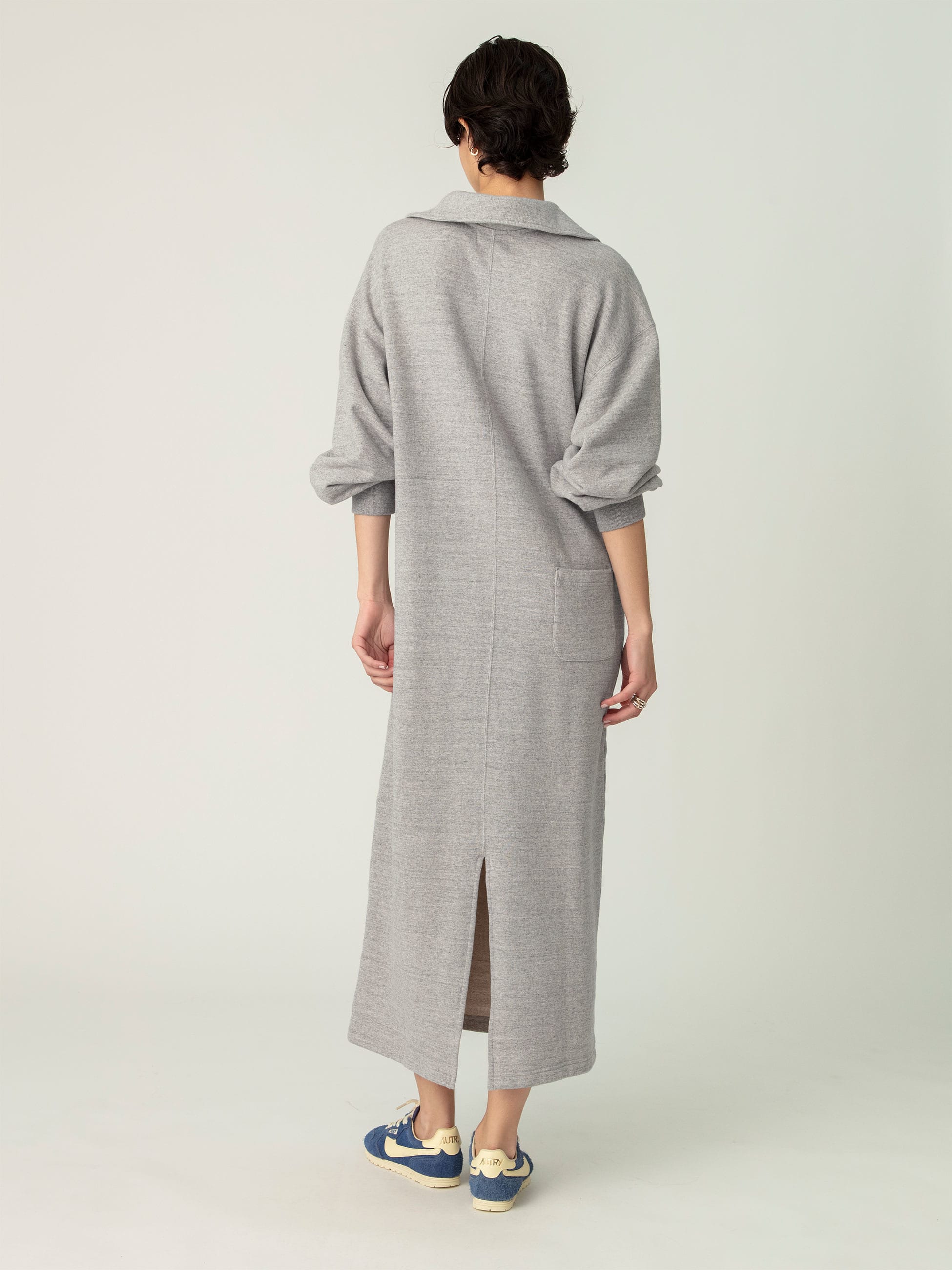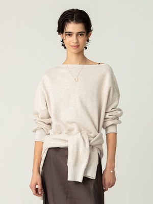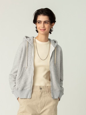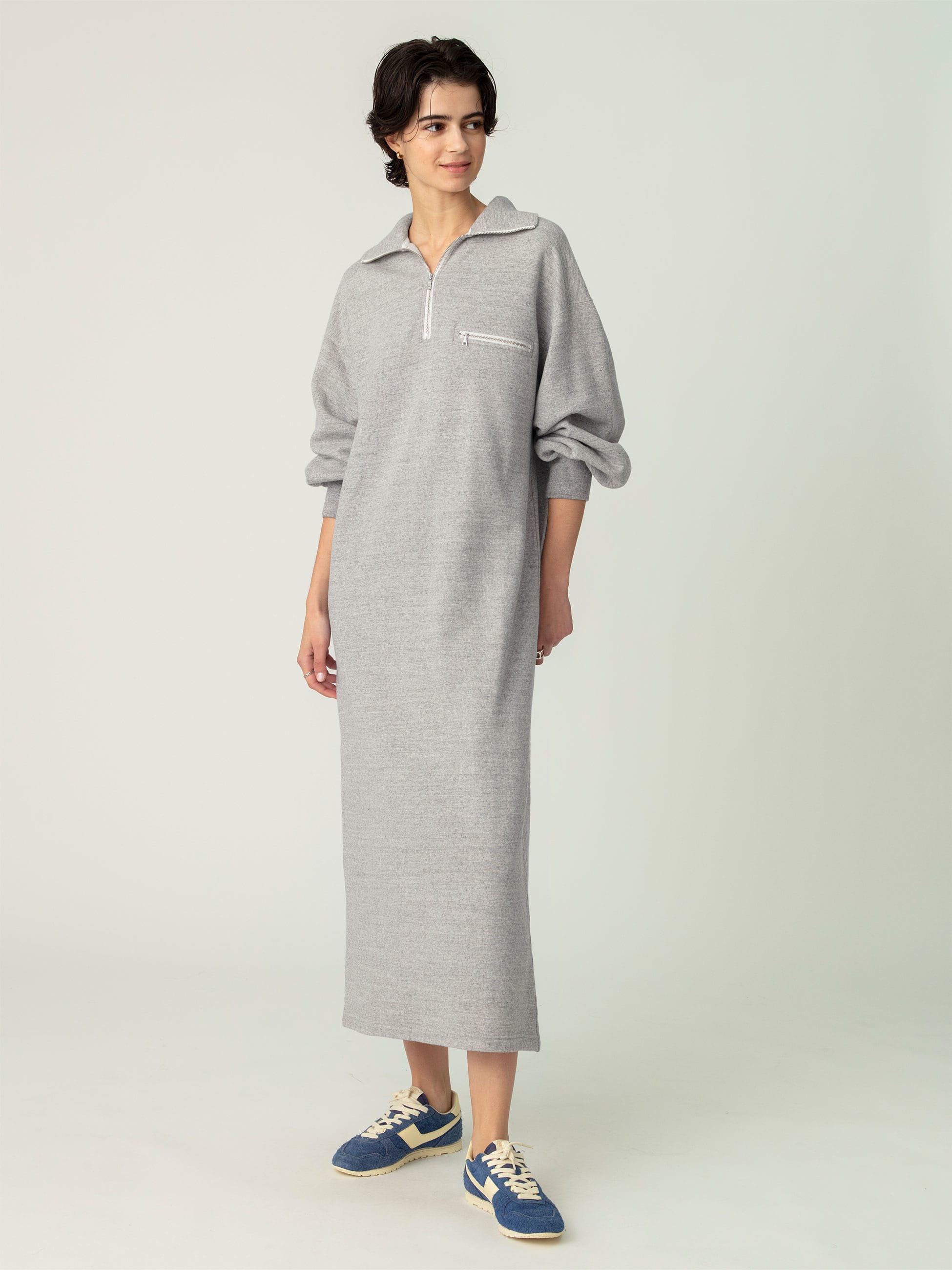 - リラックスした着心地の裏毛素材のスウェットドレスは、洗い加工を施し、ビンテージ感のある柔らかな風合いです。フロントのハーフジップデザインがアクセントで、袖口のほどよいボリューム感が女性らしさを引き立てます。寒い時期はジップを開け、インナーに薄手の二ットやTシャツを重ねるのもおすすめです。
