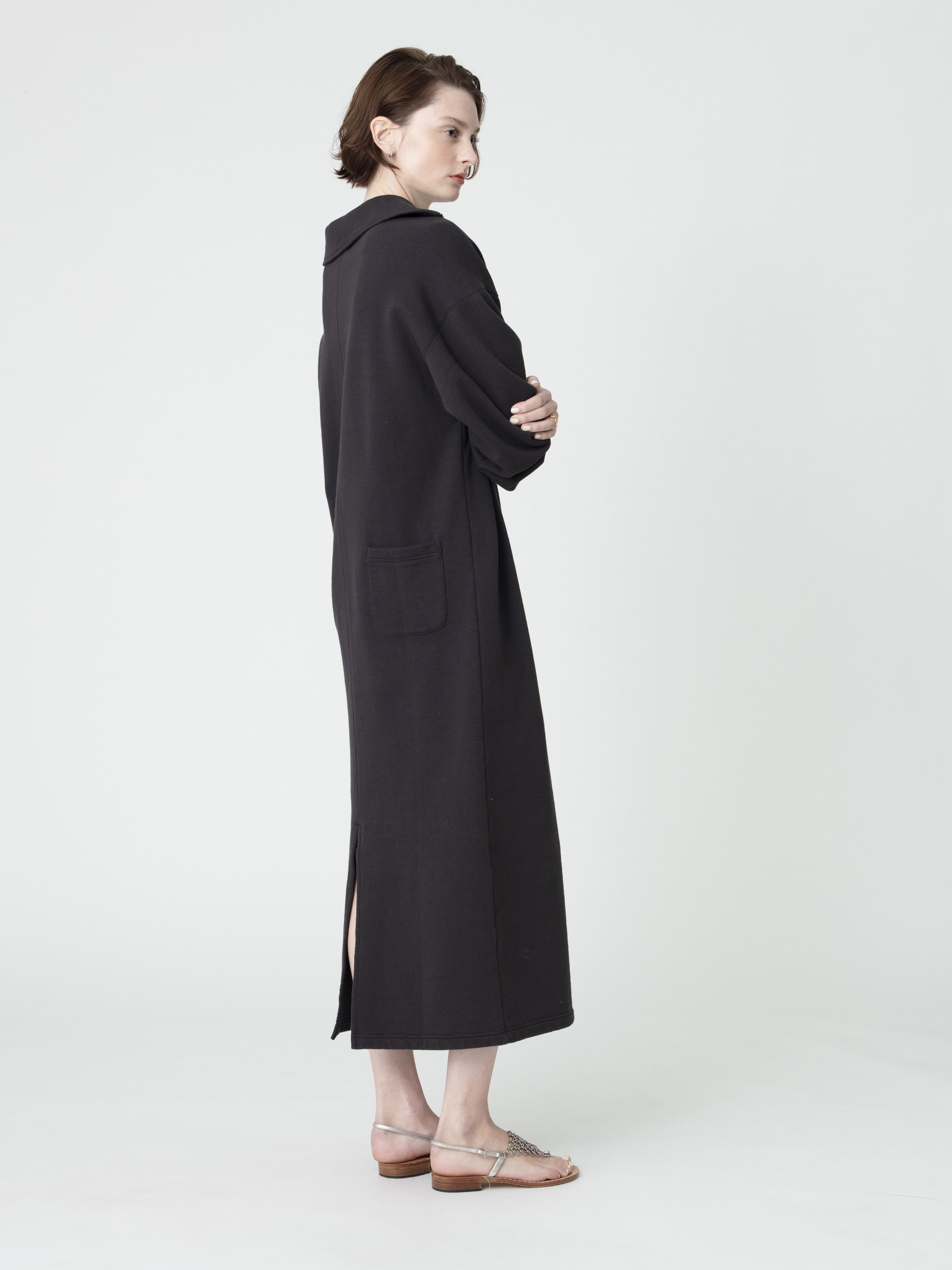 リラックスした着心地の裏毛素材のスウェットドレスは、洗い加工を施し、ビンテージ感のある柔らかな風合いです。フロントのハーフジップデザインがアクセントで、袖口のほどよいボリューム感が女性らしさを引き立てます。寒い時期はジップを開け、インナーに薄手の二ットやTシャツを重ねるのもおすすめです。