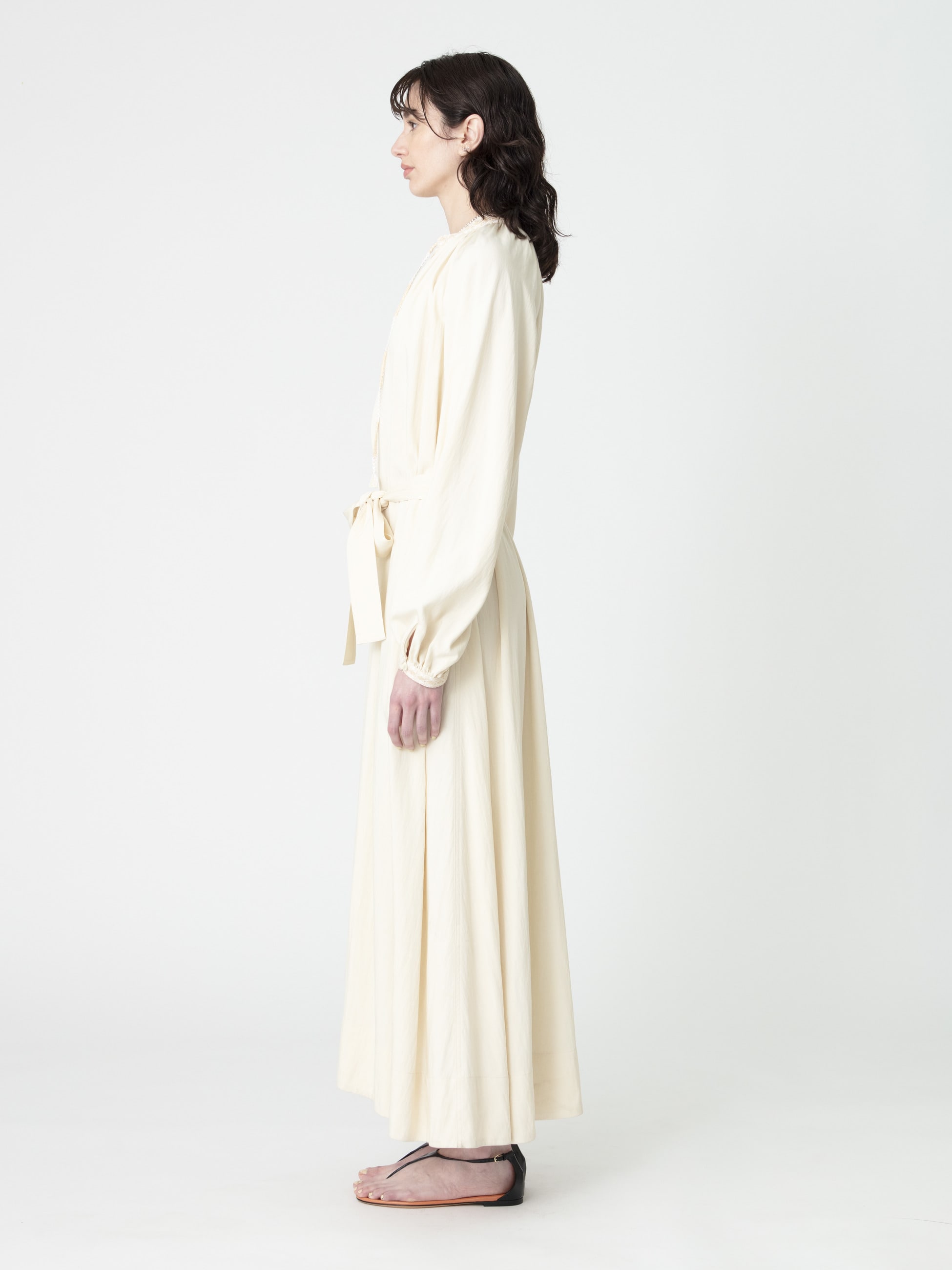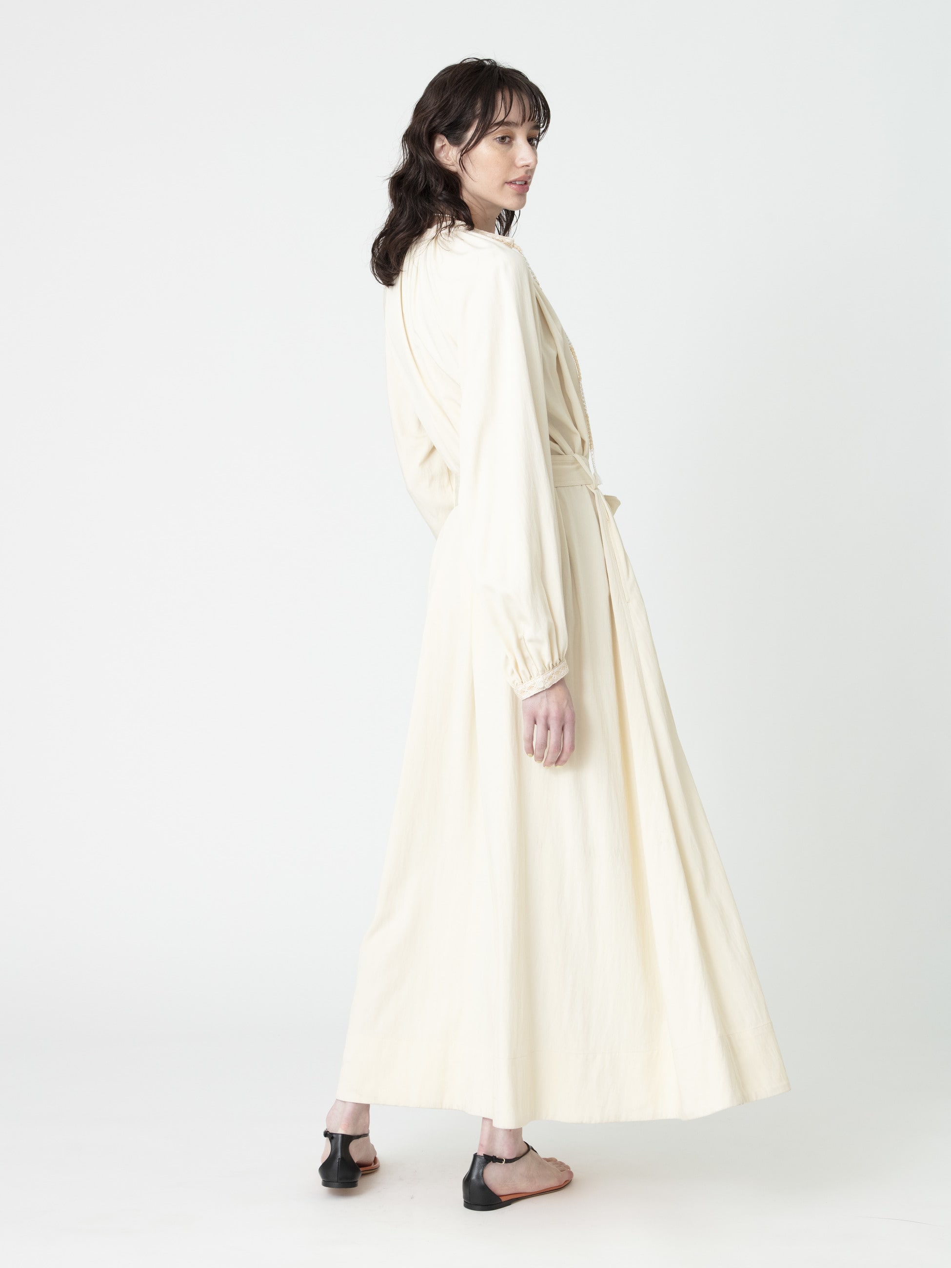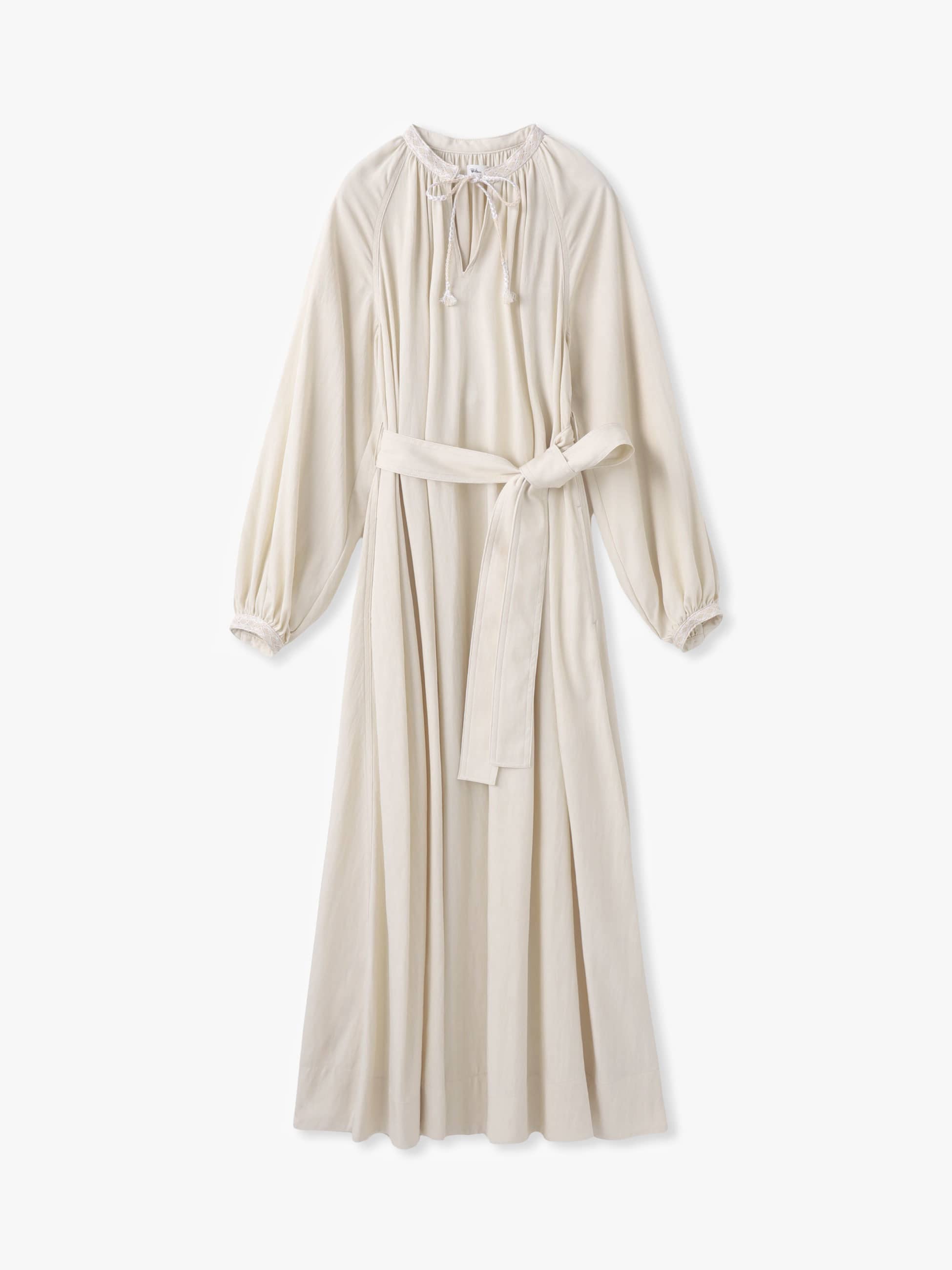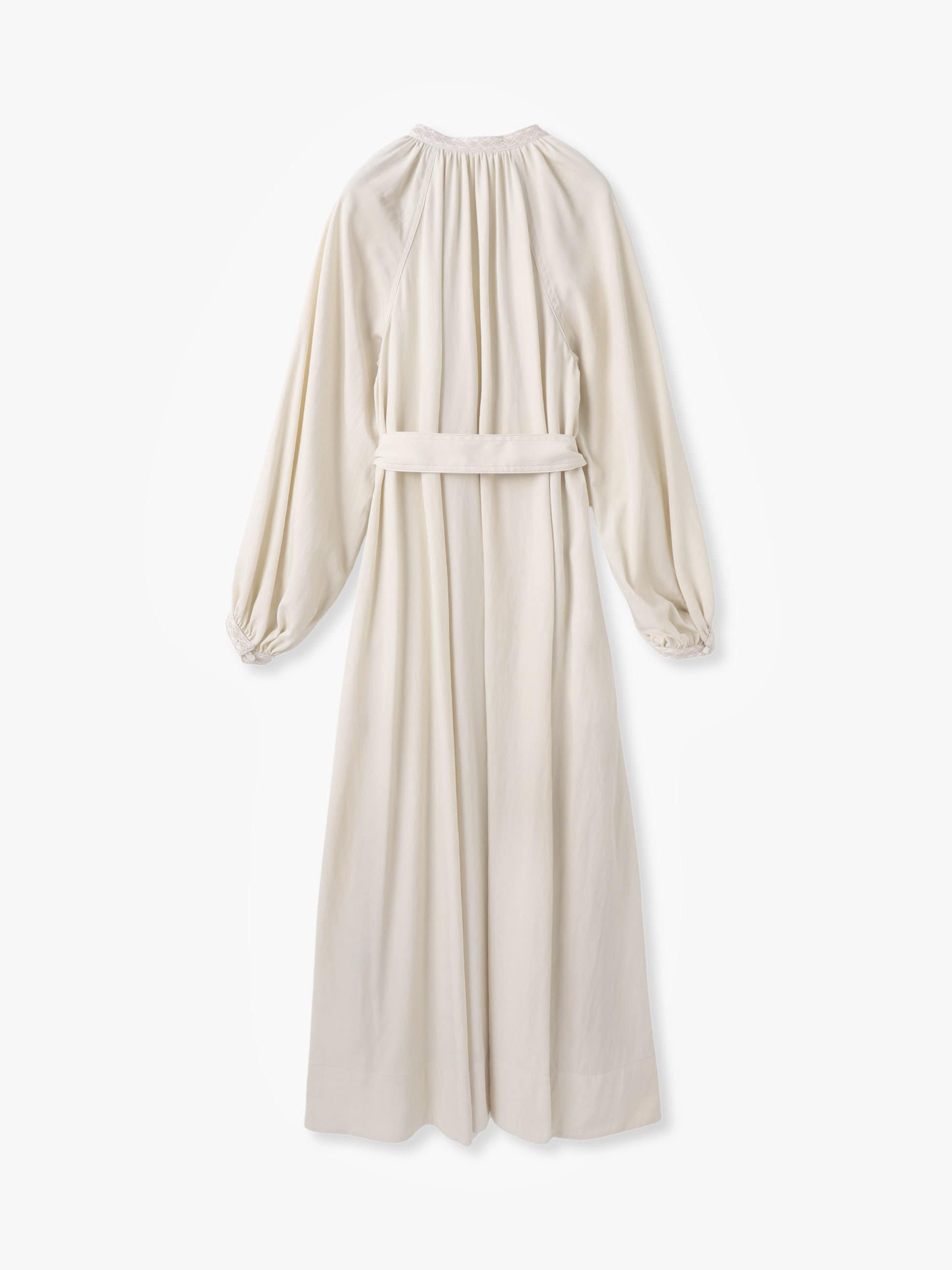- 着るだけでドラマティックなシルエットを描くロングドレスは、柔らかなアイボリーとブルーの配色がポイントとなったブラックの2色展開です。たっぷりとしたボリュームスリーブが女性らしく、付属のリボンベルトは取り外し可能で、シーンに合わせてシルエットの変化もお楽しみいただけます。衿元と袖口には、26SSシーズンのテーマである「LUCA」を螺旋で描いたレースや組紐をあしらった特別感のある1枚です。