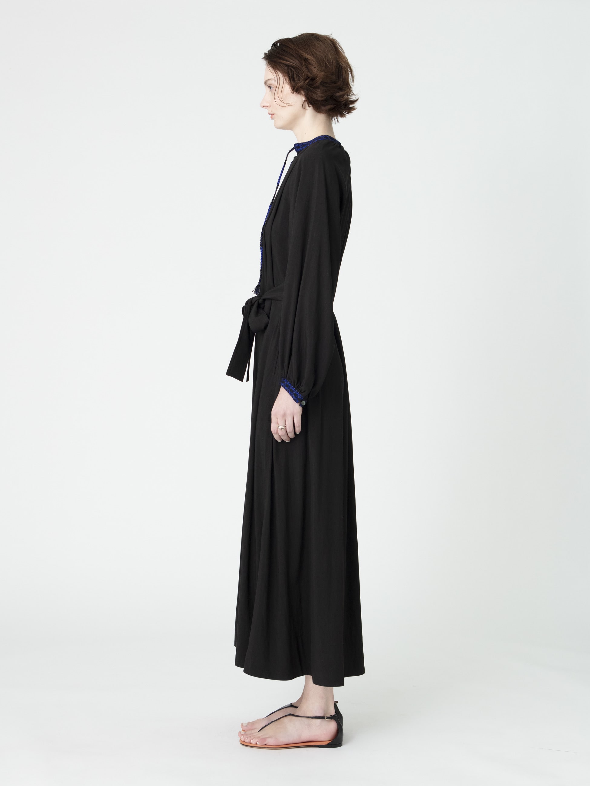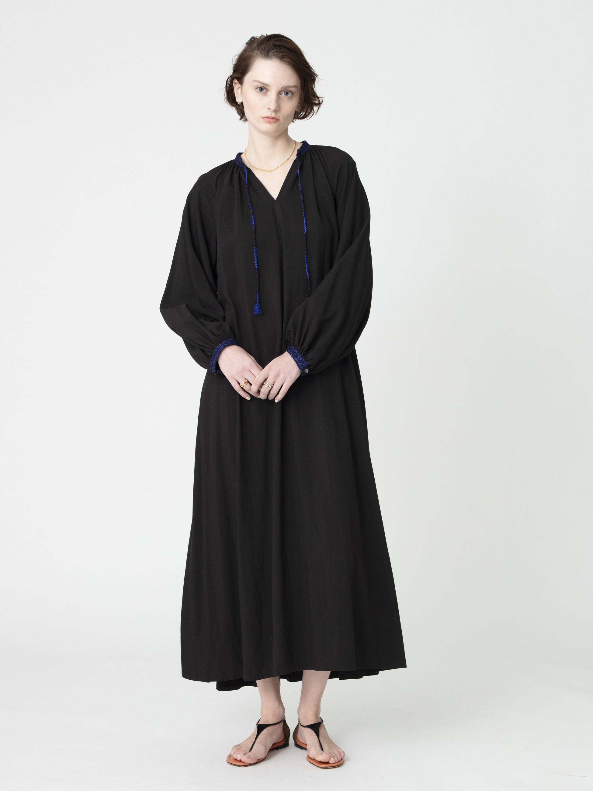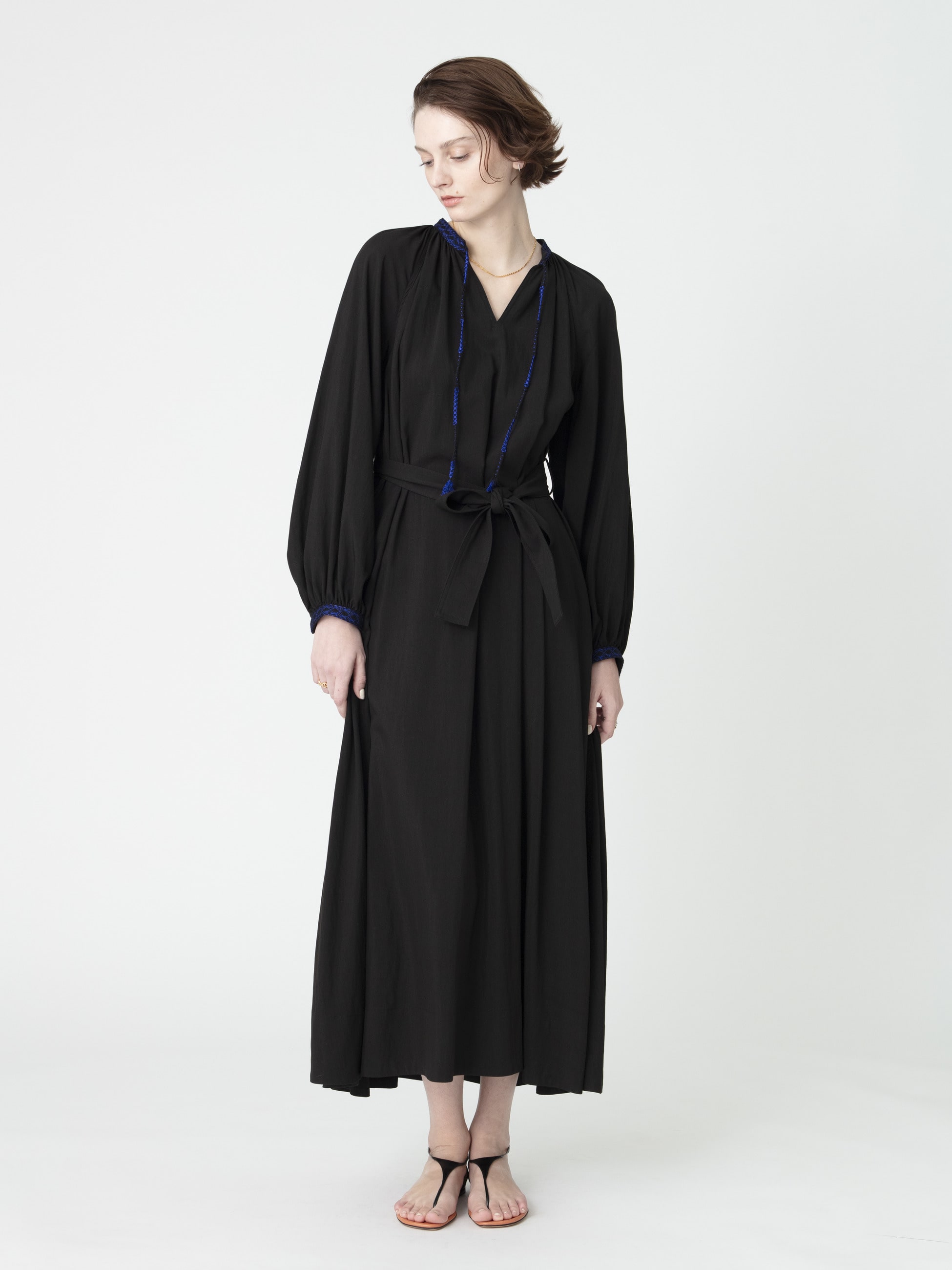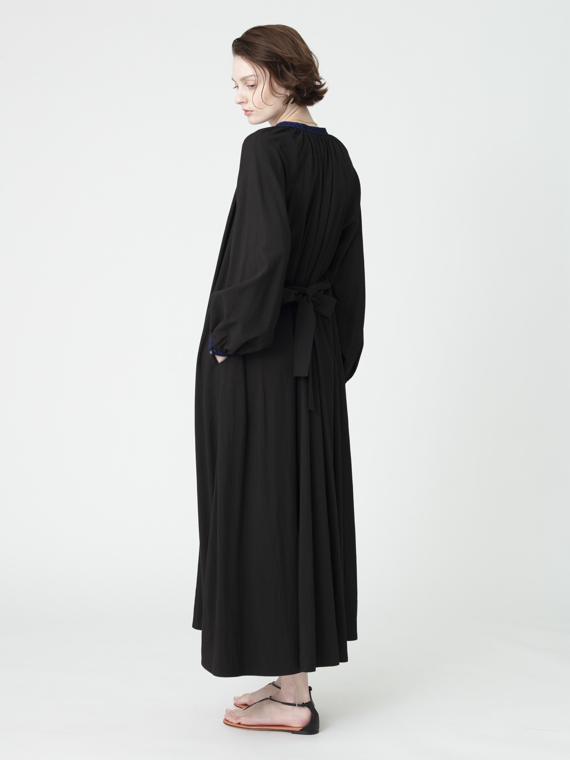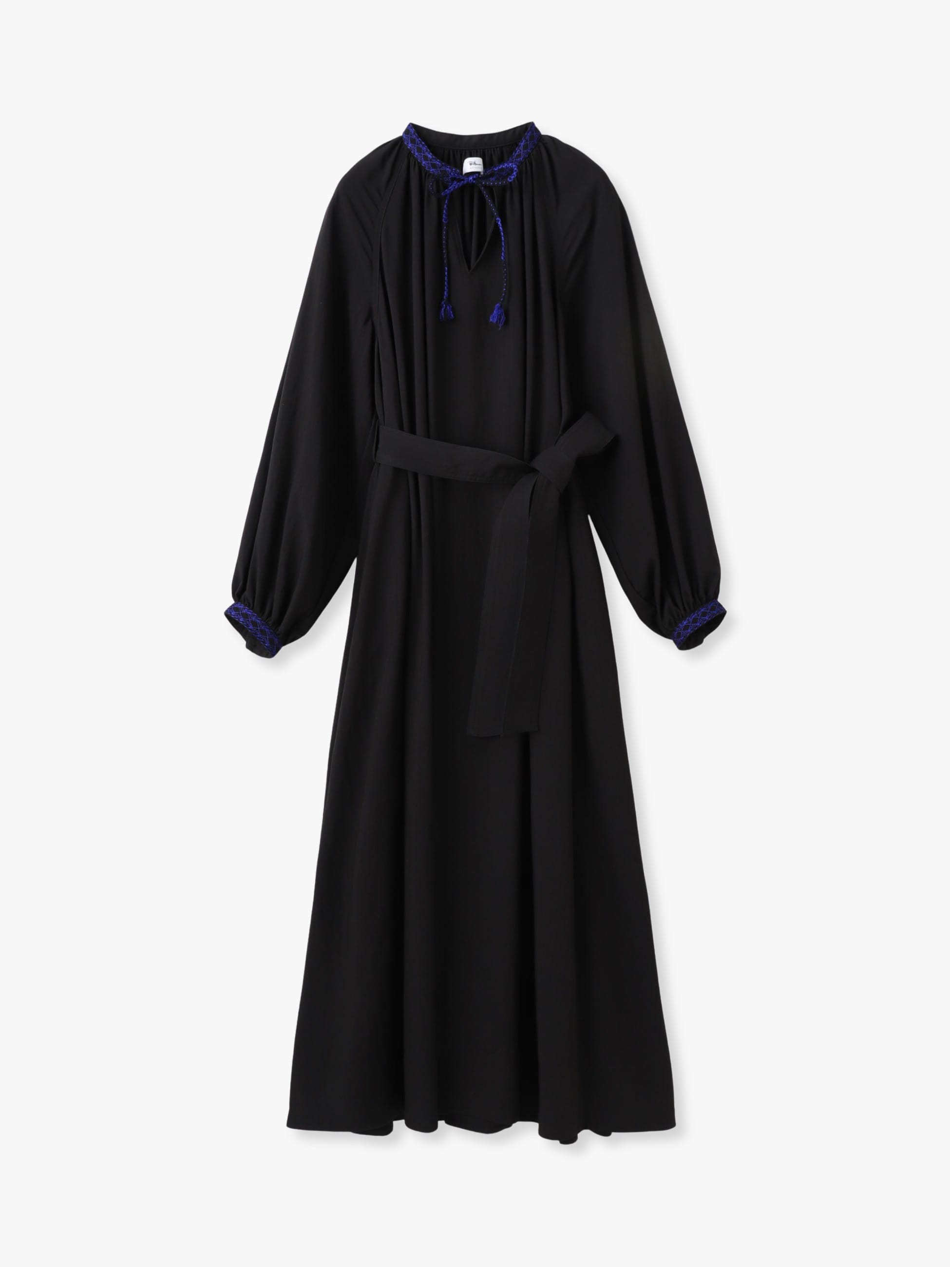 - 着るだけでドラマティックなシルエットを描くロングドレスは、柔らかなアイボリーとブルーの配色がポイントとなったブラックの2色展開です。たっぷりとしたボリュームスリーブが女性らしく、付属のリボンベルトは取り外し可能で、シーンに合わせてシルエットの変化もお楽しみいただけます。衿元と袖口には、26SSシーズンのテーマである「LUCA」を螺旋で描いたレースや組紐をあしらった特別感のある1枚です。