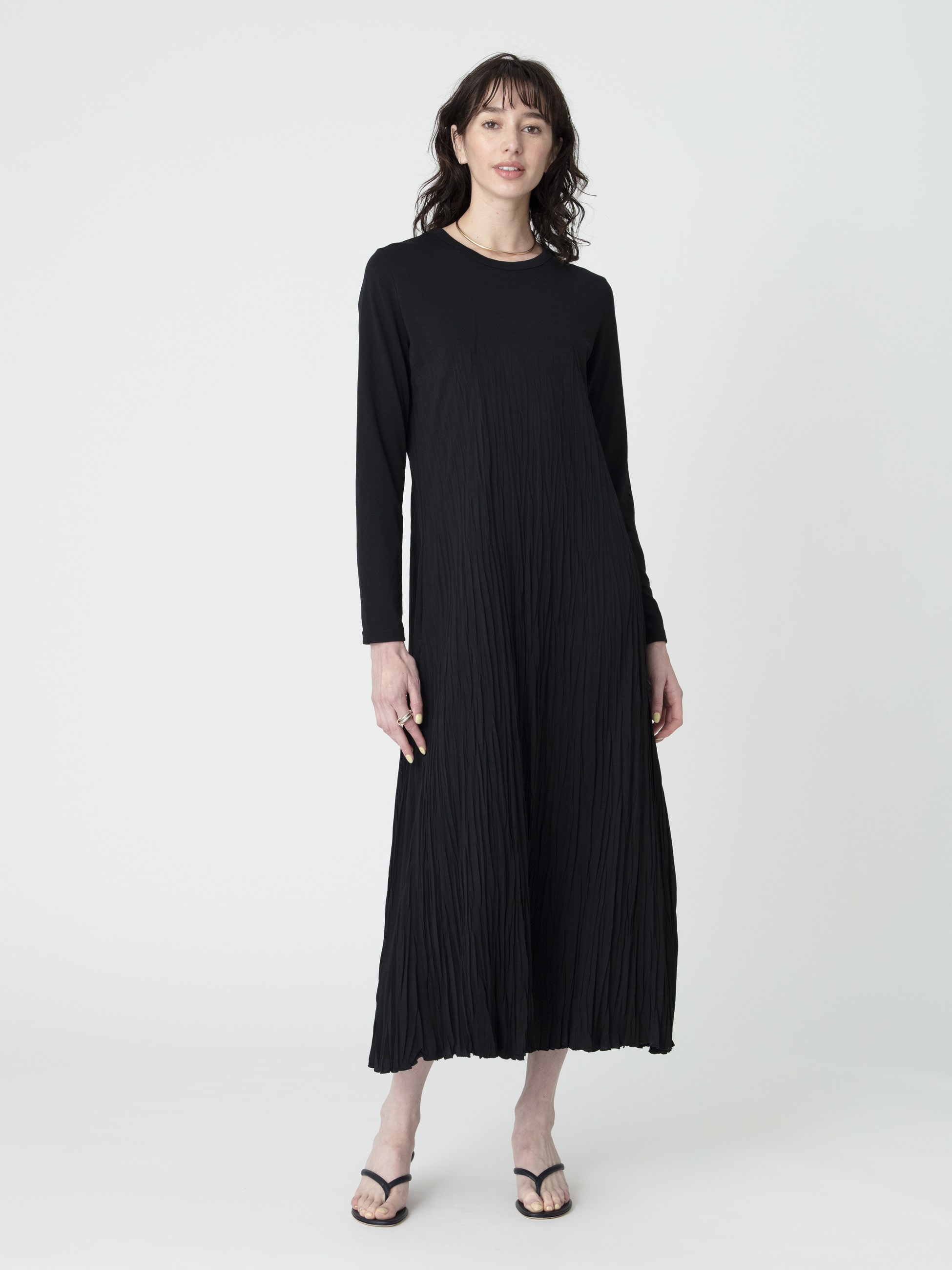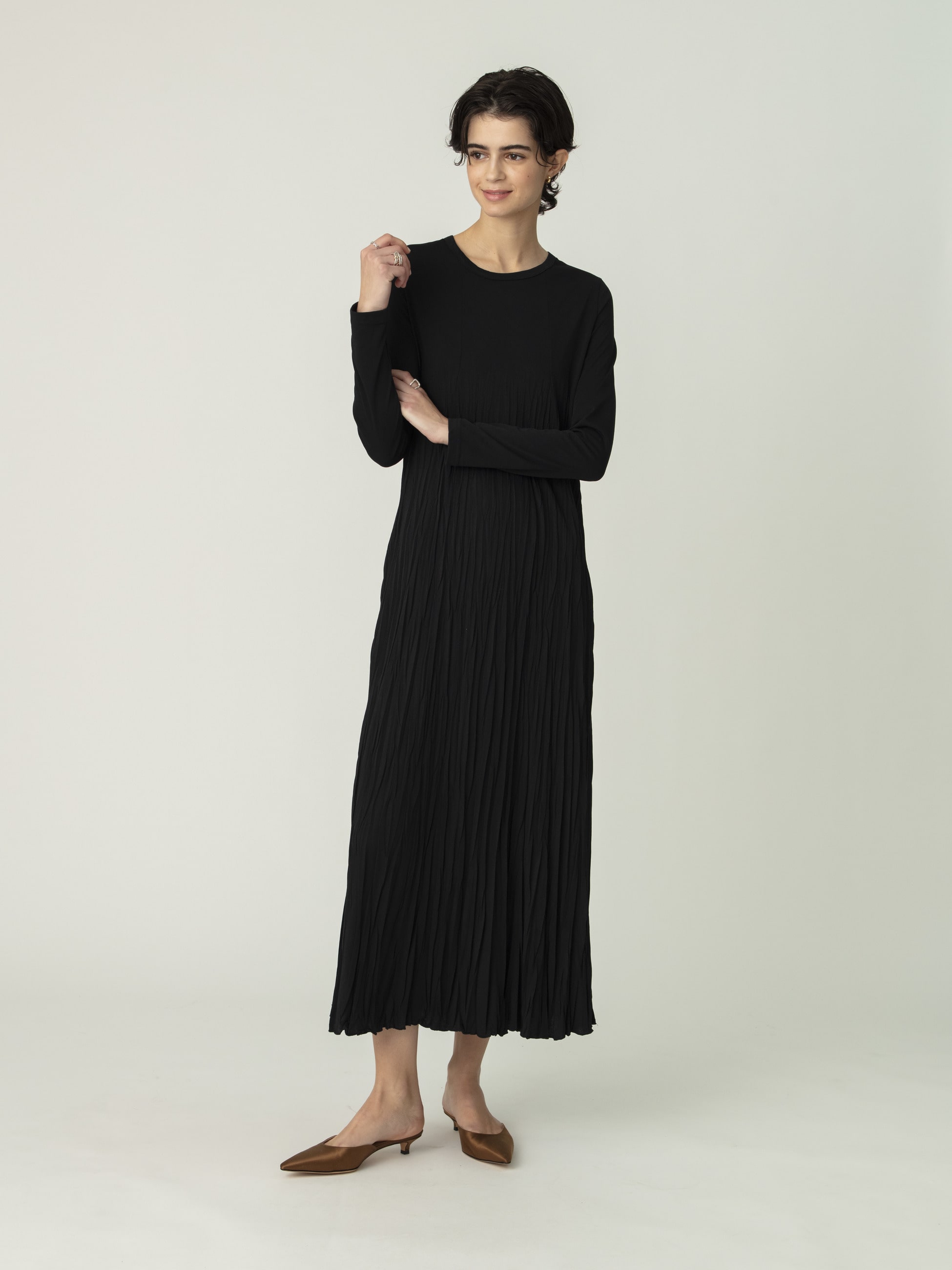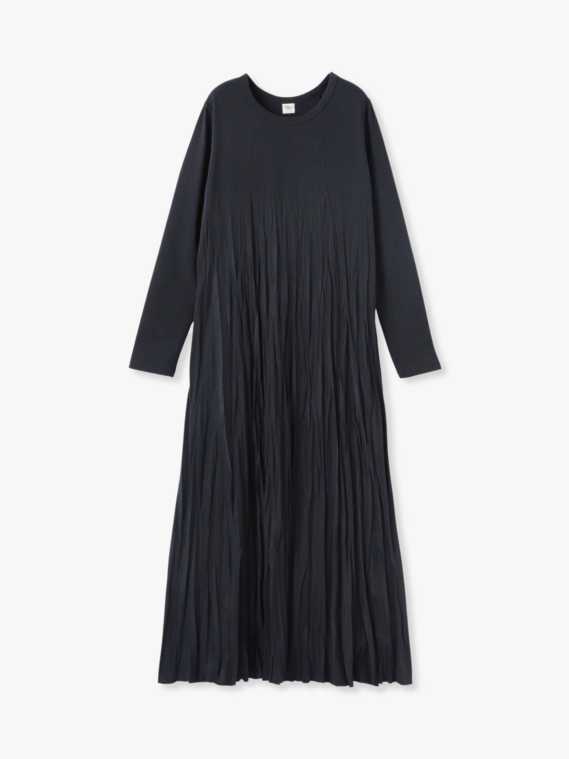毎シーズン人気のリンクルドレスから、柔らかなアイボリーと鮮やかなレッドが26SSシーズンの新色として登場です。リサイクルポリエステル素材を使用し、職人によって1点1点丁寧に施されたプリーツが特徴で、体のラインを拾い過ぎず1枚でさらっと着ていただけます。羽織りやジュエリーなどをレイヤードするとまた印象が変わり、カジュアルから綺麗めまでさまざまなスタイリングをお楽しみいただけます。