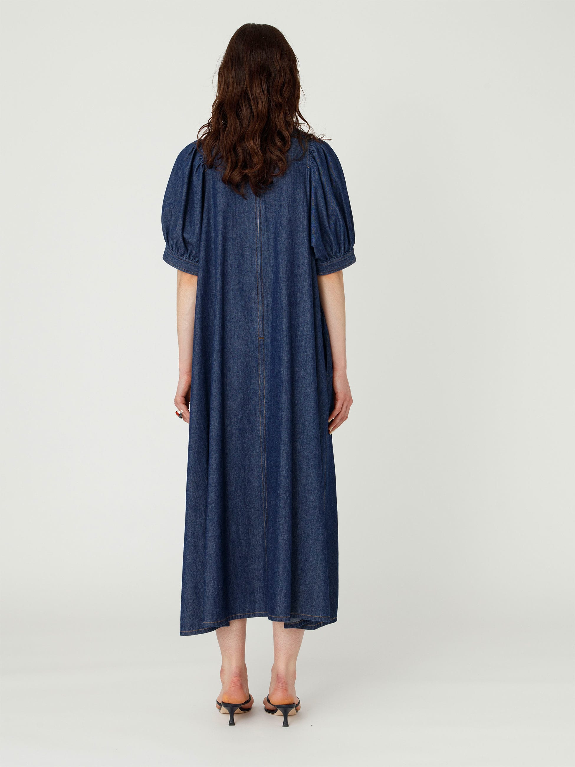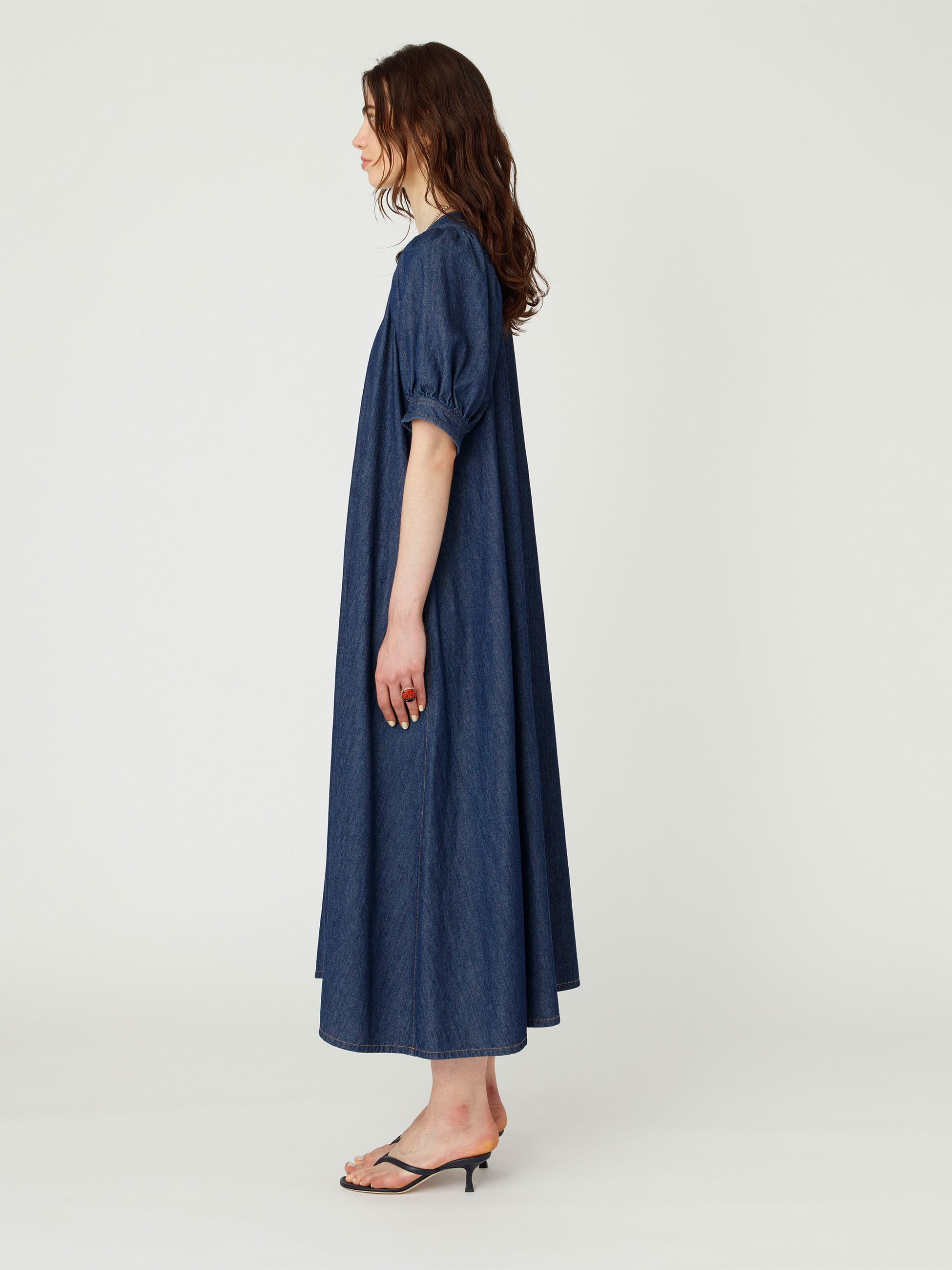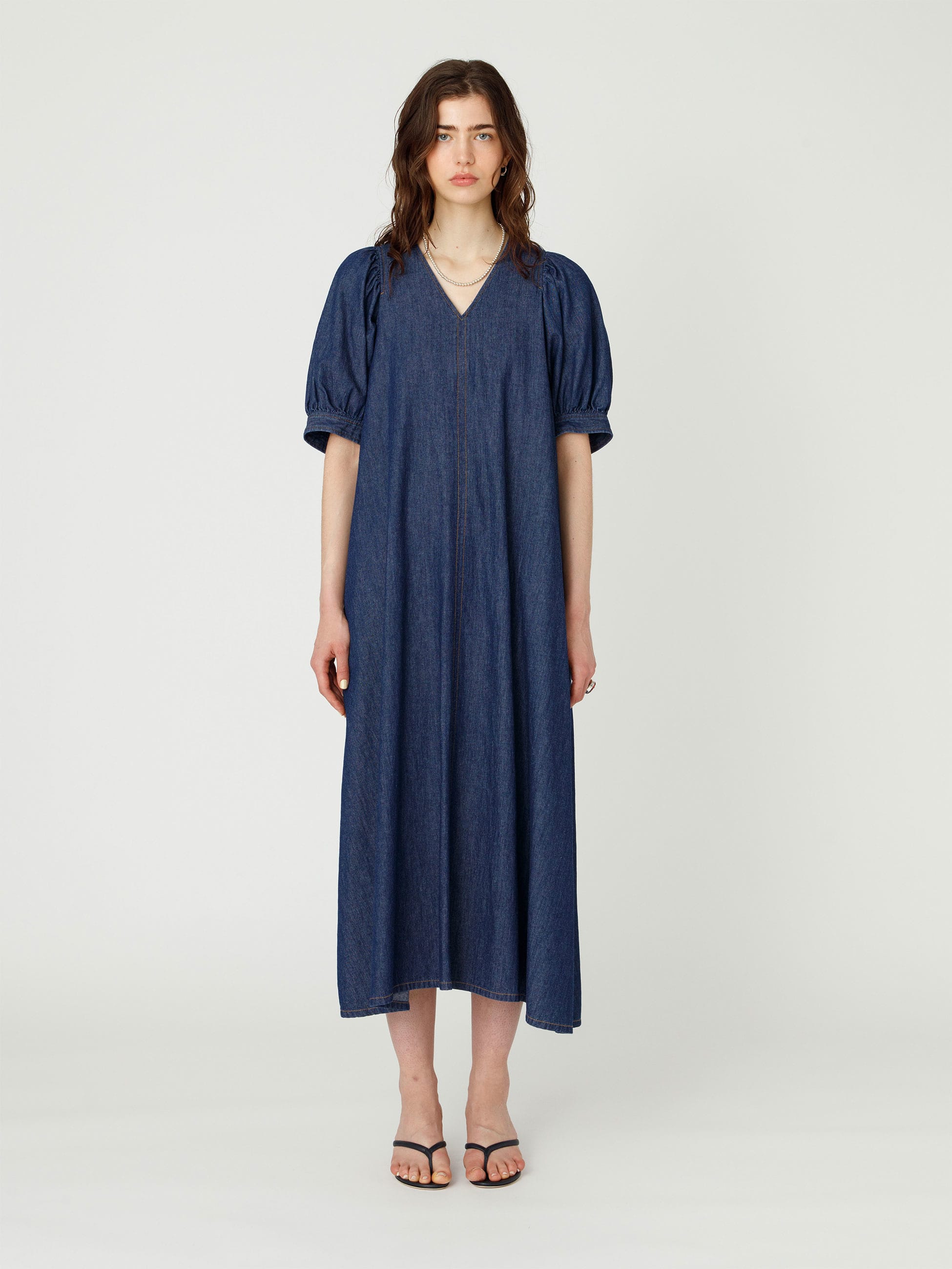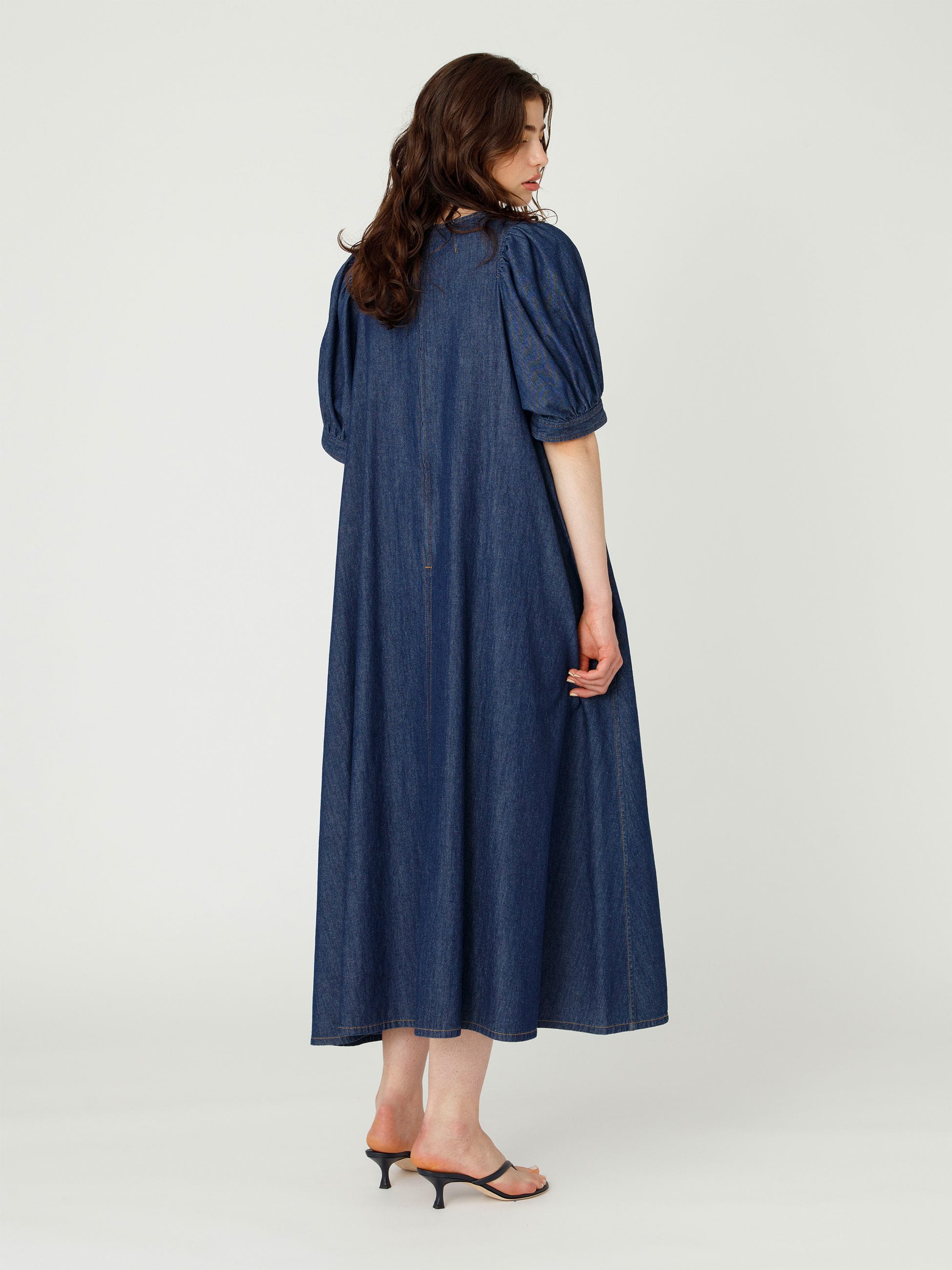 - 7オンスの柔らかく軽やかなデニム素材を使用したマキシドレスは、ドレープの効いた優美なシルエットが美しく、透け感を気にせずさらりと着ていただける一枚です。Vネックラインが女性らしく、二の腕が隠れる長めのパフスリーブも魅力的。クローゼットにあるとついつい手が伸びてしまう万能アイテムです。