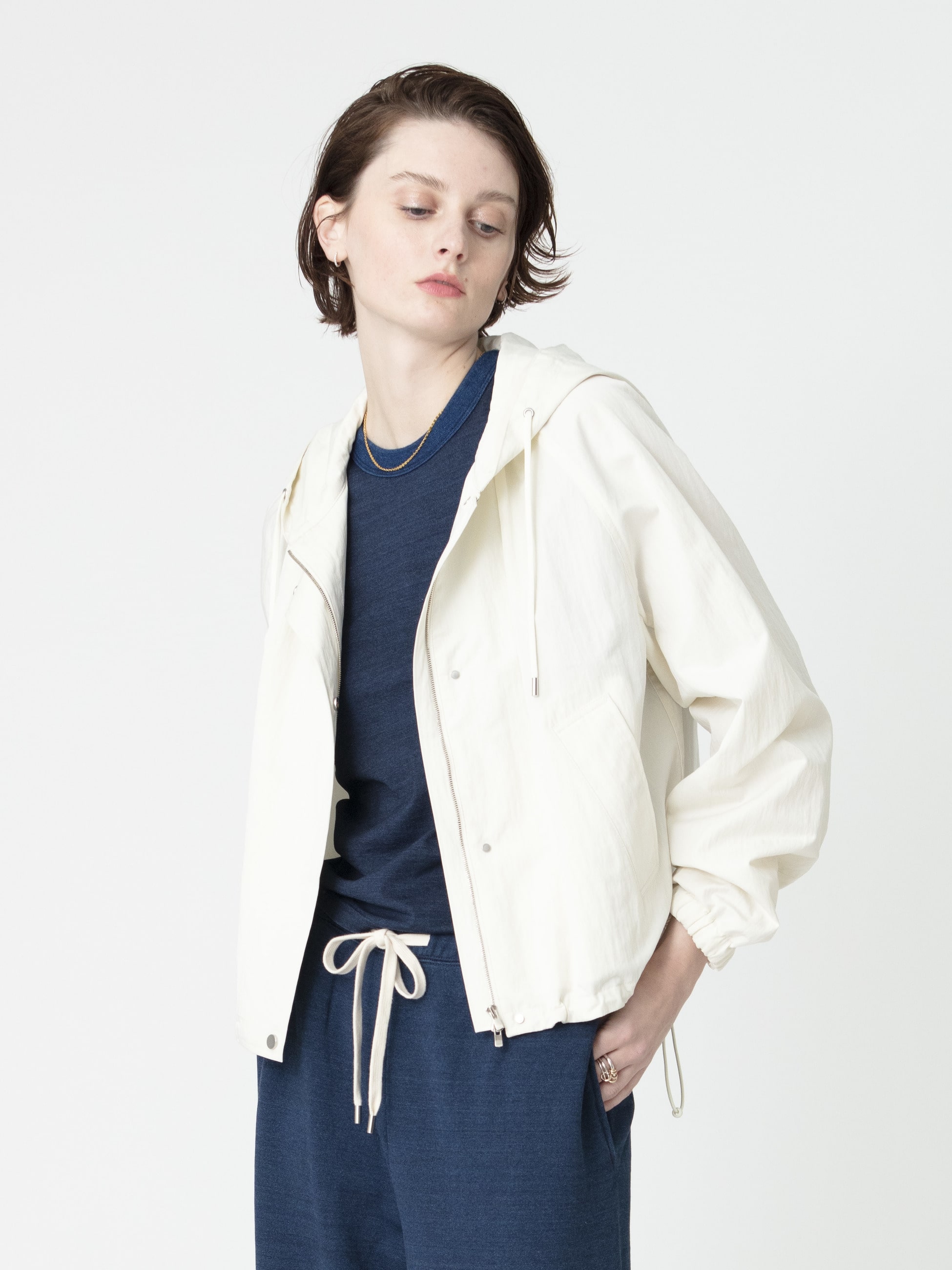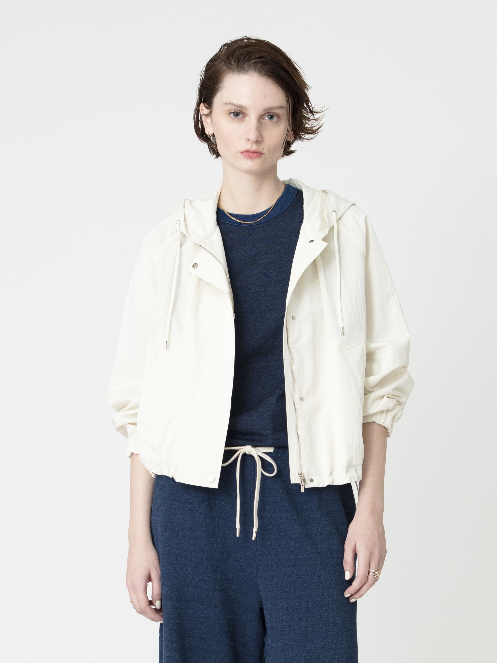 - コットンナイロンのさらっとした生地感が心地よく、春先の軽い羽織としても重宝するショートブルゾンです。襟ぐりにもギャザーを施し、女性らしいふんわりと丸みの帯びたシルエットを引き立たせる1着です。羽織るだけで、カジュアルながら大人な印象を演出します。同シリーズのギャザースカートや、イージーパンツの展開もございます。