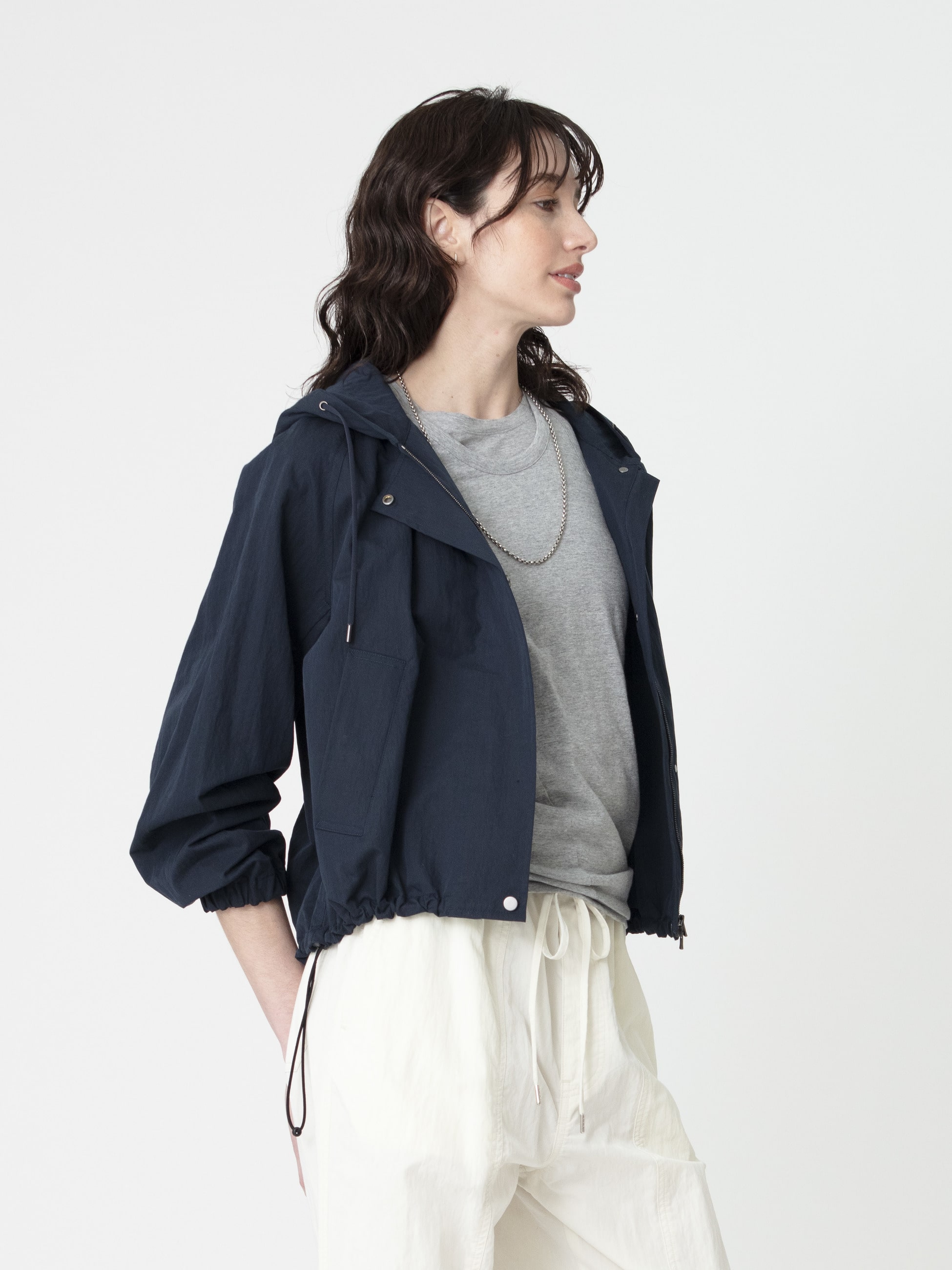 - コットンナイロンのさらっとした生地感が心地よく、春先の軽い羽織としても重宝するショートブルゾンです。襟ぐりにもギャザーを施し、女性らしいふんわりと丸みの帯びたシルエットを引き立たせる1着です。羽織るだけで、カジュアルながら大人な印象を演出します。同シリーズのギャザースカートや、イージーパンツの展開もございます。